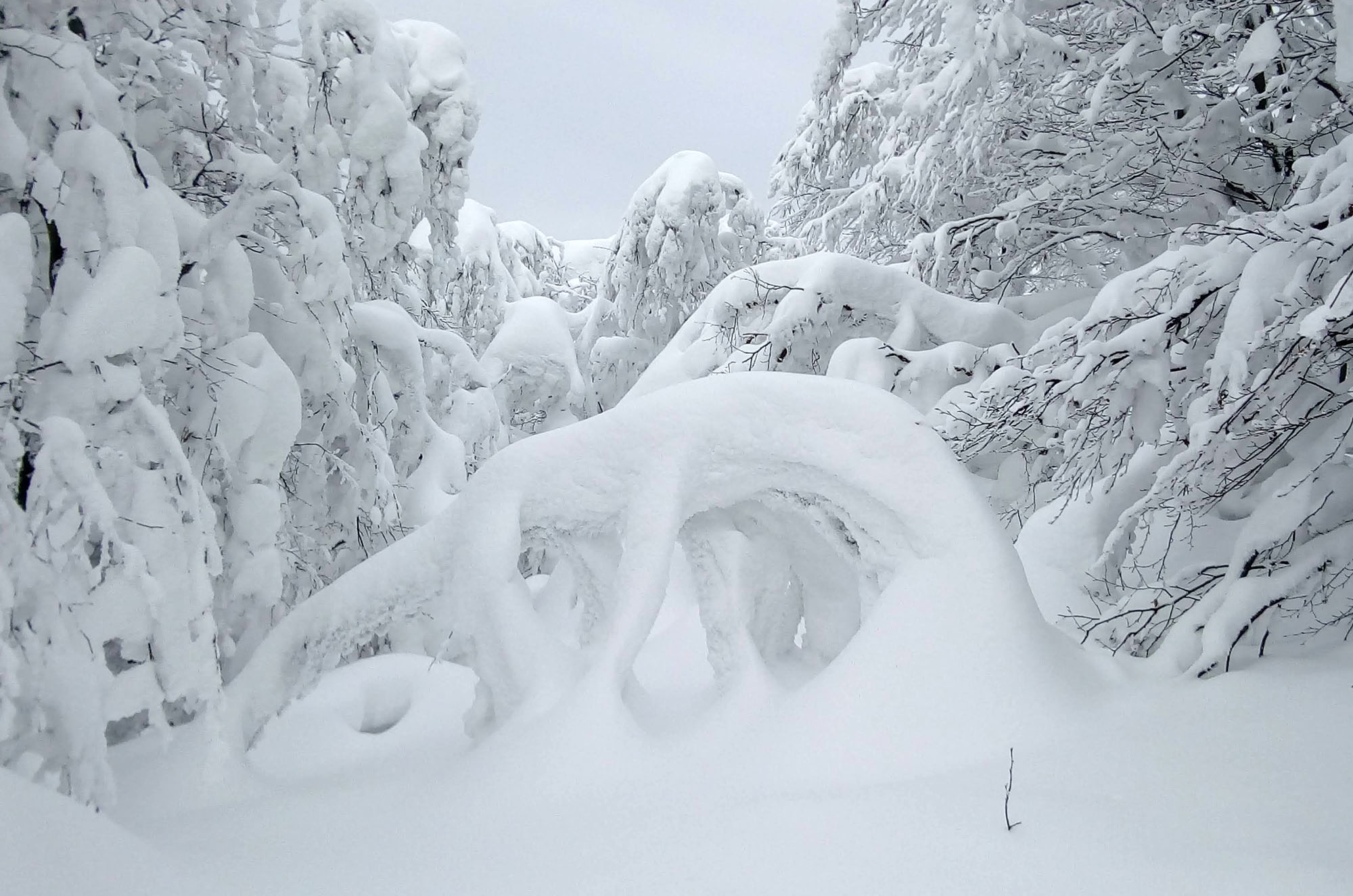 Dva metre snehu dokonale zakryli okolité lesy zapísané v UNESCO, všetko okrem kamenného stĺpu a orientačných tabuliek. Aby toho nebolo málo, len pár km odtiaľ na ukrajinskej strane pri obci Kňahyňa v roku 1966 spadol 500 kg meteorit. Možno ako akýsi vesmírny pozdrav tomuto čarovnému miestu...