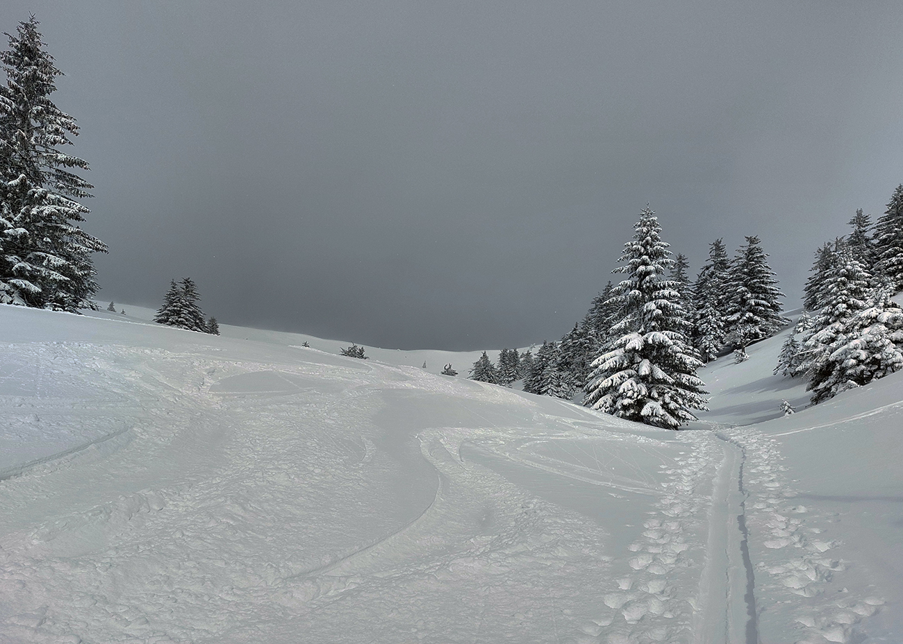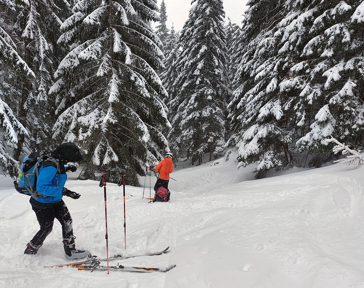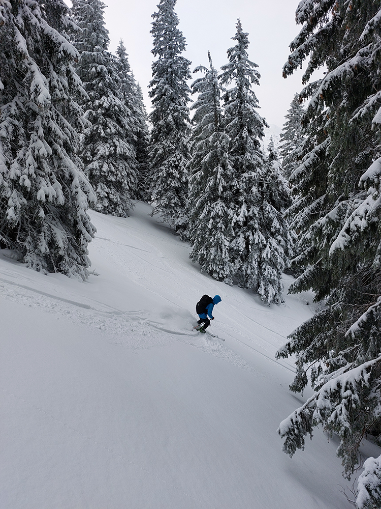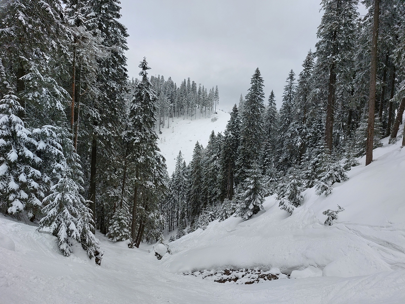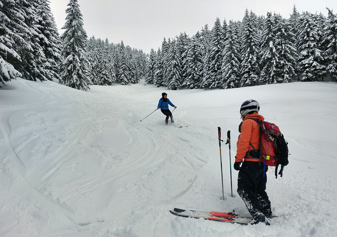 Cestou nazad sme sa vrhli pomedzi stromy do Turánskeho žľabu, ktorý už bol síce rozlyžovaný, ale práve medzi tými stromami to bolo takmer nepočmárané a každý si našiel tú svoju linku. Aj cez 20 cm prášku, paráda. Potom už len hore rúbaňou na vrchol Turánskeho a tie rúbaniská smerom k ceste na záver.