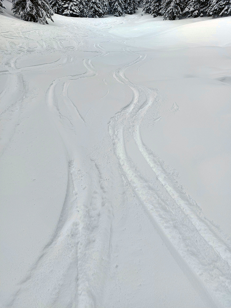 Na rúbaniskách vyššie už pekná biela zima, hneď na tom spodnom sa dali príjemné posledné oblúčiky potočiť pri odjazde. Na tom vyššom (z vrcholu Turánskeho dole na východ, na výstupovú stopu) to bola už úplná paráda, tiež na záver: takých 10 cm prášku.