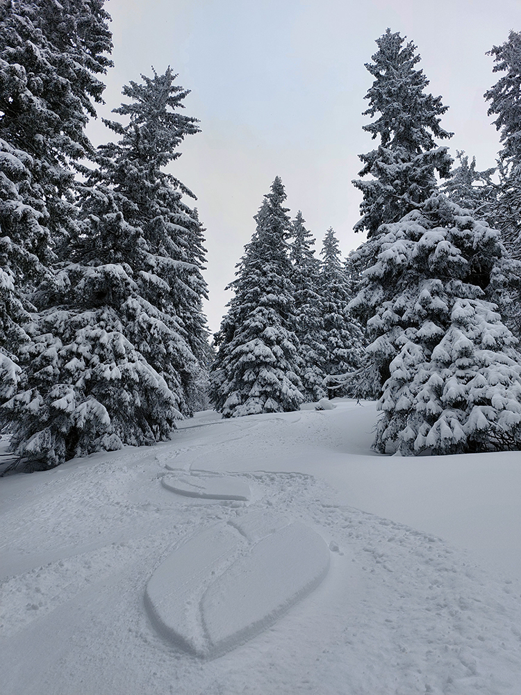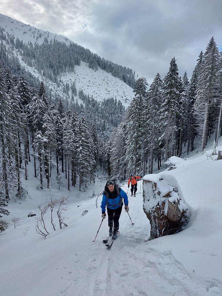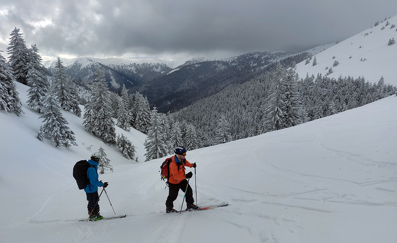 Ale pome od začiatku: v lese pod hrebeňom čistá paráda v prášku, nad lesom vetrom ubitá vrstva a hrebeň čistý, hrboľatý a zubatý firnový ľad. Stúpalo sa po tom čerstvom dobre, len v traverzoch nad lesom ak viacerí prešli, už sem – tam aj lyža podkĺzla na ľade, vo vydretej stope.