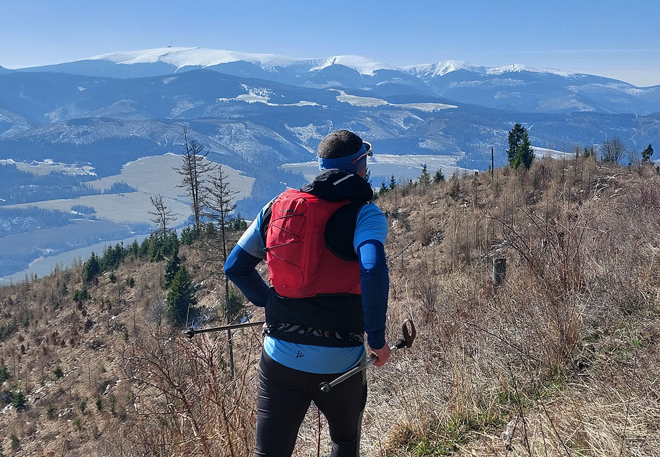 Hádam najkrajší úsek trate vedie potom väčšinovo cez lúky (a jasné, že sem – tam aj les) do Lopušnej doliny. Keď už telo nestíha, aspoň sa oči potešia širokým panorámam. Modrá obloha a biele kopce v plnej svietivej kráse na horizontoch v každom smere, to sa oplatilo aj občas zakopnúť. Sranda kontrast nad Lučivnou – bežci po suchej tráve a vedľa zjazdári na umeláku, každý po svojom si to užíval.