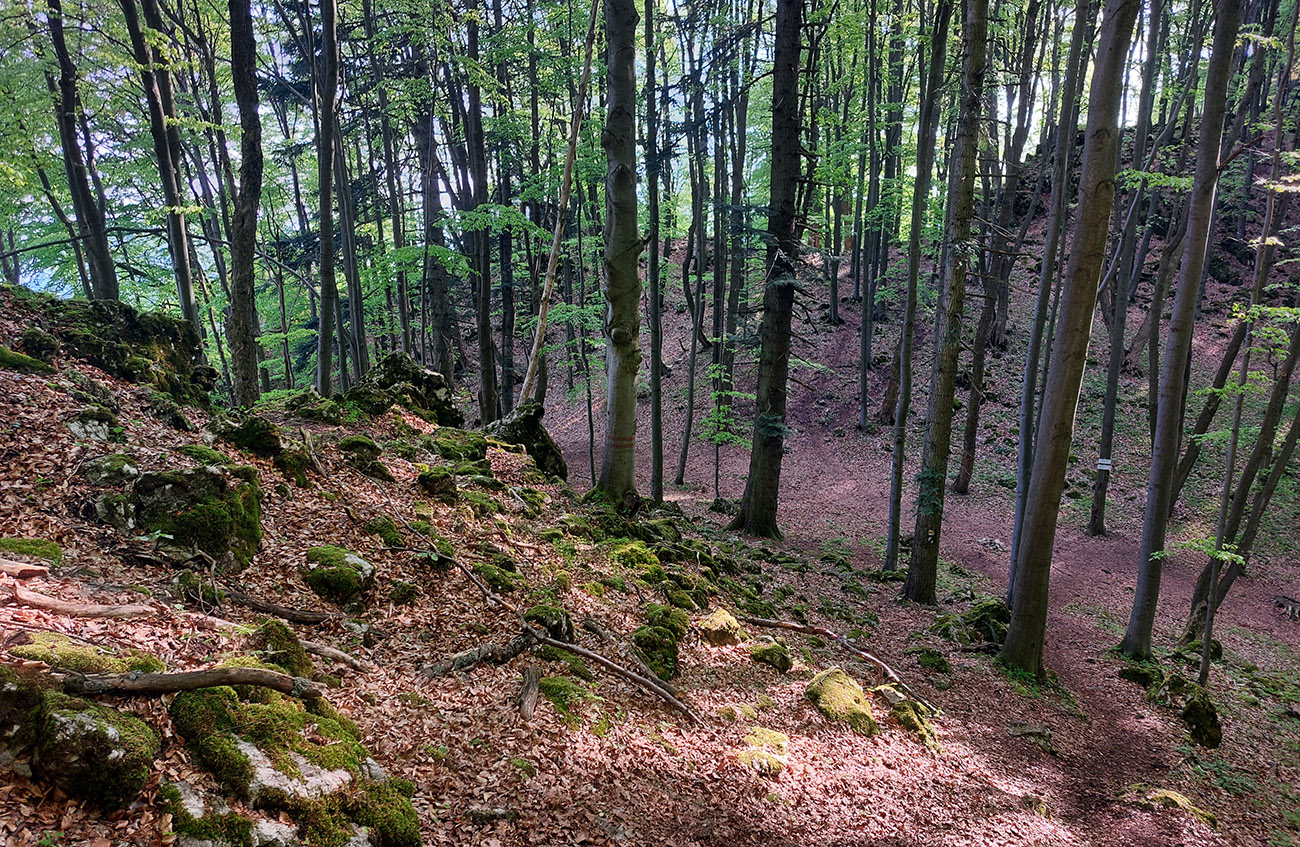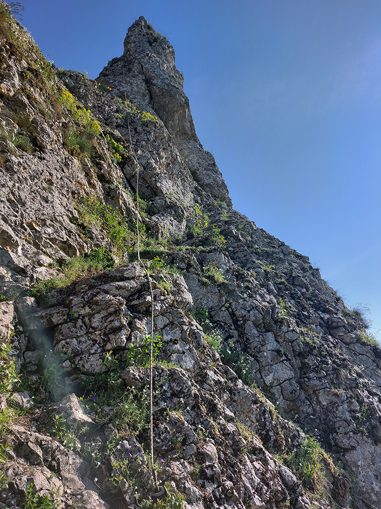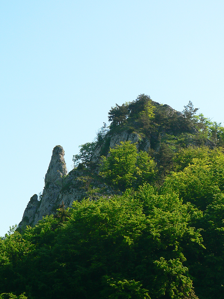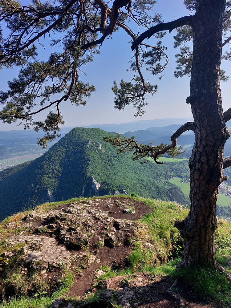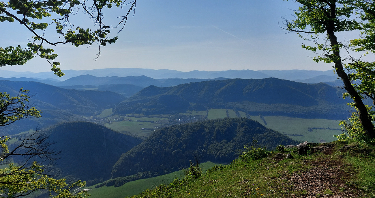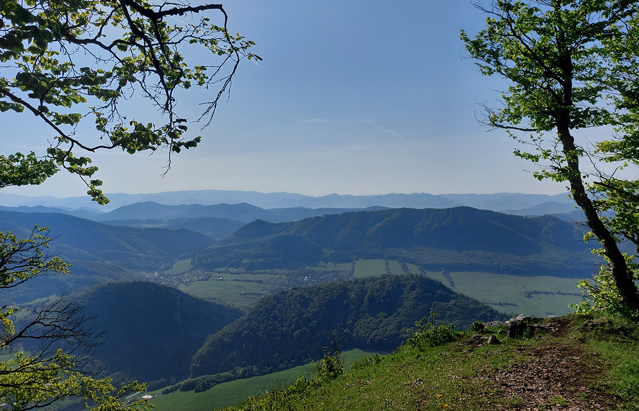 Takže najskôr za výhľadmi na Veľký Manín – samozrejme nie po asfalte po značke, ale z Teplej hore lúkami a napojenie priamo na žltú značku a jej serpentíny. Dal som si to poklusom – nebolo to rýchlejšie ako chôdza a ani efektívne, ale v rámci tréningu dobré. Povychutnával som skalné vyhliadky a ďaleké síce, ale už „tropicky“ zakalené pohľady. Aj na východ, kde v opare ledva sa dali rozoznať vysielače na Holiach.