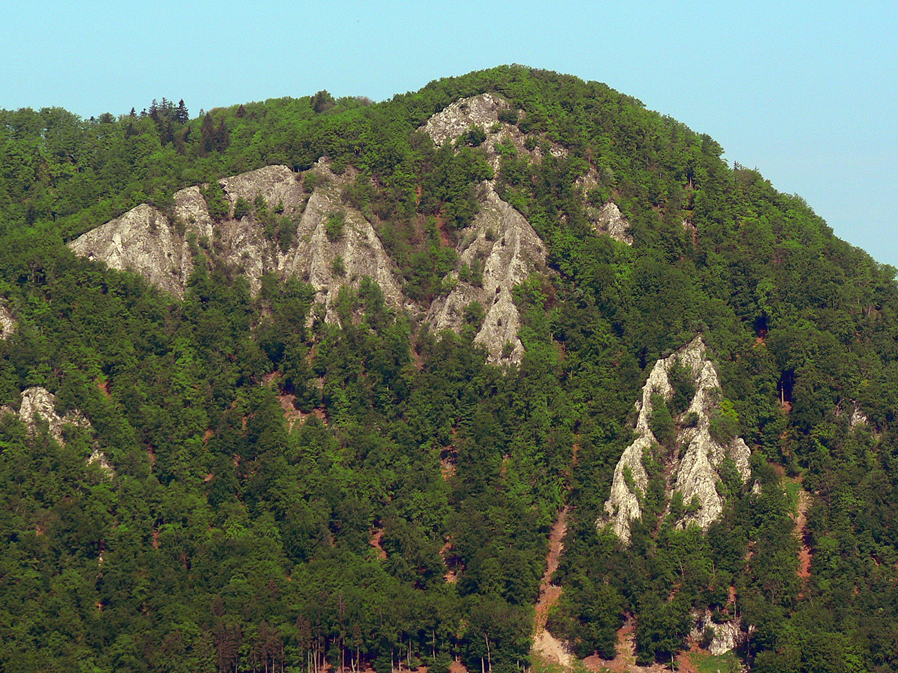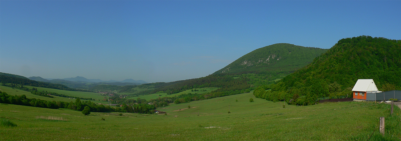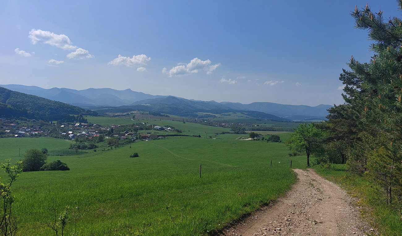 Výhľady potom na chvíľu skončili - po traverze lesnou cestou popod Ostrenec nasledovalo trochu asfaltovania cez Vrchteplú. Potom ale prevažne široké lúčno-lesné cesty po žltej značke skoro až do Rajca, a tam už nejaké tie výhľady boli zase. Napríklad na chvíľu aj na podstatnú časť hrebeňa Súľovských skál, alebo na druhú stranu, na zubatý horizont od Kľaku po Strážov.