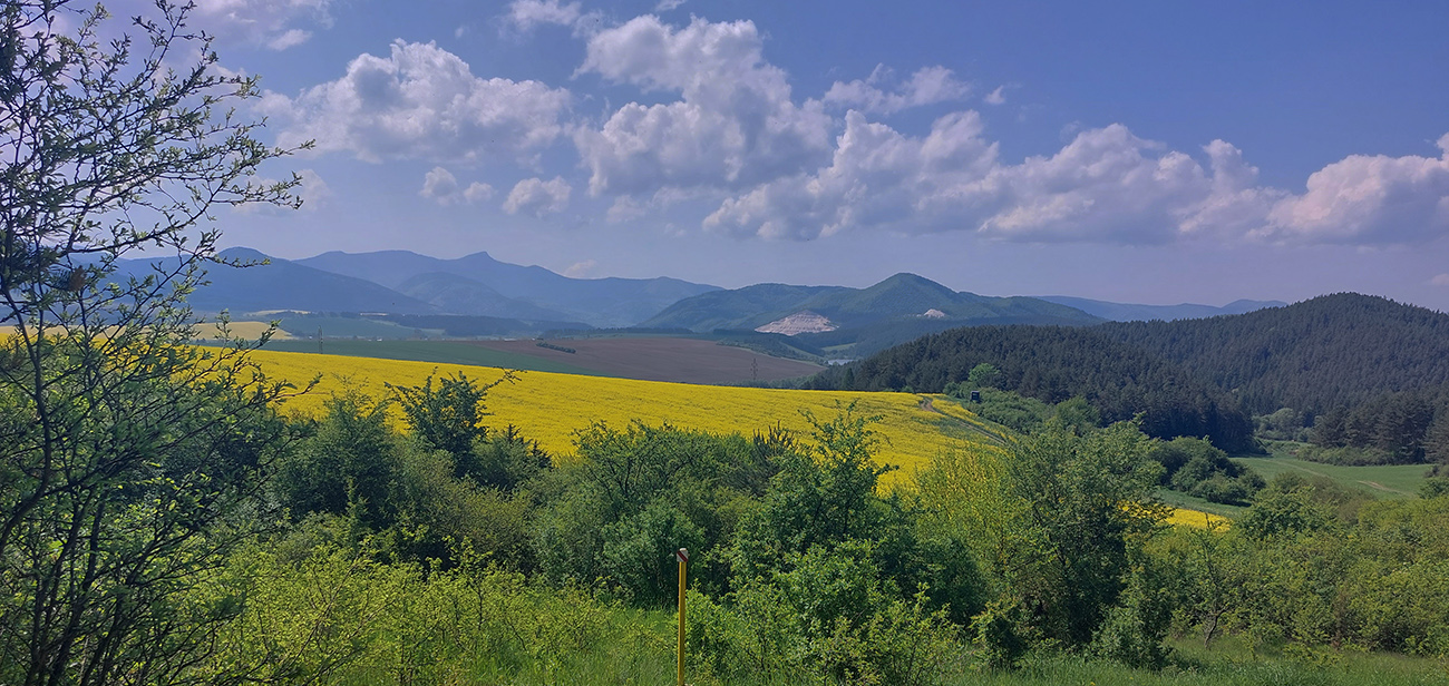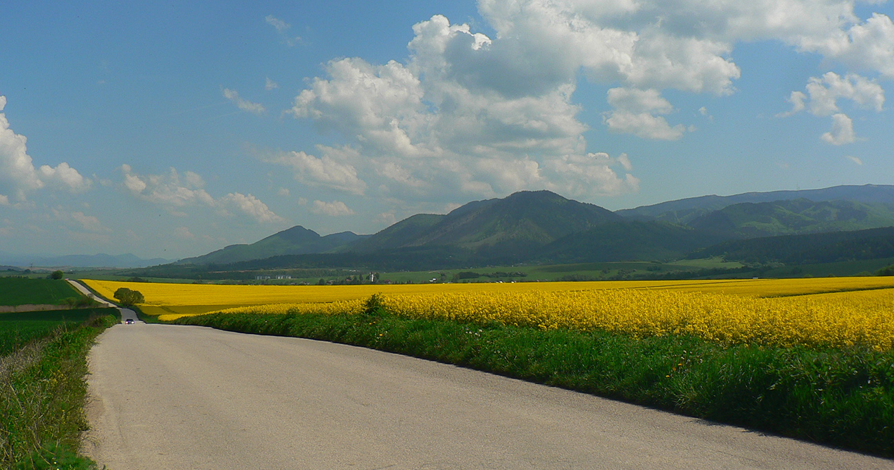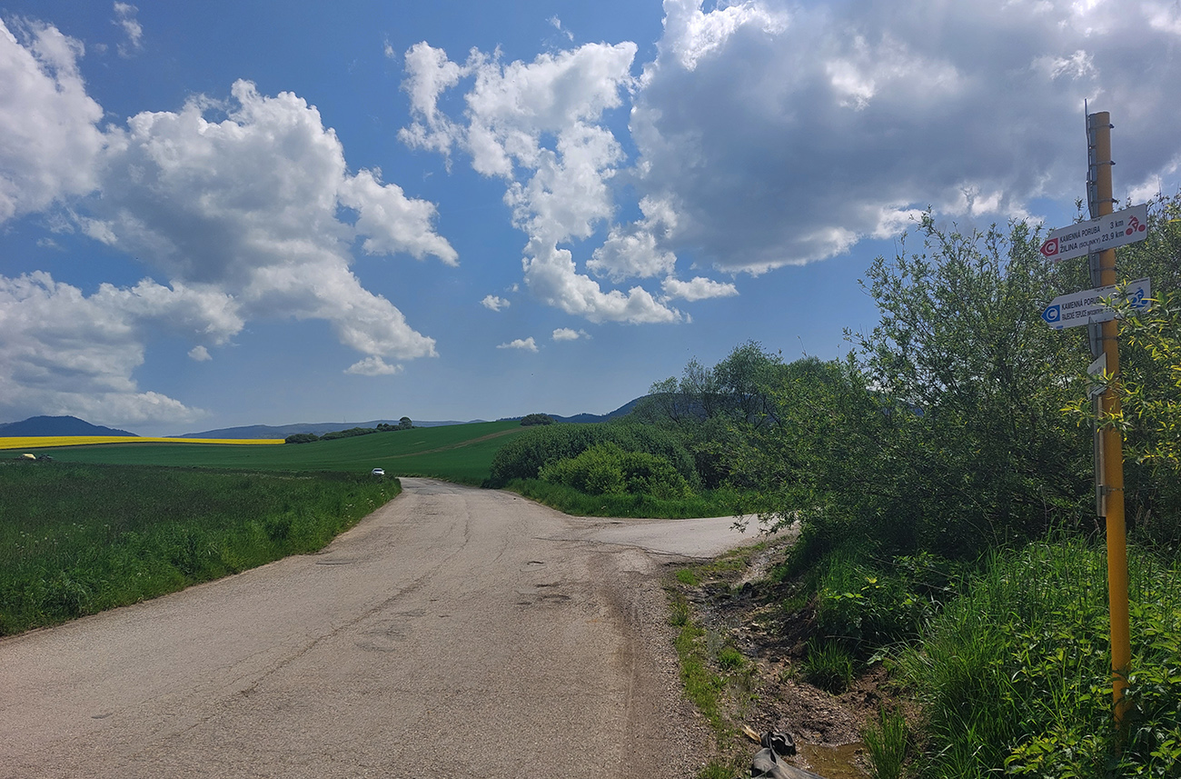 Lebo nejako som sa musel dostať cez kotlinu do Malej Fatry a najmenej bolestivý variant vyzeral byť cez Kamennú Porubu do Kuneradu, po cyklotrasách. Lebo odtiaľ som plánoval vyjsť po modrej priamo k vysielačom na Holiach, ešte som tade nikdy nešiel. Ale kým som sa ponoril do tieňa doliny, potrénoval som presne ten poludňajší mordor – slnko, asfalt, žiadny tieň ani vietor, horizonty v nekonečne... :-) No, až také zlé to zase nebolo, miestami aj rastúce mraky to dobiedzajúce slnko ukryli, ale asi viete čo myslím. Aj tá repka nejako protivne smrdela :