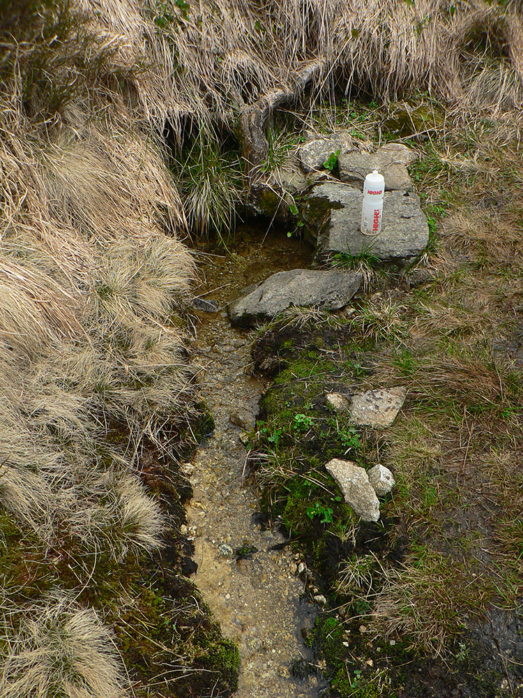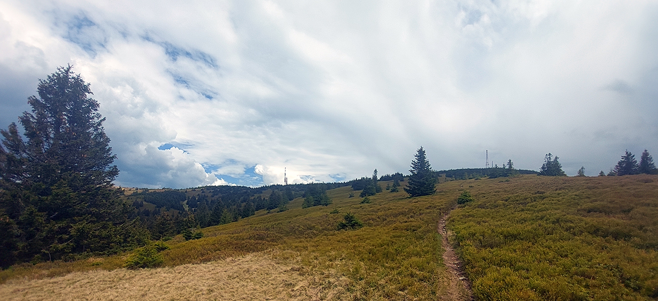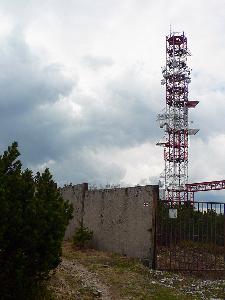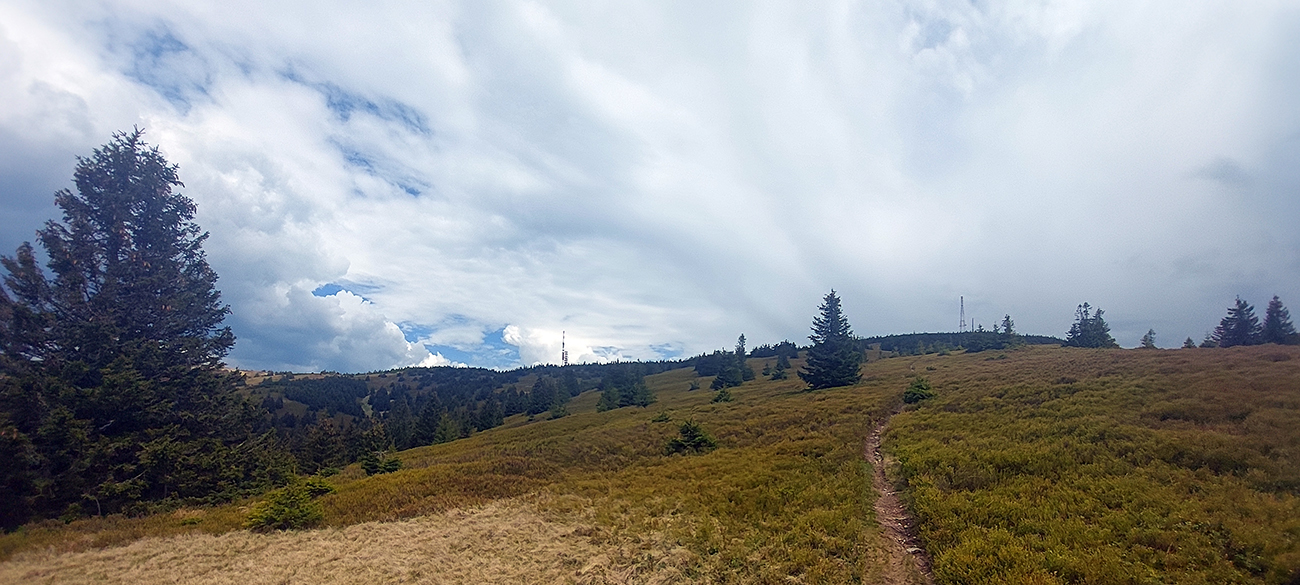 Ako som vyliezol nad les, už teplo nebolo – mraky všade a poriadne šľahačkovo našľahané, v diaľkach už aj sivé dažďové záclony viseli a od nich vial chladivý vietor. Až tak fajn. A ešte jedna studnička, priamo pod vysielačom, na zmytie potu. Hore potom len rýchle obzretie za prejdeným kusom krajiny a daváj švihom po hrebeni, že kam až po ňom dôjdem, kým ma nejaká búrka z neho nespláchne.
