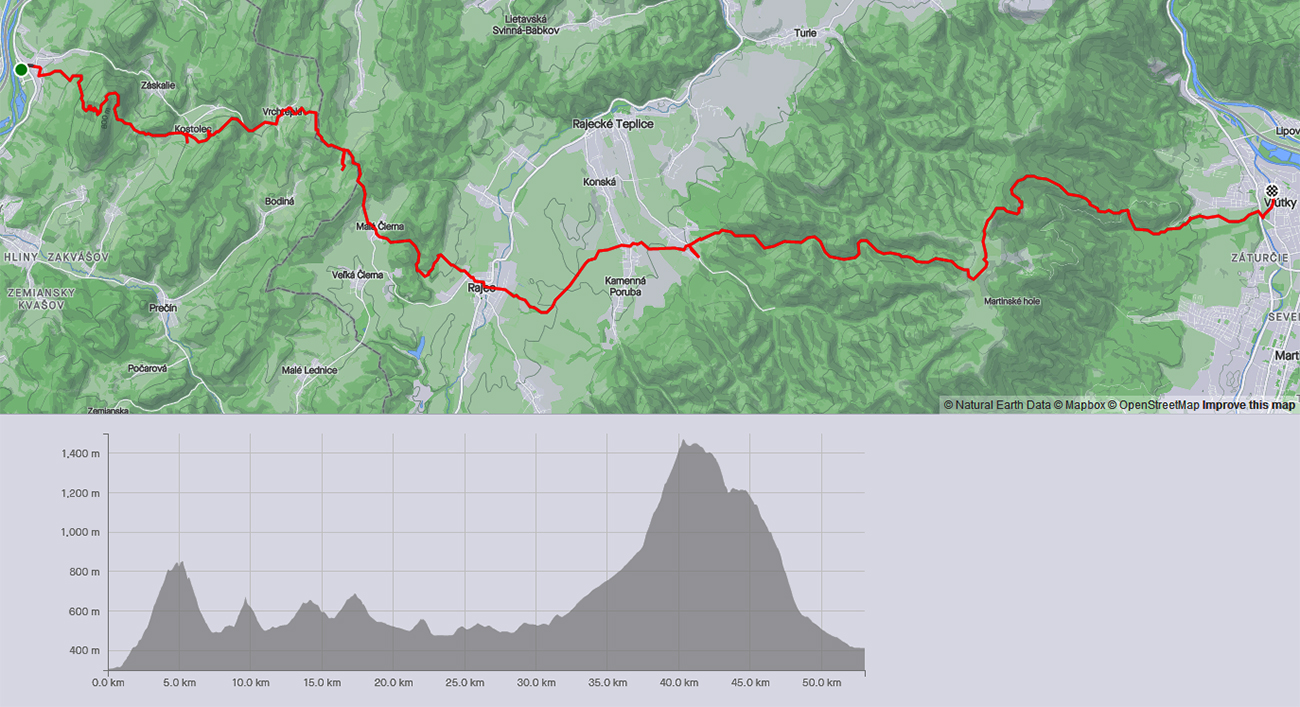 Ku smerovníku pri prameni som z lesa vybehol oproti tmavomodrej búrkovej stene, ale cestou dole ma len pár zablúdených kvapiek trafilo a pod korunami ani to nie. Zato dole v Jedľovinách už bolo po poriadnom lejaku, súdiac podľa kaluží a blata. Ale ako dobre sa dýchalo! Aj boty som pekne opral - cestou do Vrútok po lúkach popri potoku, tak spokojnosť. A potom už som to len zaokrúhlil na 53 km a takmer presných 8,5 hodiny v aleji popri Turci. Spokojnosť, aj keď trochu viac unavená, ako som čakal. GPX je hore, ak by sa niekto namotal.