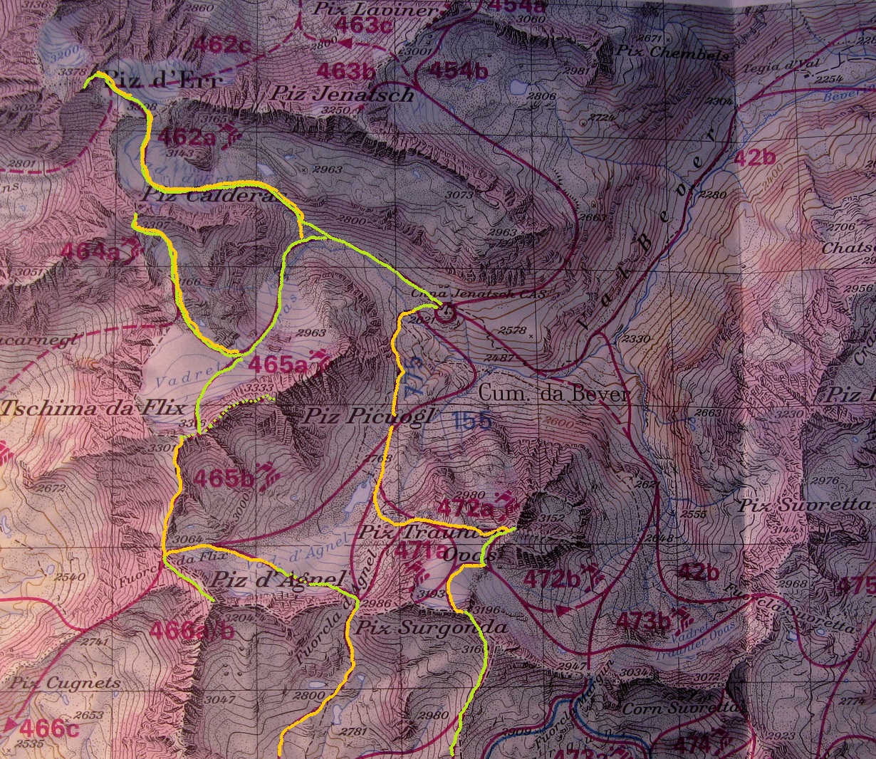 Sedím na vrchole Piz dErr. Vychutnávam výhľady smerom na Jenatsch a Laviner. Tieto dva kopce som musel z dnešného programu vyškrtnúť, a tak som si spravil pohodový deň. Oproti mne je Piz Calderas. Najvyšší kopec v okolí. Výstupová trasa naň vedie z druhej strany. Lyžujem dole popri mojej výstupovej stope a až dole v doline, vidiac už chatu, odbočujem vpravo a napájam sa na výstupovú stopu. Dnes je to tu prešliapané, všetko čo potrebujem. Na vrchole Calderasu som asi o hodinu a trištvrte po tom, čo som opustil Piz dErr. Na rozdiel od Erru na Calderas sa dá vyjsť až na vrchol na lyžiach. Výhľady hore dlho nevychutnávam, fučí nepríjemný vietor. Spravím zopár fotiek a už si to mierim veľkými oblúkmi dole. Občerstvím sa až na ľadovcovom plató, kde znovu nalepím pásy.