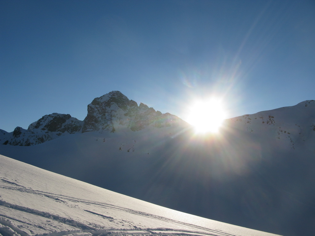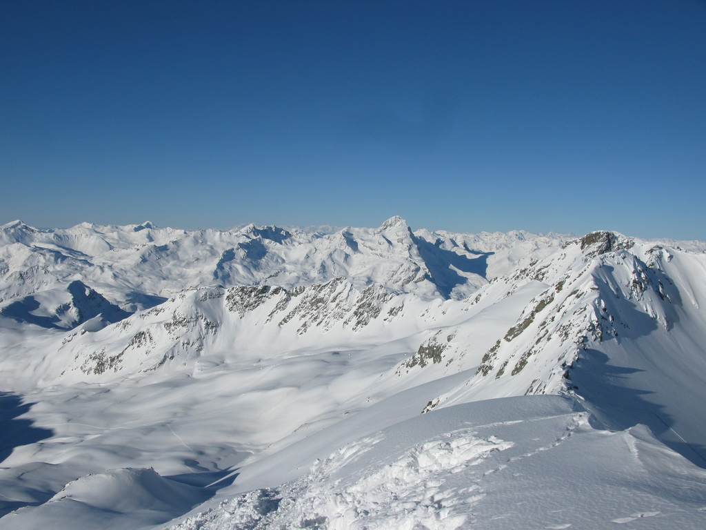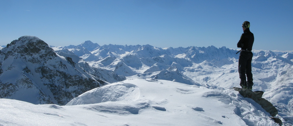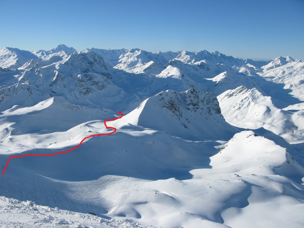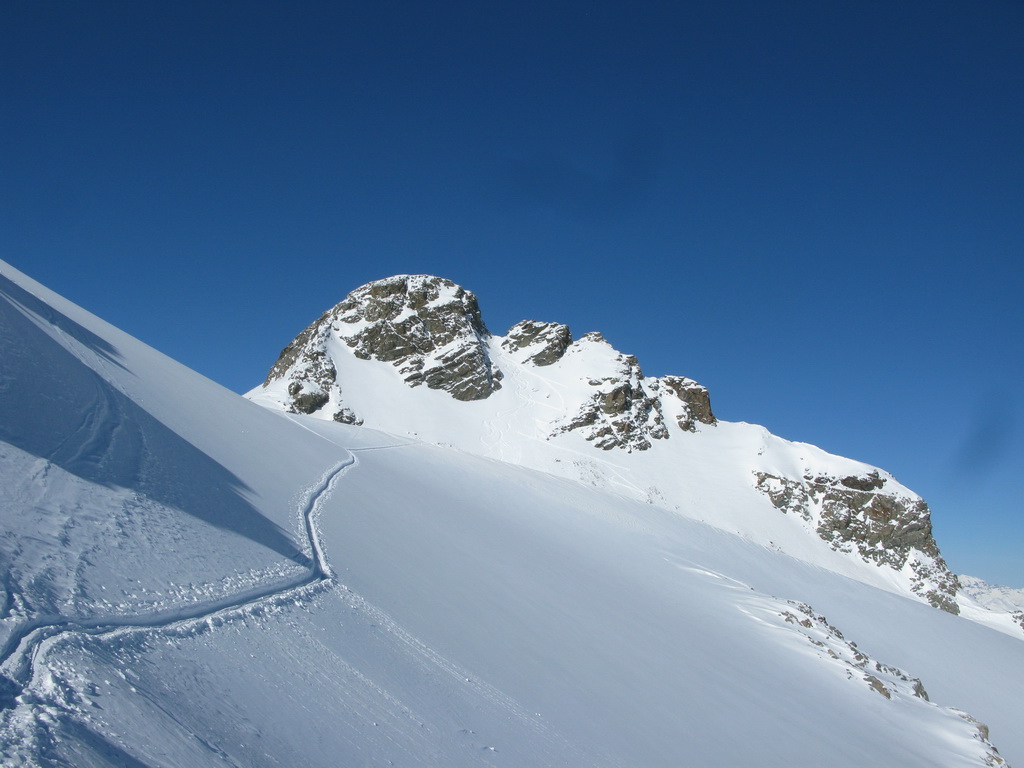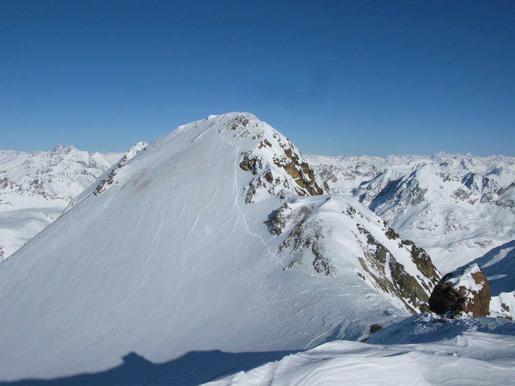 Na vrchol vedie pešia i lyžiarska stopa. Dávam lyže na batoh a idem peši. Až po chvíli si uvedomím, že naspäť dole to na lyžiach nepôjde. Hrebeň je vyfúkaný, je tu veľa kameňov. Z vrcholu by sa dalo zlyžovať priamo do Val dAgnel, o tom sa ale presvedčím až pri pohľade z doliny. Zhora ten smer nie je vôbec vidieť, a tak sa s lyžami v rukách vraciam zase naspäť. Ešte predtým si ale vychutnám pohodu na poslednom dnešnom vrchole. Času mám kopec, neponáhľam sa. Zo sedla nasleduje krátky zjazd v prašane, v traverze do sedla už naliepam pásy.