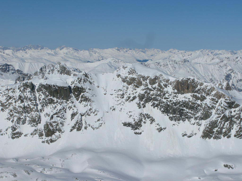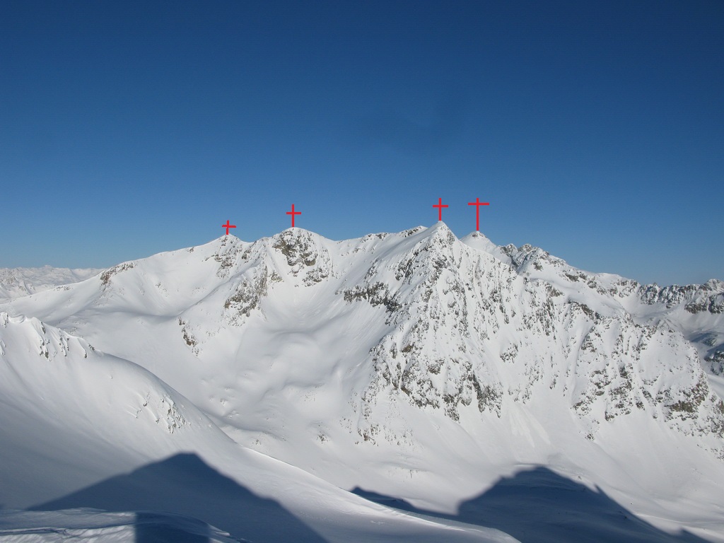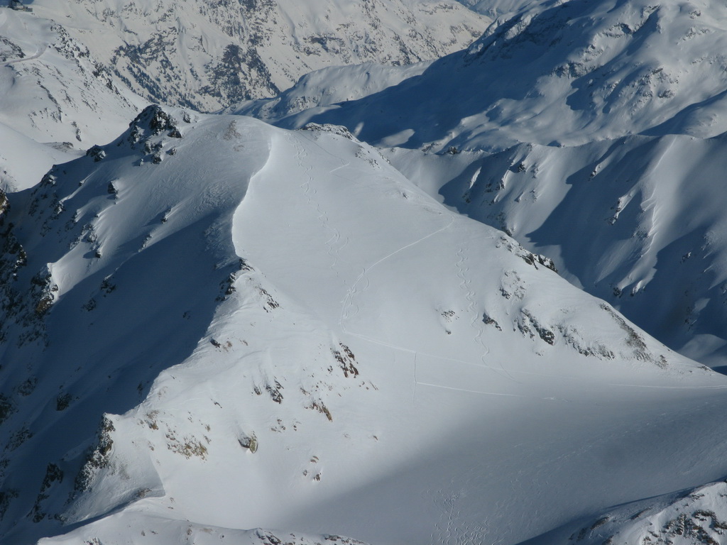 sa javil už ráno ako krásny vyhliadkový bod nad dolinou. fotil som si ho z nižšieho Traunter Ovas, teraz sa pozerám na spomínaný kopec z nadhľadu. Vychutnávam výhľady, pozerám si kde všade som bol. Pozerám na hodinky: sú tri hodiny. Spravil som dobré rozhodnutie, že som sa už nepustil na Jenatsch. Bol by som sa dostal zbytočne do stresu. Takto si vychutnávam pohodový deň. Vraciam sa po mojich stopách naspäť, ide to už oveľa rýchlejšie. Beriem lyže na chrbát a vychádzam na posledný vrchol trojvrcholového hrebeňa. Odtiaľto sa širokým hrebeňom zjazduje do sedla pod