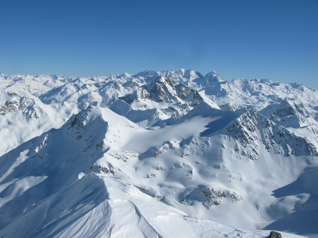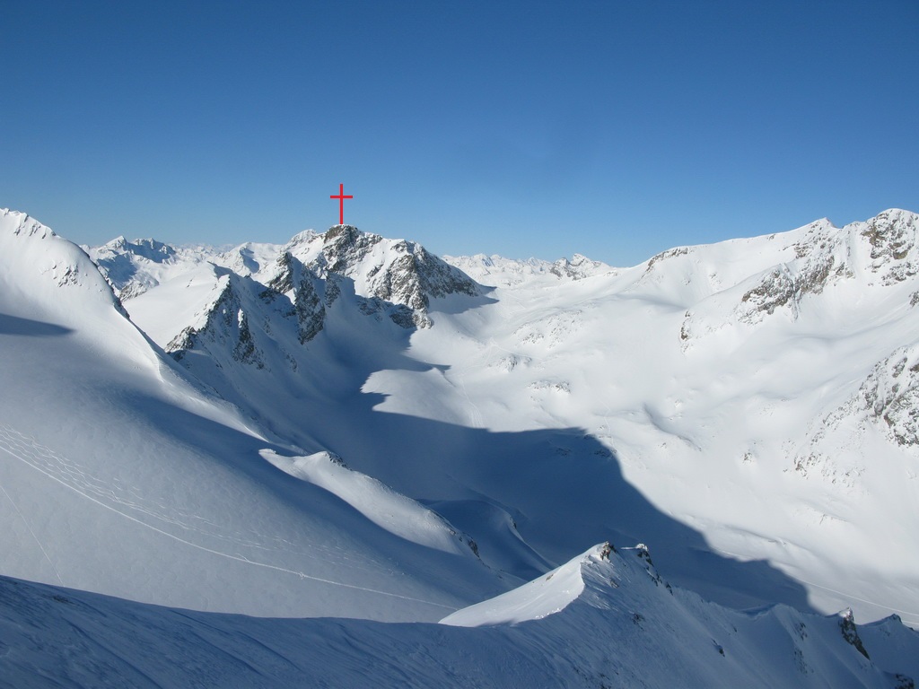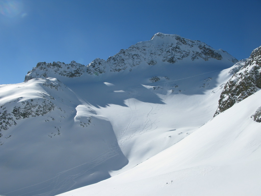 Aj keď je to po susednom Calderasi až druhý najvyšší kopec v okolí, táto oblasť má meno práve po ňom. Rozhodol som sa zamieriť najprv sem. Neviem koľko toho dnes stihnem a tento kopec si nechcem nechať ujsť. Výstup vedie veľmi peknou dolinou, s výhľadmi na Piz Jenatsch, potom výstup cez ustupujúci ľadovec (trhliny som nevidel), prenesiem sa cez predvrchol a na bielom plató už stojím pod vrcholom. Strmý svah končiaci v sedielku, tu nechávam lyže a severnou stranou strmo hore peši na vrchol. Úžasné výhľady, fotím všetko dookola a prvý raz dnes používam aj samospúšť.
