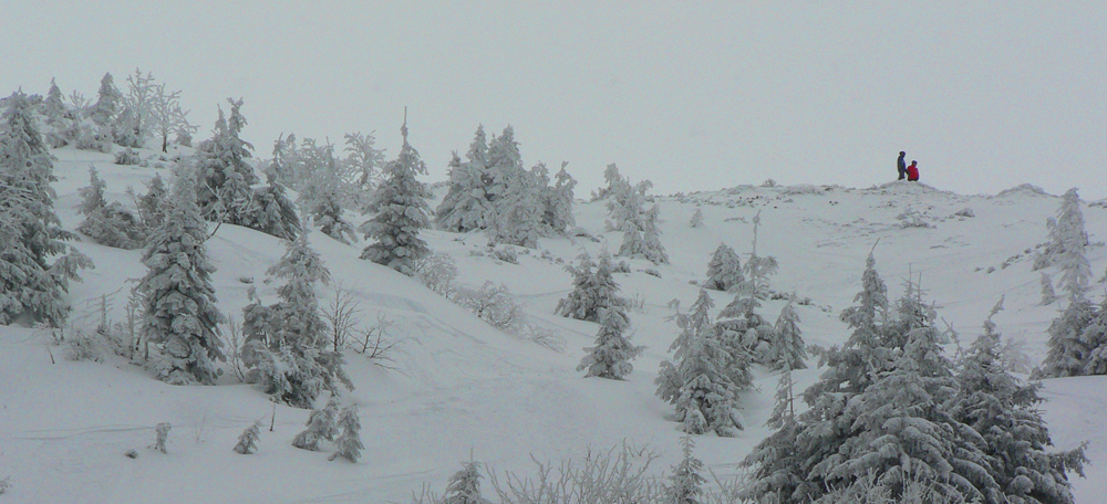 Les pod Generálom ako z vianočnej rozprávky, Generál síce zo včera polyžovaný, ale stále sa bude dať popoludní v tých duchnách vyblbnúť. Nocľažníci z chaty už preleštili traverz do Snilovského sedla, takže až tam pohodlne. Mraky sa držali okolo 1400-1500m, takže čím skôr dolu: prvý raz do Oštiepkovej. Hore vetrom ubitý sneh, okolo vleku rozlyžované, ďalej od neho medzi stromami taký hutnejší prašan, čím nižšie, tým redší, v ňom každú minútu pribúda oblúčikov. Vlek chrlí frírajderov.