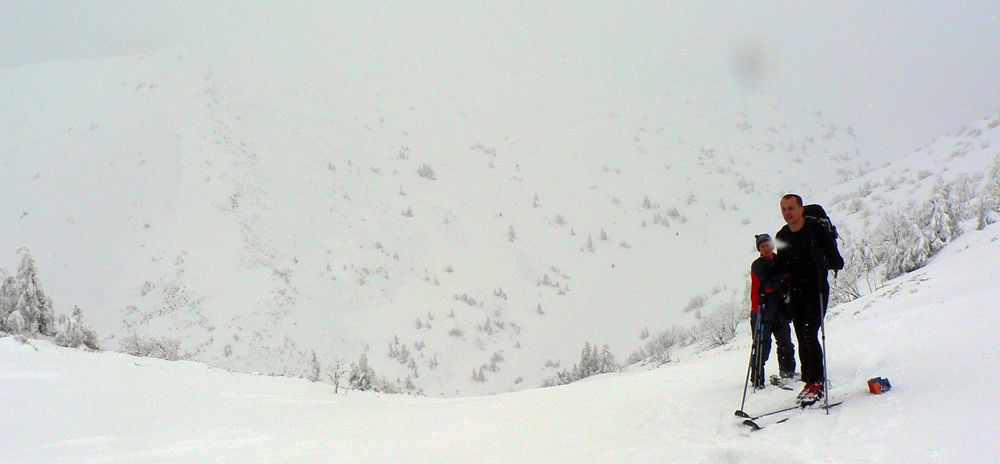 Dosť bolo davov, ide sa na Kriváň: zo Snilovského sedla traverzom východného svahu, nie cez hranu, tam je isto ľadovo. Aj na vrchole ľad, ale už pár metrov nižšie smerom do Snilovskej doliny rovnomerná mäkká vrstva nového snehu, dobré oblúčiky, aj keď nevidno pod nohy. Na severnej hrane žľabu sa síce škerí prevej, ale pod ním v mulde je to komfortné. Až dole k potoku.