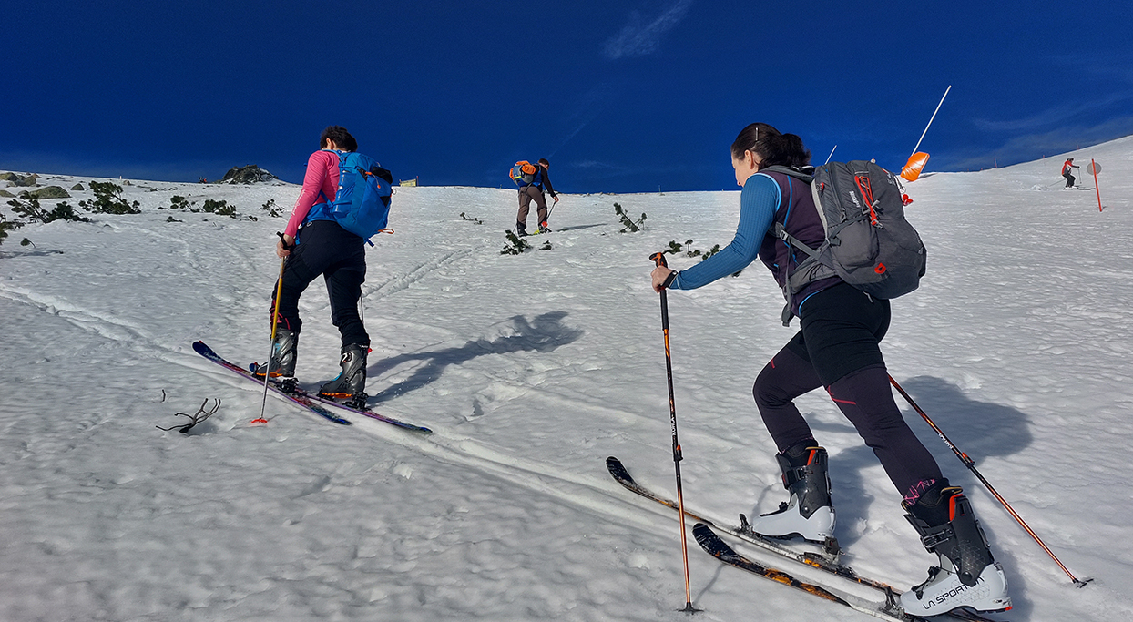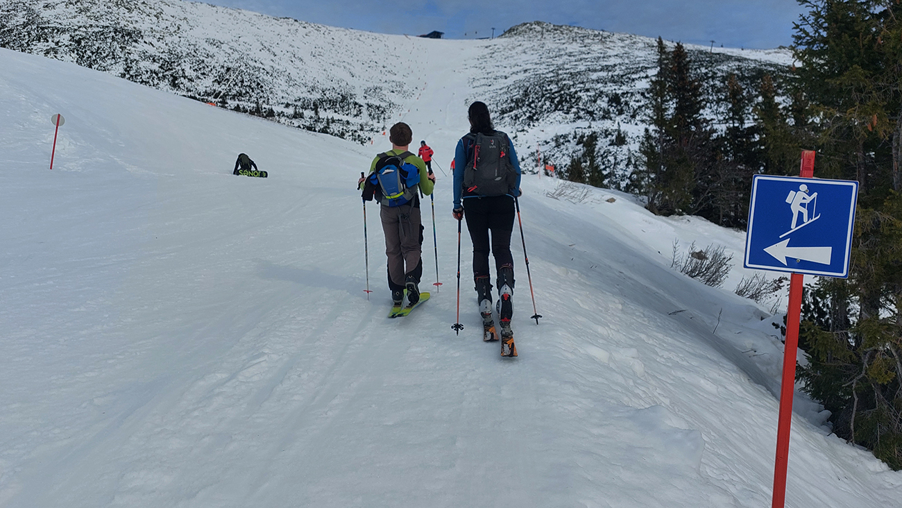 Stopa vyleštená a pevná, ale nešmýkalo sa ani v strmších pasážach – pekne to lepilo. Pásy samozrejme mokré durch, už po pár metroch a čím vyššie, tým aj teplota vzduchu vyššia. Miesta aj snehu našťastie dosť aj pomimo zjazdovky. Aj čistý bol, len buriny z neho trčali ako dôkaz jeho nedostatku.