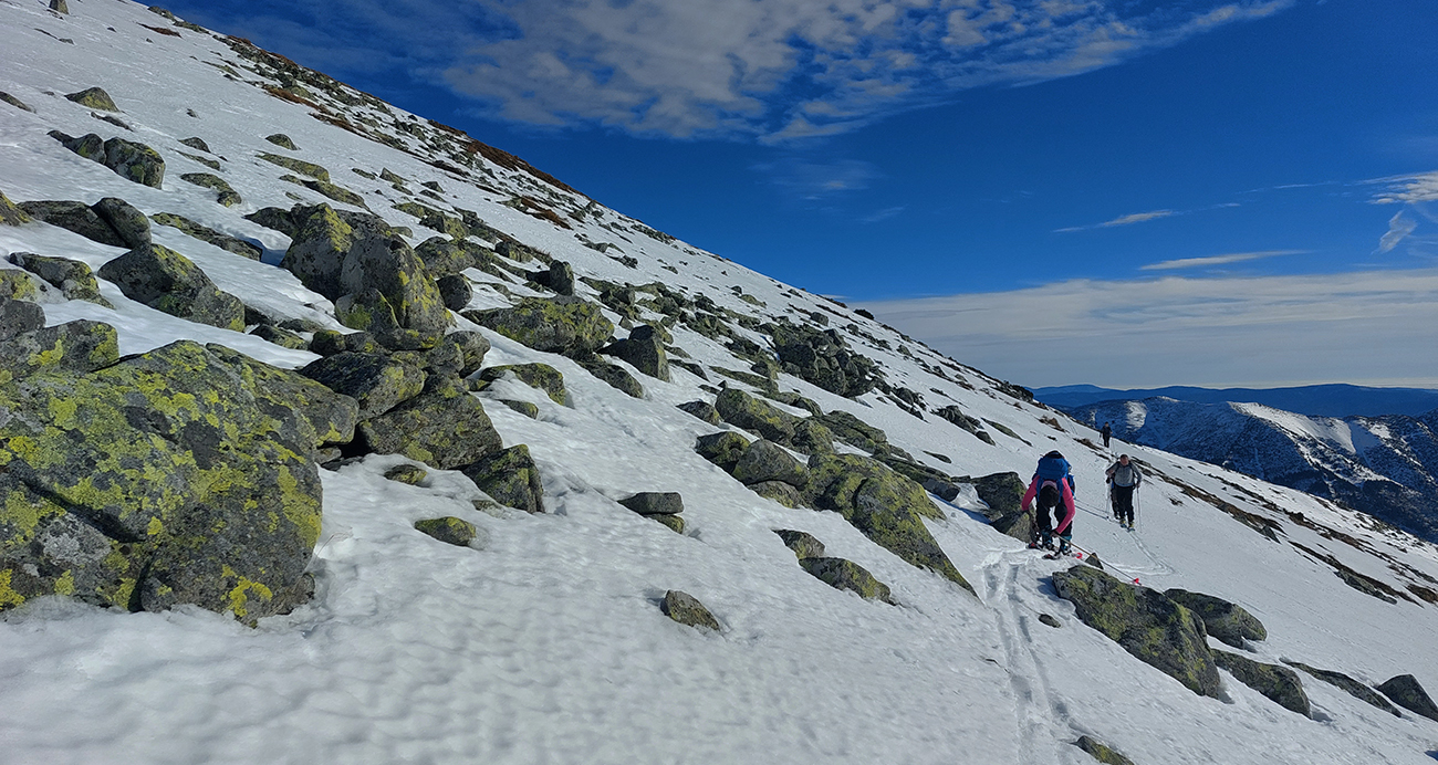 Hore rozhodovačka, že kam a že vôbec čo tu... Vyhral návrh ísť sa pozrieť do sedla Poľany, či sa nebude dať zjazdiť do severu. Skúsili sme síce aj pár oblúkov spod Derešov na juh, ale bol to tragický prepadák, navyše bez podkladu, takže žraloky striehli tesne pod hladinou, žiadna radosť z pohybu. Ale aspoň sme zišli hlbšie pod hrebeň, kade sa smerom na západ dalo lepšie traverzovať, bez prílišného kľučkovania pomedzi kamene.