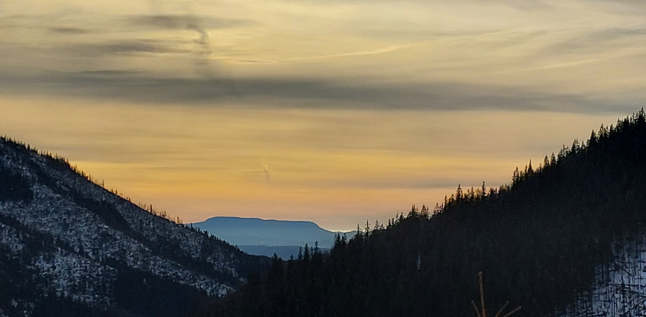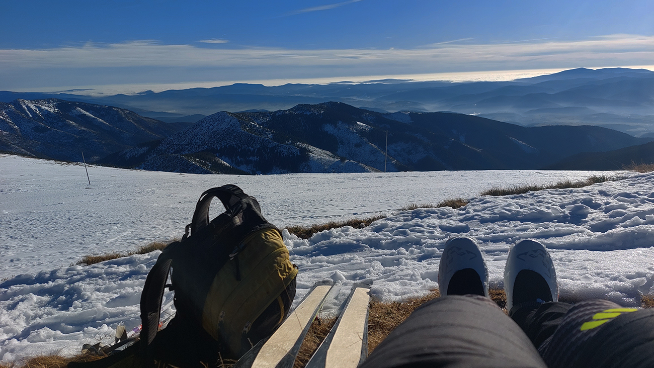 Len o kúsok vyššie „od úpätia“ sa vďaka rúbaniskám a priesekom zjazdoviek začali otvárať tie notoricky známe panoramatické výhľady – žiaľ teraz najmä na okolitú snehovú biedu. Dominovali tmavé farby a v diaľke na juhu Klenovský Vepor. Podklad mimo pisty sa zdal byť pevný, ale kto si trúfal vyskočiť z lyží, hneď bol po kolená zapadnutý do mokroty.