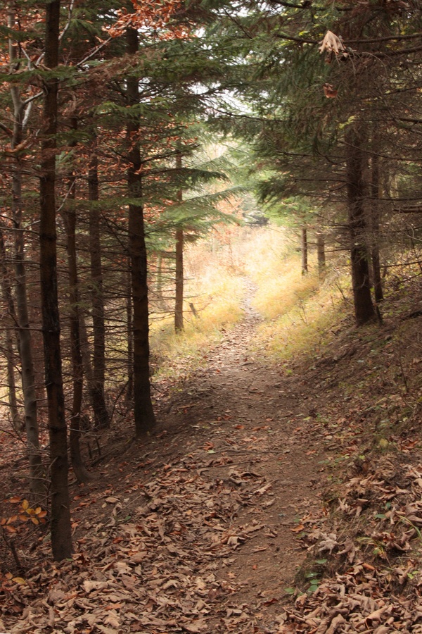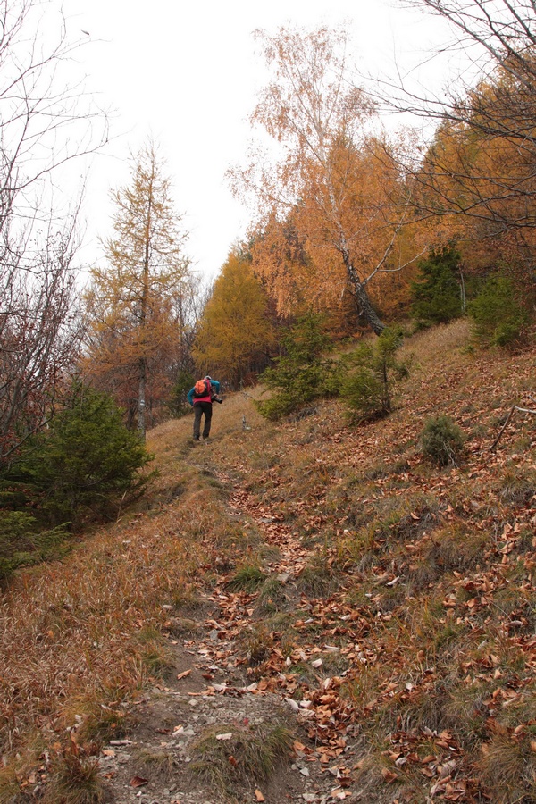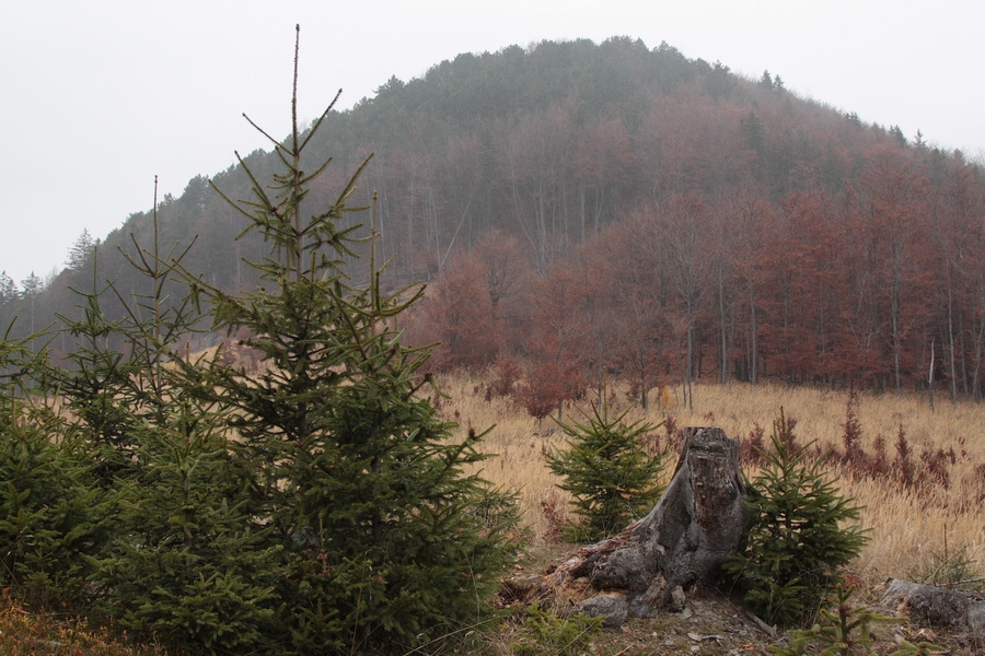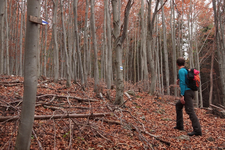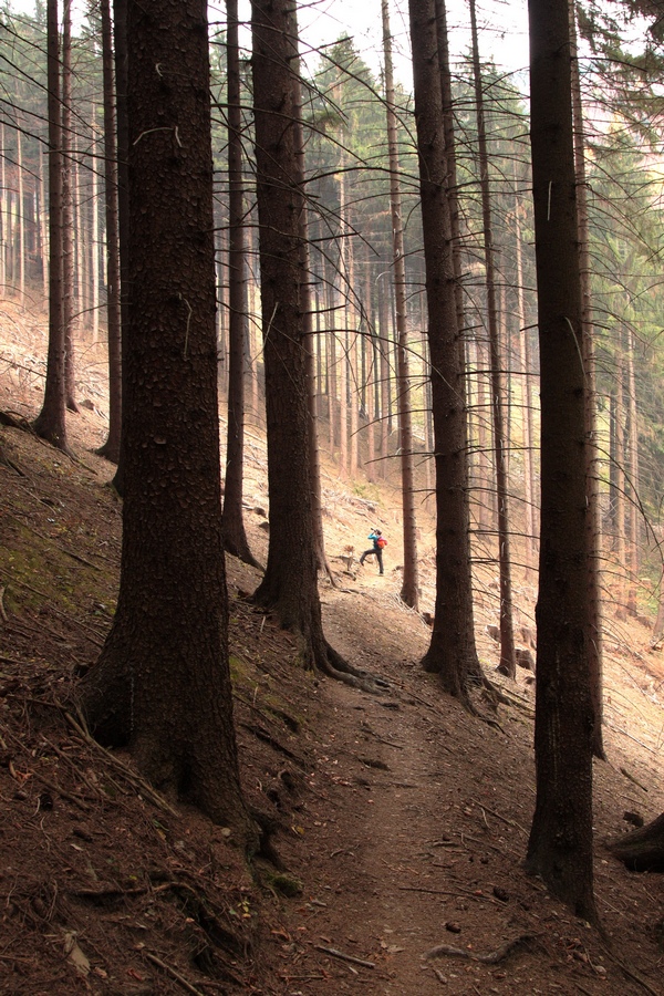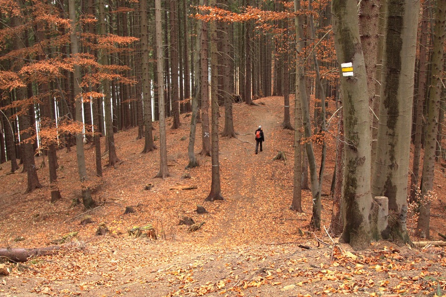 Štart aj cieľ je pri obecnom úrade v Turí. Bočnou ulicou sa dostaneme k miestnym bytovkám a popri nich rovno na šíre lúky s výhľadom na dedinu. Po chvíli sa značka skrúti do starého kameňolomu, kde sa na jeho hornom okraji rozbieha na dve rôzne strany. Ako výstupová trasa sa používa modrá, žltá je na zostup. Výstupový chodník sa zo začiatku vinie miernym stúpaním, spodným okrajom lesa, až vhupne medzi krásne urastené smreky. O kus ďalej na krátkom, strmšom úseku ešte preverí kapacitu pľúc. Miestny les sa mi páči. Nenájdete tu zničené turistické chodníky ani rozbahnené zvážnice, v polome sú vysadené mladé stromčeky, v mladine je urobená prebierka. Po dlhej dobe vidím, že naše prírodné bohatstvo sa dá využívať aj s rozumom.