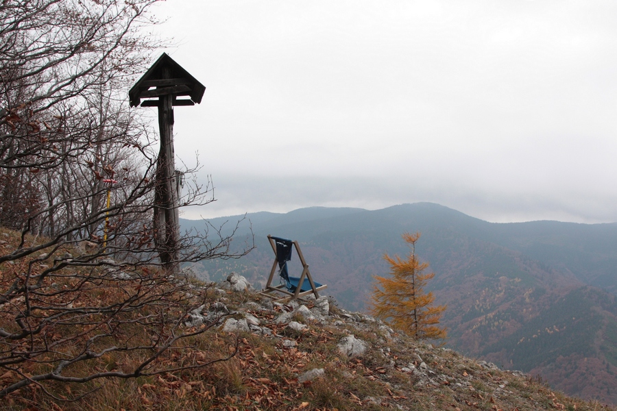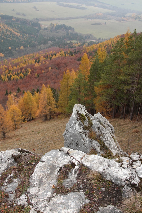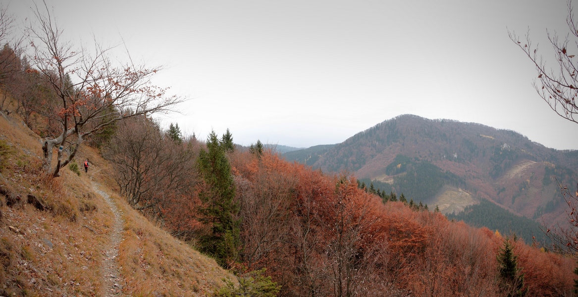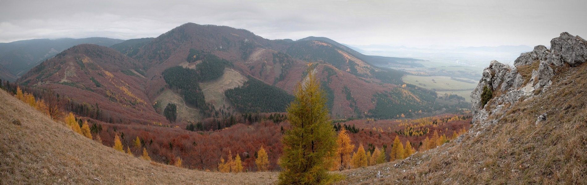 Asi 15 minút pod vrcholom sa už začínajú otvárať výhľady do Rajeckej doliny z niekoľkých skalnato-lúčnych vyhliadok. Hlavne na jeseň to tu hýri farbami - aj vďaka množstvu smrekovcov. Vrcholová lúka už rozšíri náš zorný uhol smerom na juh snáď na celých 180° - od Minčola po Martinky, cez dolinu oproti „zavadzia“ výrazný Kozol, na pravoboku dovidieť od Súľovských skál až po Strážov. Kochať sa dá aj posediačky – na moju detskú radosť objavujeme pri vrcholovej tabuľke opreté staré rozkladacie lehátka :o) A aby bol zážitok dokonalý, na niekoľkých ohniskách sa tu dá aj svačina opiecť. Idylku nám však prekazí silnejúci dážď, a tak sa podľa smeroviek poberáme dole.