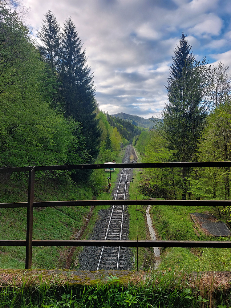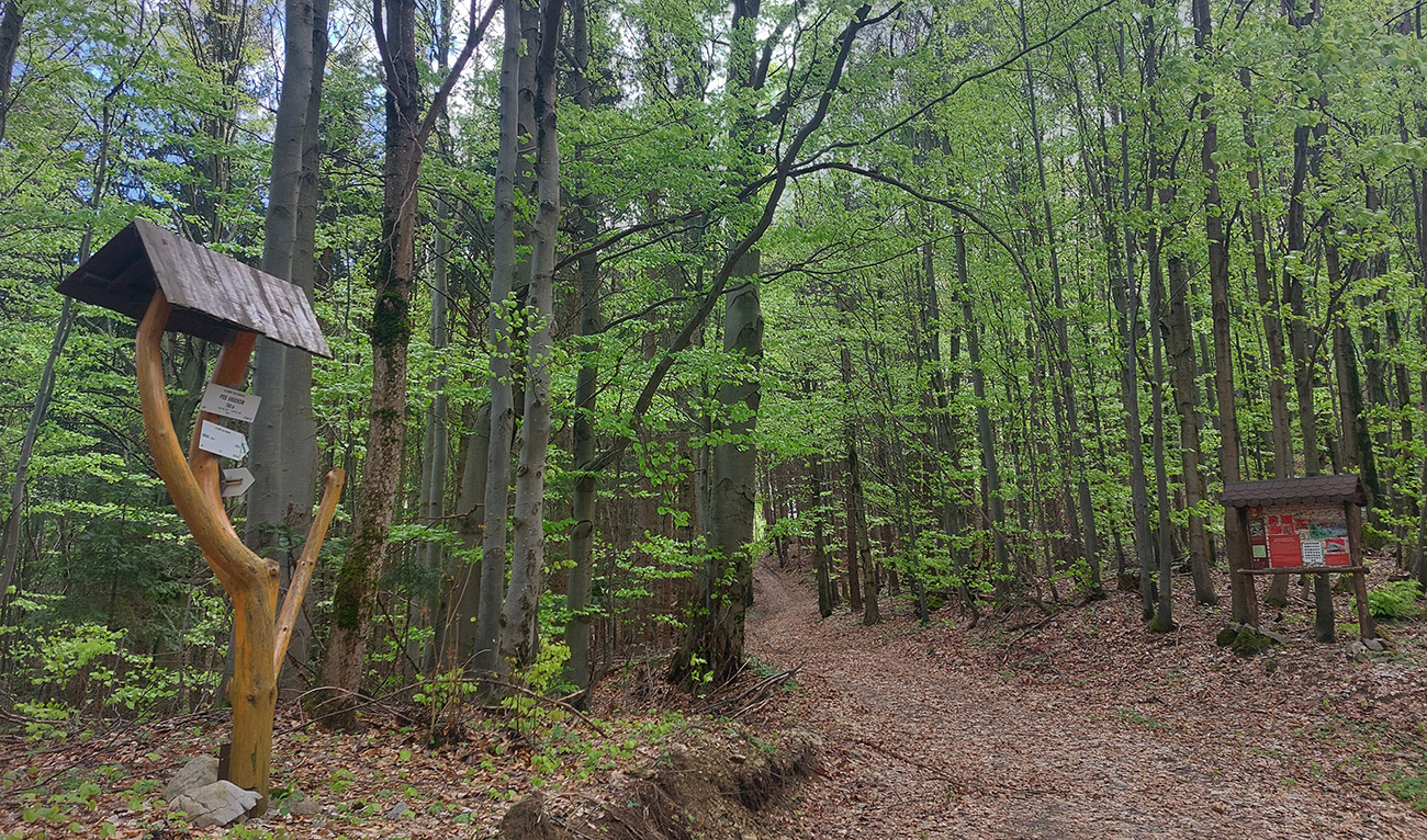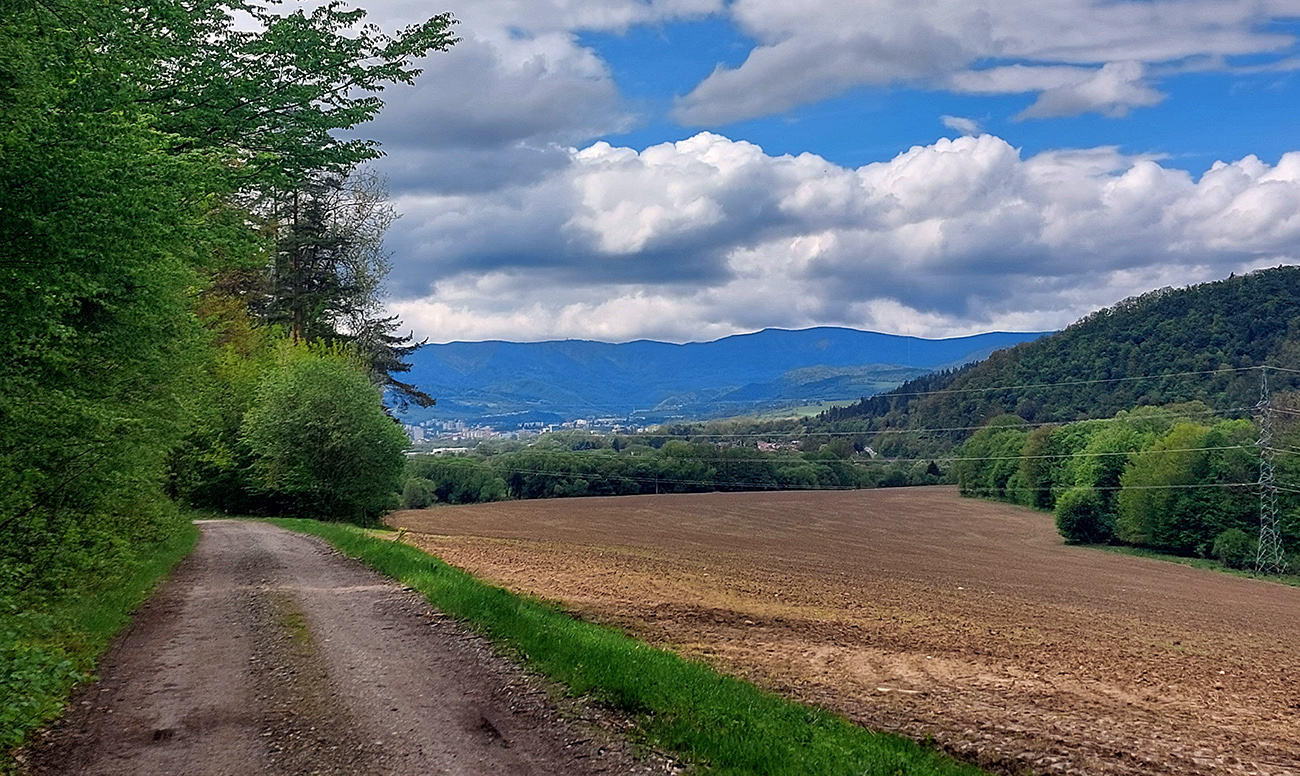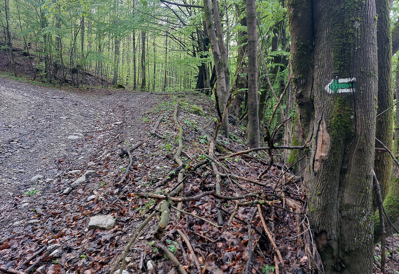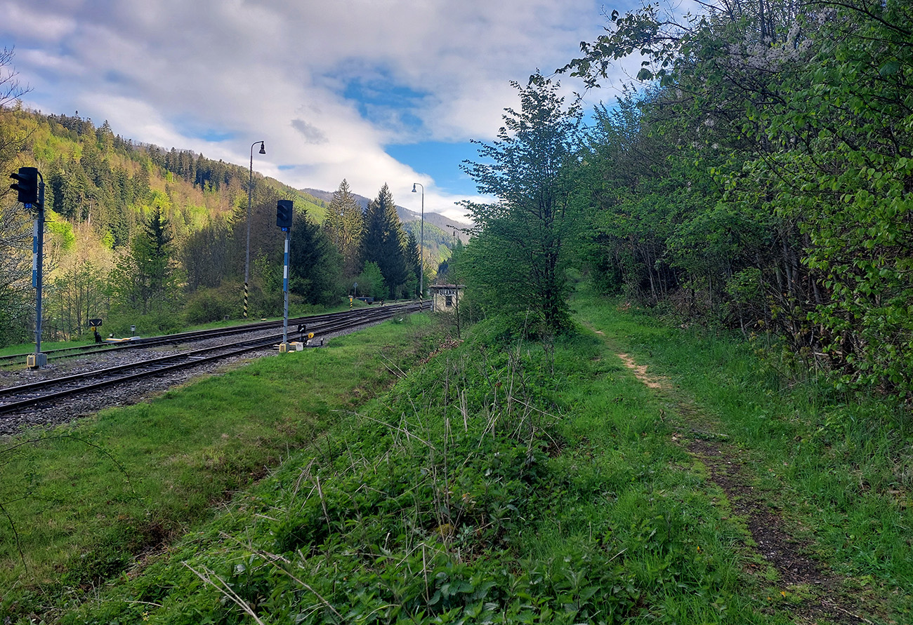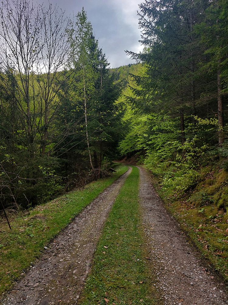 Andrášovou dolinou som zbehol na stanicu v Uľanke, preskákal koľaje a úspešne našiel podobnú (ako predtým), trochu zarastenú, ale zjavne používanú cestičku, ktorá ma neomylne napojila na Barborskú cestu – v tomto prípade na prastarú, ale výborne udržiavanú spojku zo Španej Doliny do osady Piesky. Menej výhľadov, viac stúpania, dlhšie monotónne dupanie, ale stále komfort, to som potreboval. Akurát, že mi po asi 10 kilákoch nejako začínali vädnúť nohy. No zbohom, to bude za Ultra Kras, o týždeň! Vpredu sa aspoň na chvíľu uráčila vyzrieť z mrakov Krížna: