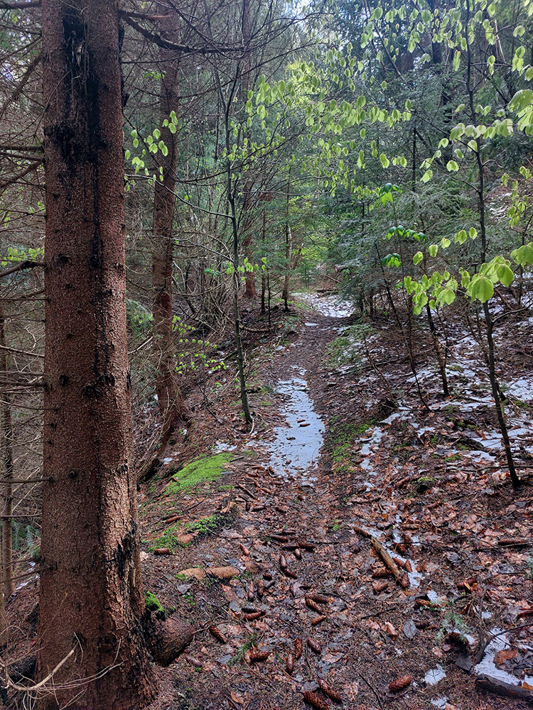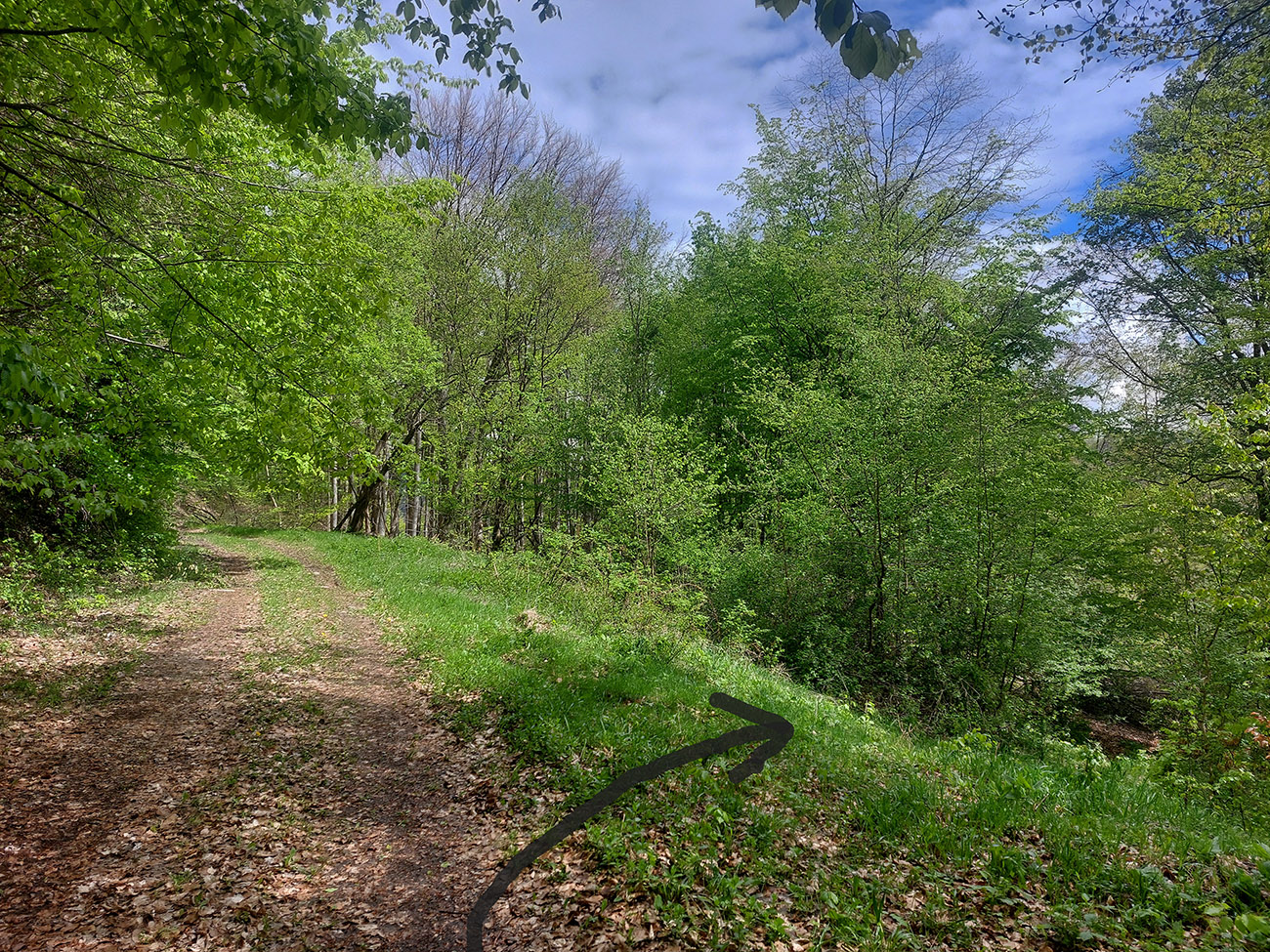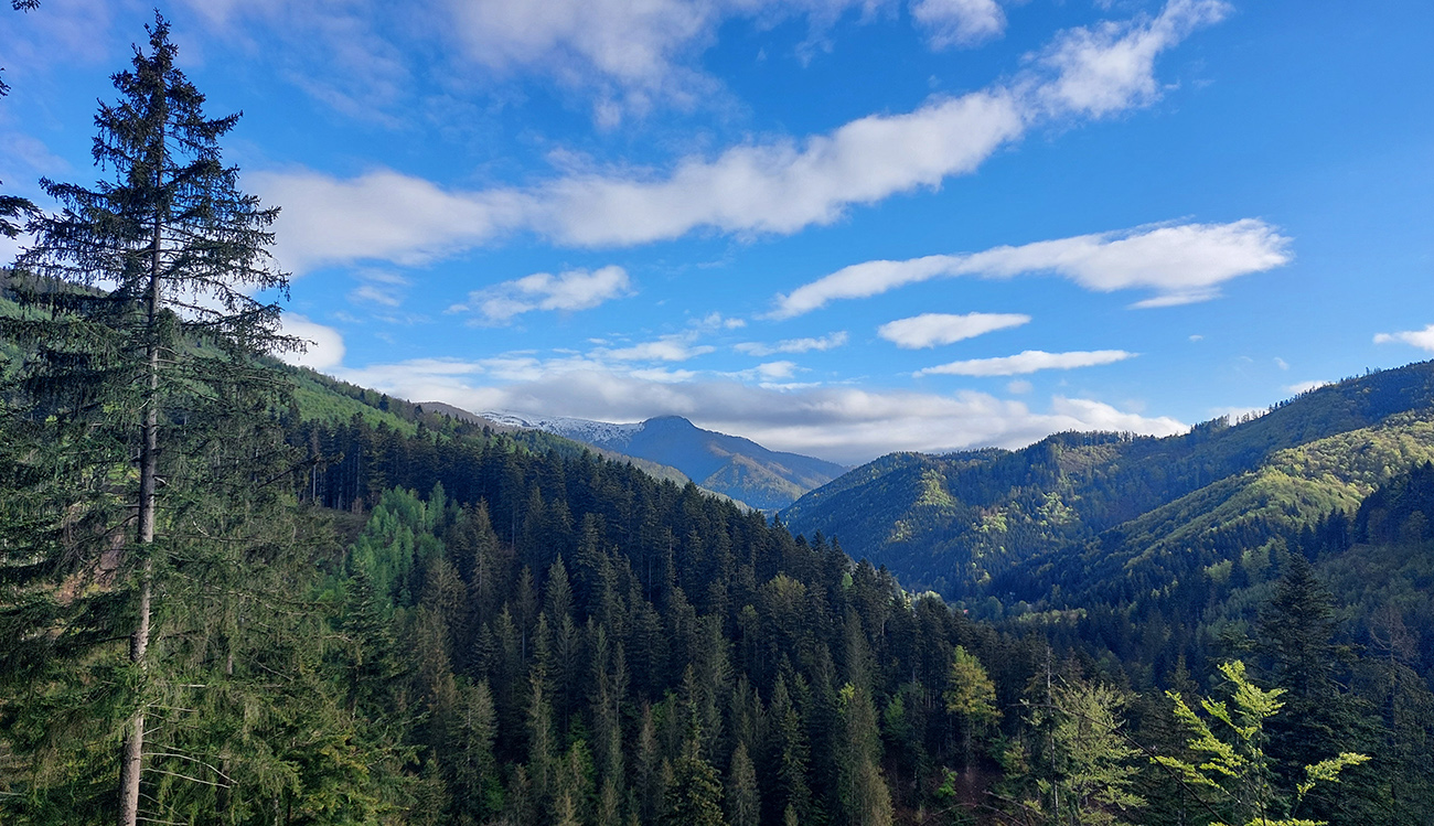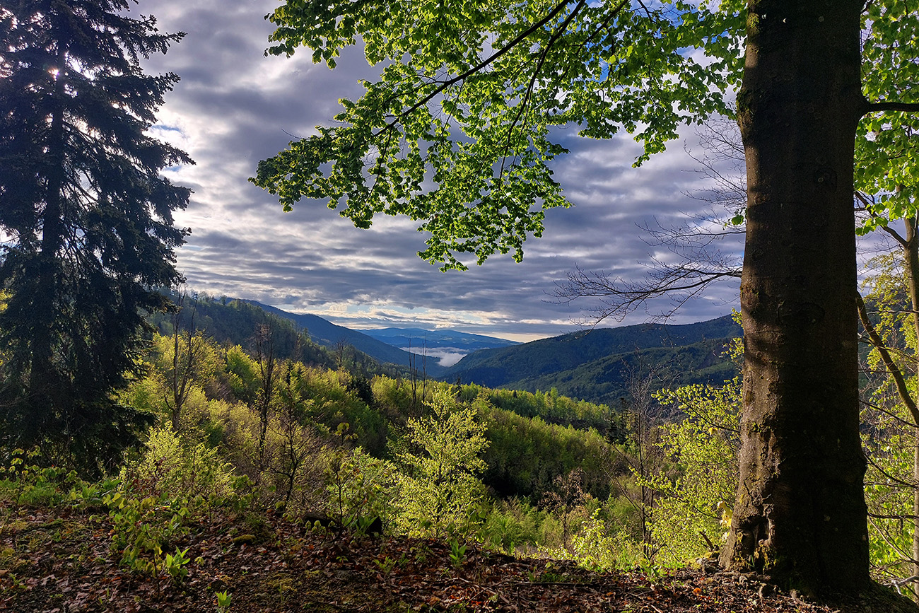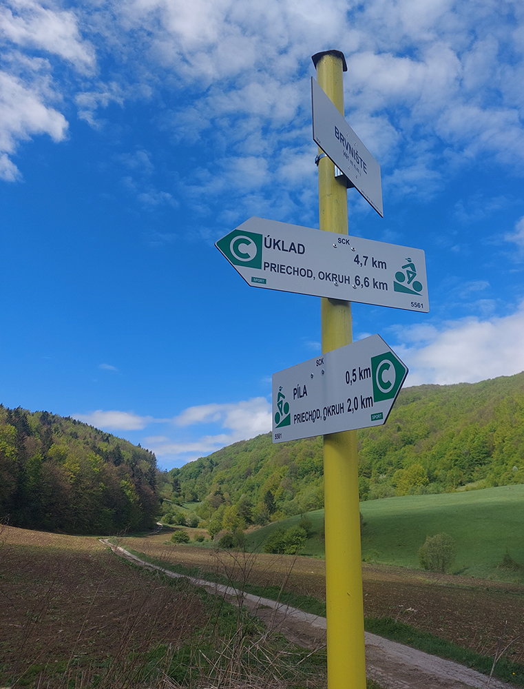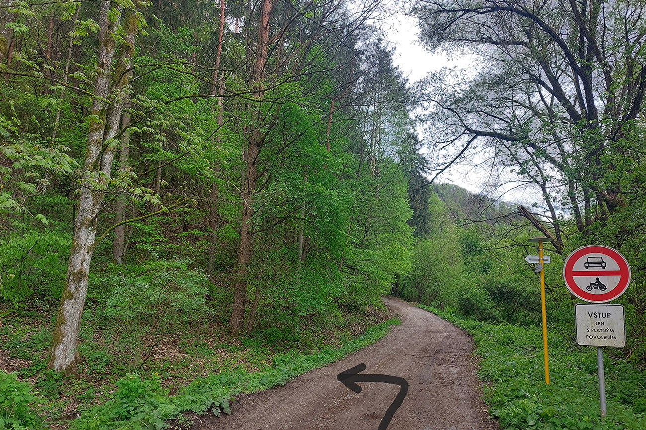 Andrášovou dolinou som zbehol na stanicu v Uľanke, preskákal koľaje a úspešne našiel podobnú (ako predtým), trochu zarastenú, ale zjavne používanú cestičku, ktorá ma neomylne napojila na Barborskú cestu – v tomto prípade na prastarú, ale výborne udržiavanú spojku zo Španej Doliny do osady Piesky. Menej výhľadov, viac stúpania, dlhšie monotónne dupanie, ale stále komfort, to som potreboval. Akurát, že mi po asi 10 kilákoch nejako začínali vädnúť nohy. No zbohom, to bude za Ultra Kras, o týždeň! Vpredu sa aspoň na chvíľu uráčila vyzrieť z mrakov Krížna:
