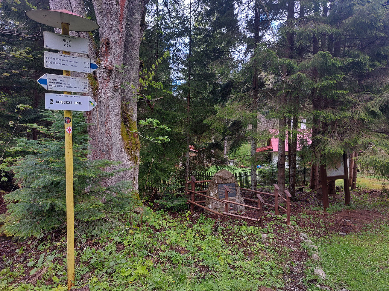 Osada Piesky so svojimi banskými dielkami, rozhádzanými farebnými kameňmi, haldami a kostolíkom tú predošlú monotónnosť ale dokonale vykompenzovala. Pomotal som sa a vyliezol do sedla Dolný Šturec odtiaľ nie po značke, ale po ceste pomedzi haldy. Zase nejaké tie výhľady (Krížna a spol.), ale aj všakovaké kamenné farbičky pod nohami.