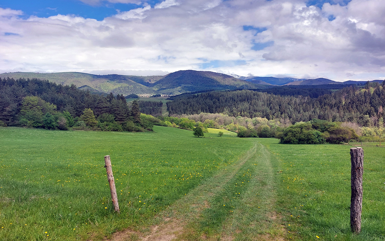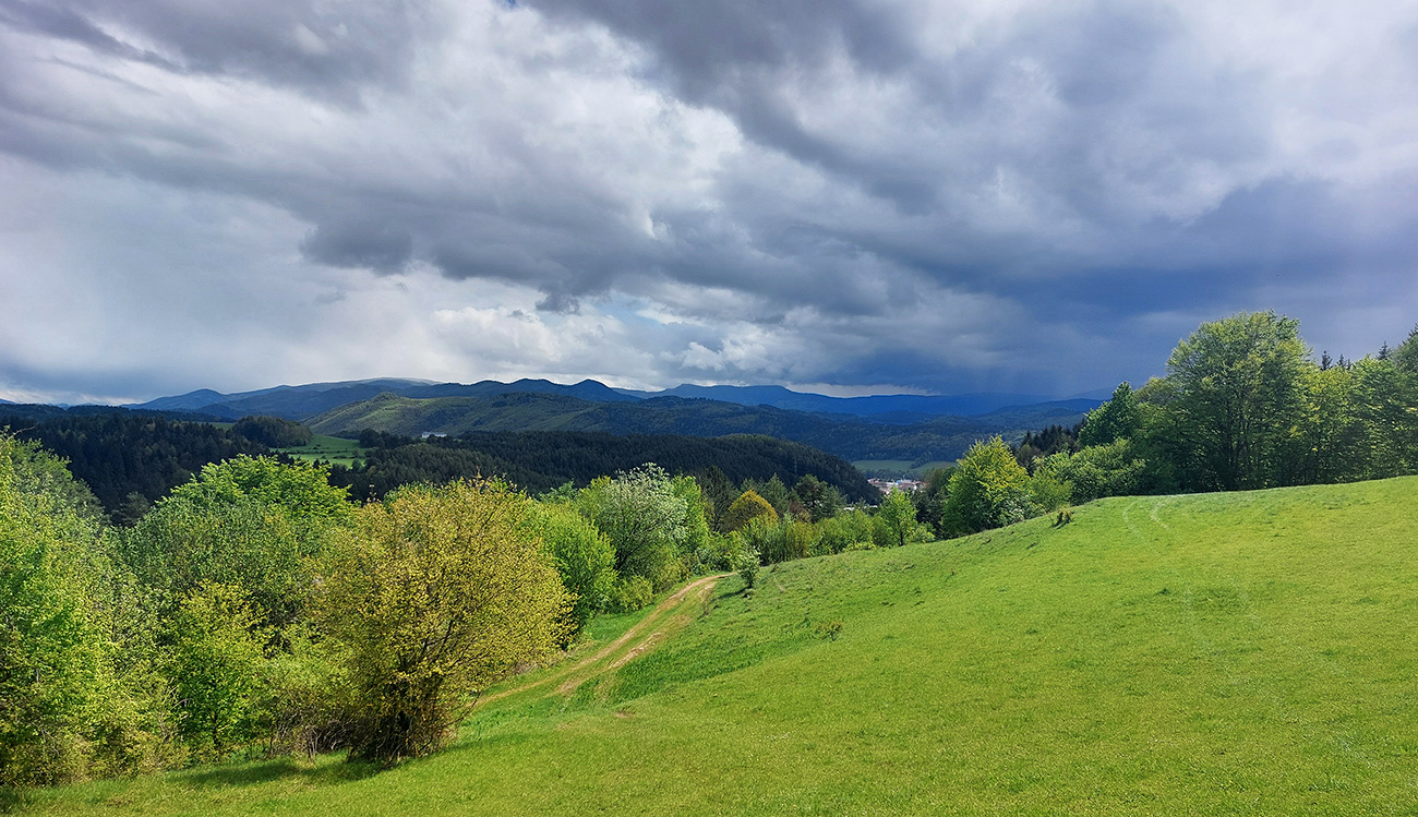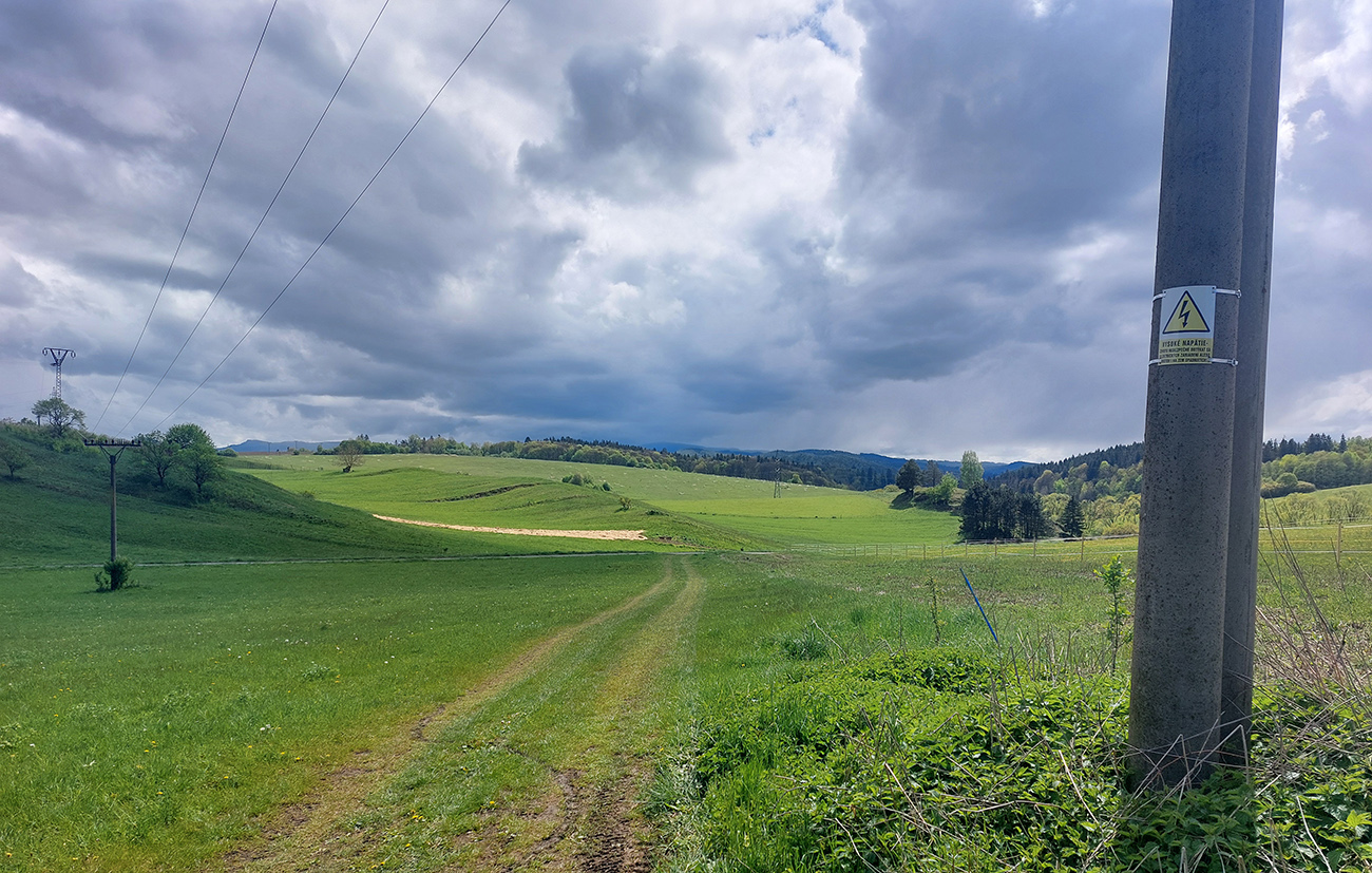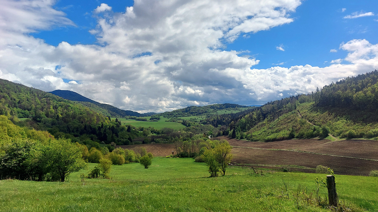 Na Hrádku samotnom len les a pri kope kameňov hrdzavá lopata (asi nie keltská), tak daváááj ďalej dole po zvážniciach. Potreboval som sa dostať cez Priechod do Ľupče, tak som z lesa odbočil strmo dole, doprava do doliny Brvnište - a začal najkrajší úsek celej trasy. Lebo prevažne cez lúky a s výhľadmi, čiastočne aj po cyklotrasách. Akurát som podcenil prechod cez „družstvo“ a privítalo ma stádo družstevných strážcov. Našťastie boli hraví, prítulní a nechali sa poškrabkať, hehe...