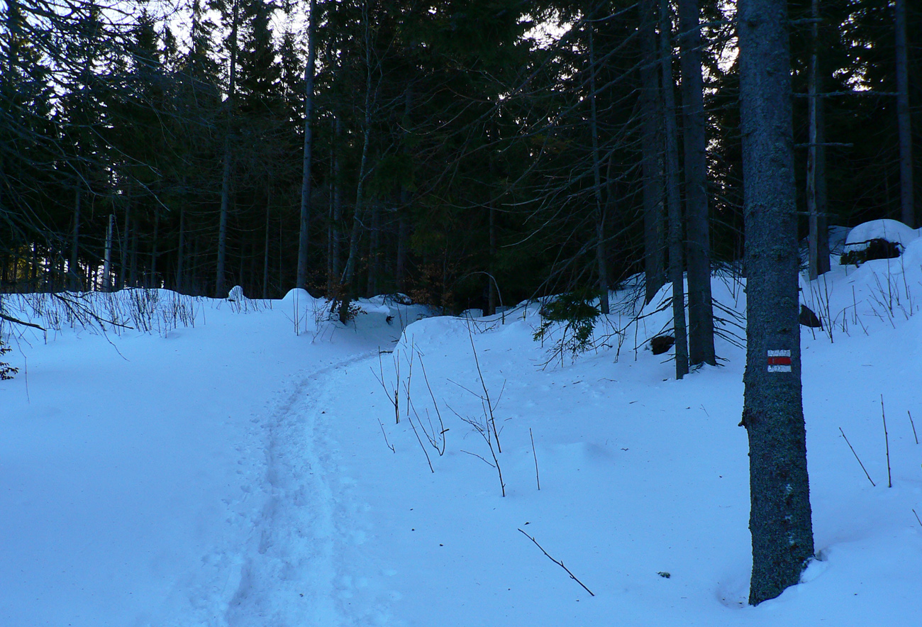 Teplota tiež príjemná jarná, jemne nad nulou, celý deň som šiel bez rukavíc, bez čapice, bez bundy. Aj keď stretol som partiu naloženú poriadne na ťažko, a pritom obalenú „v goráčoch“ aj s kapucňami. A jeden mal aj lyžiarske okuliare! Možno sa radšej potil ako opaľoval :-) Severáčik taký jemný, akurát osviežoval, bez neho by bolo prihorúco.