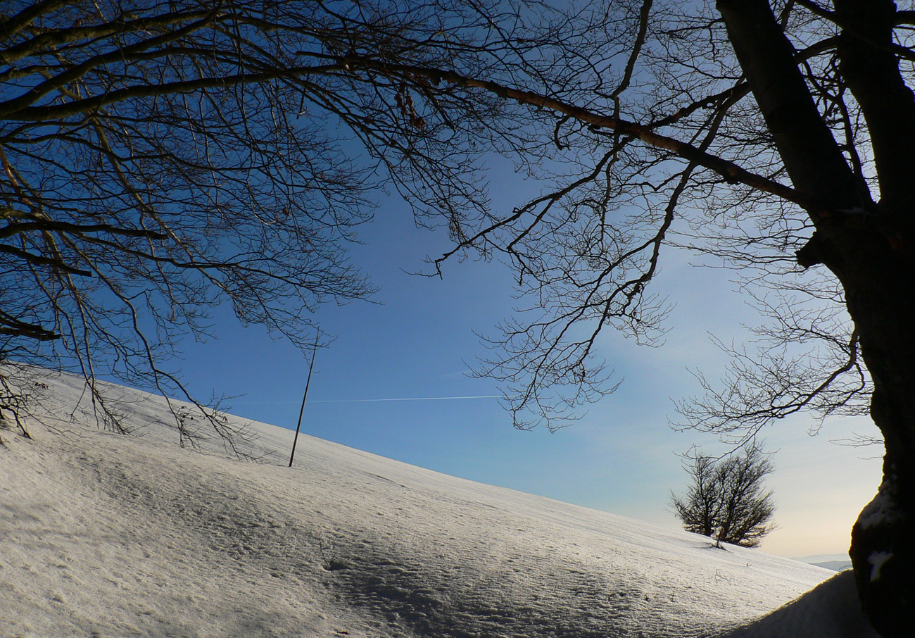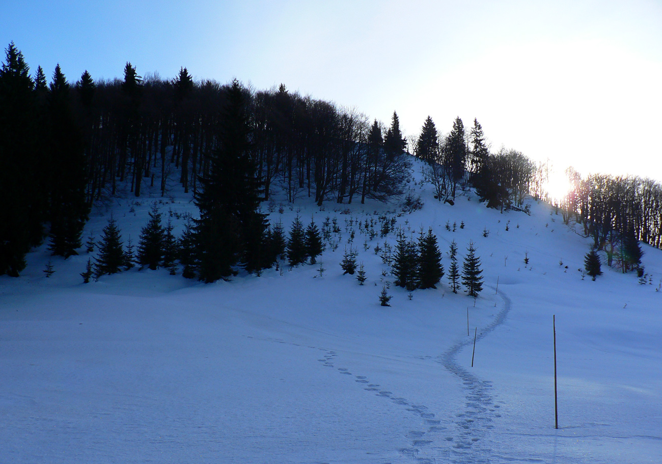 V lese smerom pod Prašivú ešte sa snažil suchý sneh lepiť na mokré pásy, ale nad lesom to už bolo pred desiatou natavené akurát tak, že by sa dala stopa ťahať aj kolmo hore. Niekto to aj skúšal, predo mnou :-) Držalo to fest.