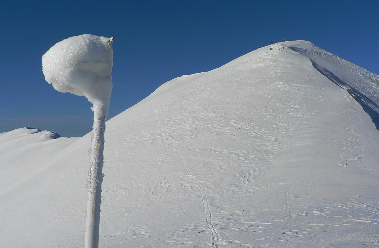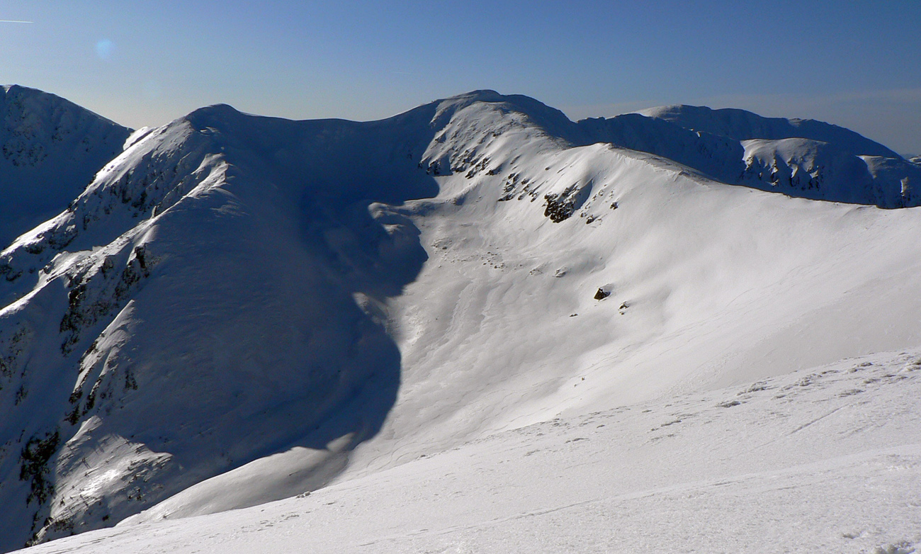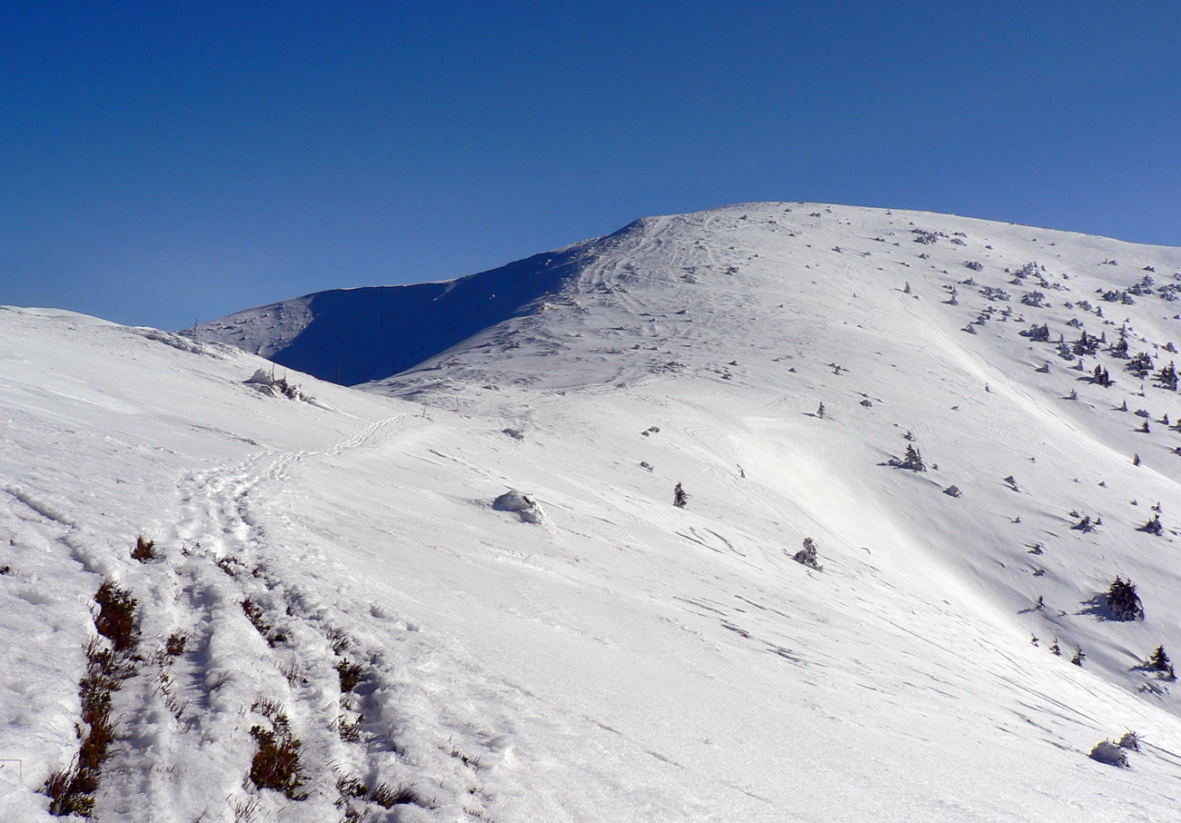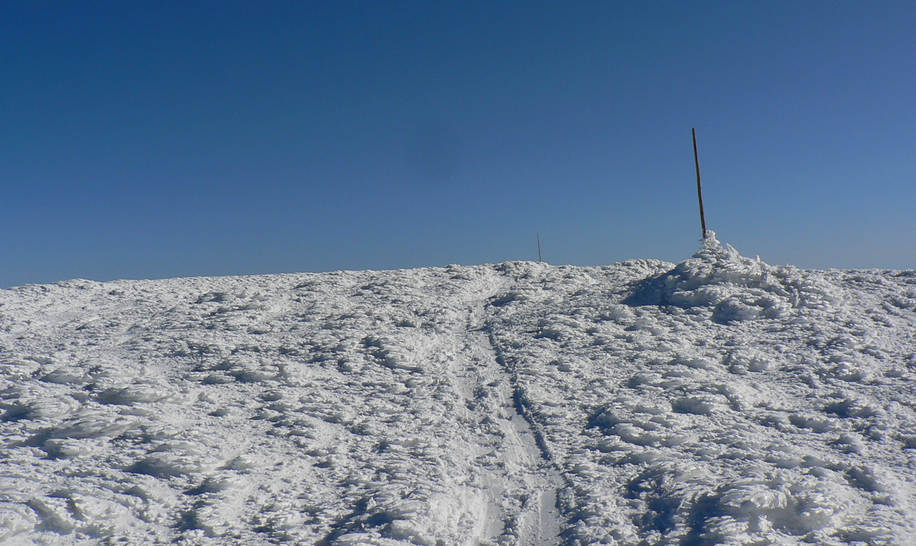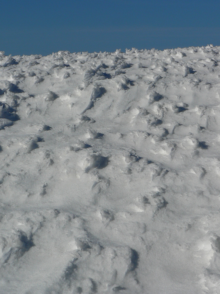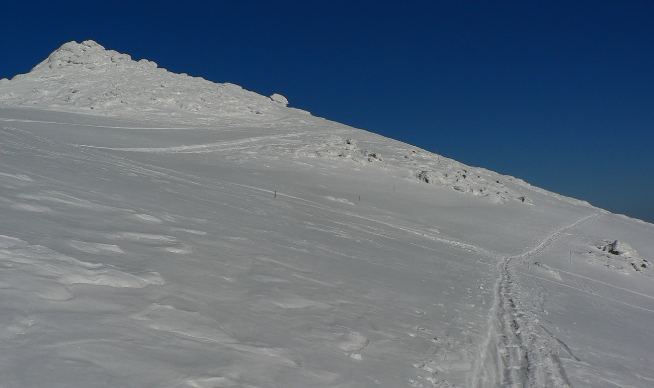 Kde to bolo pod lyžami ešte tuhé, samozrejme, že to bolo poriadne hrboľaté, vyfúkané do tvaru šindľov, žraločích zubov a podobných pásožravých patvarov. Ale chodníček vždy vydupaný pomedzi to. Pešiakmi a snežničiarmi. Ale v podstate väčšina hrebeňa je priechodná aj bez snežníc.