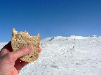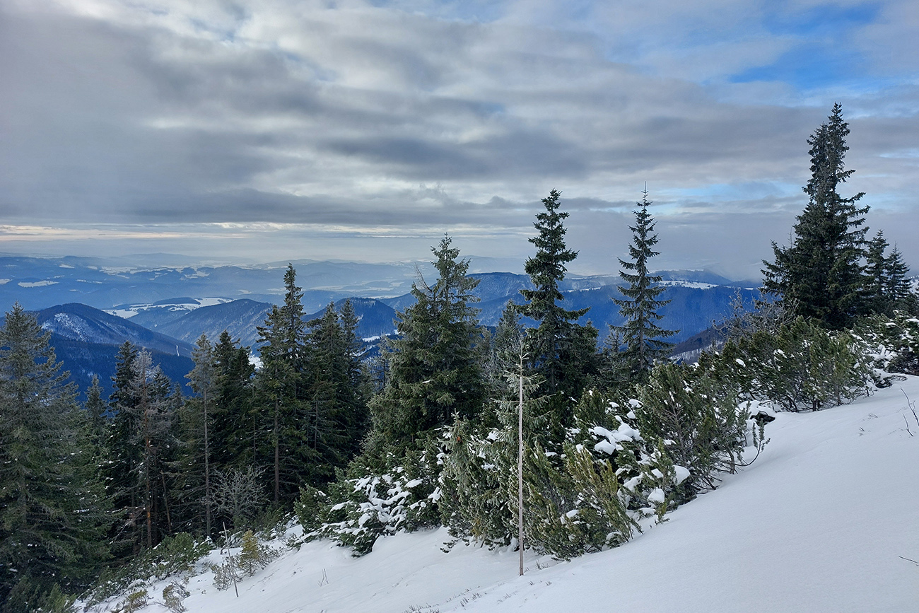 Aspoň pred Ďurkovou sa mraky trochu potrhali, tak som videl, kade vrchol najlepšie traverzovať. No to zas dáka energetická kríza prišla, tak nastala nutná pauzička v závetrí. Siahol som do tajných rezerv, ktoré som už dlhšie niesol pekne v teple na tele. Pomohli, aspoň trochu. A možno aj ten výhľad do krajiny: