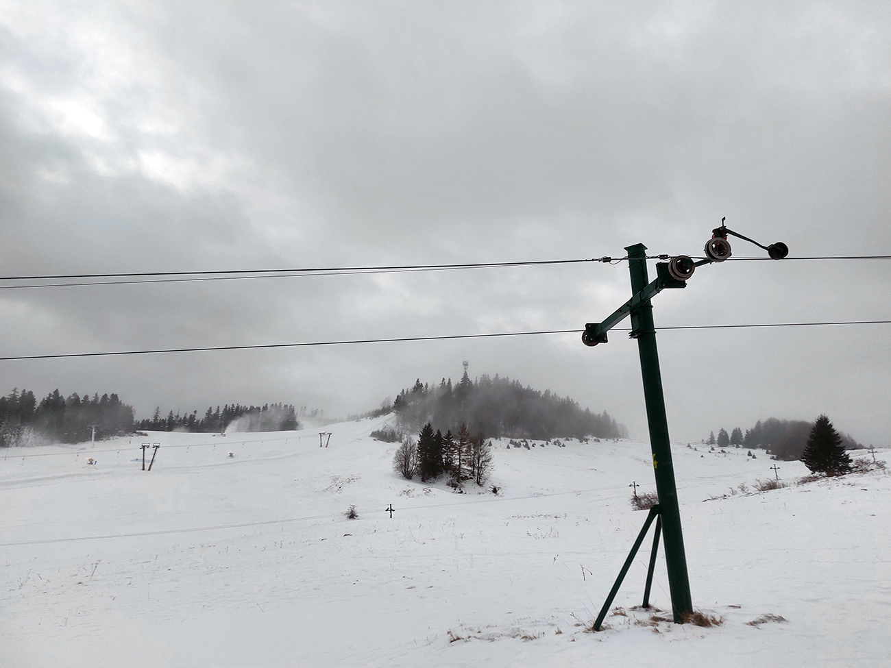 Potom sa konečne podložka zlepšila – aspoň toľko, že som nemusel kľučkovať. Aj Chabenec sa chvíľami ukazoval, potom aj Kotliská. Ale najmä sa ukazovali vľavo provokačne nasvietené Tatry pod modrou oblohou a podobne vpravo oslnené Horehronie. Tak vďaka... Chabenec: musel som znášať. Kotliská: dal som to LTT. Keby tam zas to mlieko nezavadzalo, bolo by to v pohode, tam sa dá vybrať stopa pre zjazd.