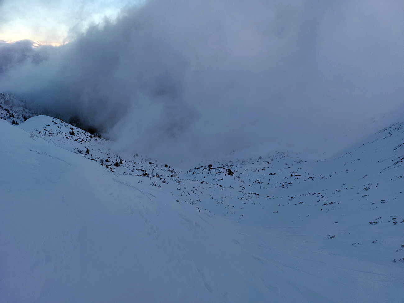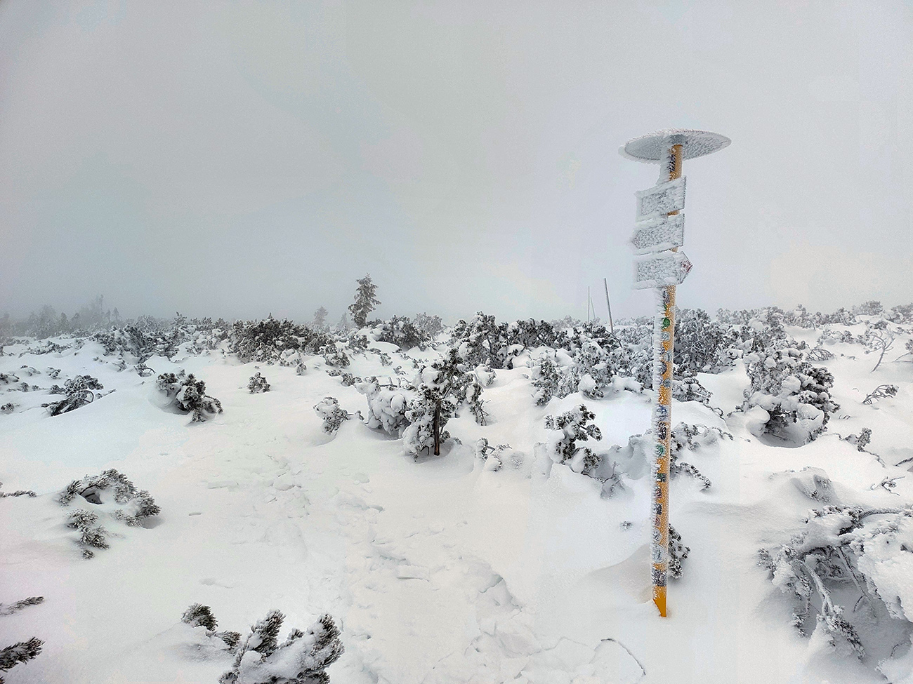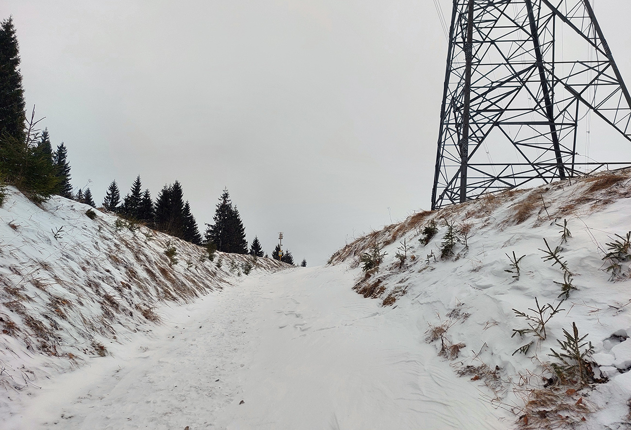 Posledné stúpanie na Poľanu, pásy dole a že hádam aj polyžujem, pod jej sedlom som čakal prašanové orgie. Hej boli by, keby som niečo videl. Ale len smejúce sa oranžové Tatry v diaľke, nad okrajom mraku, to ktorého som sa vnáral. Pod nohy som videl ledva toľko, aby som neponičil výstupové cikcaky.