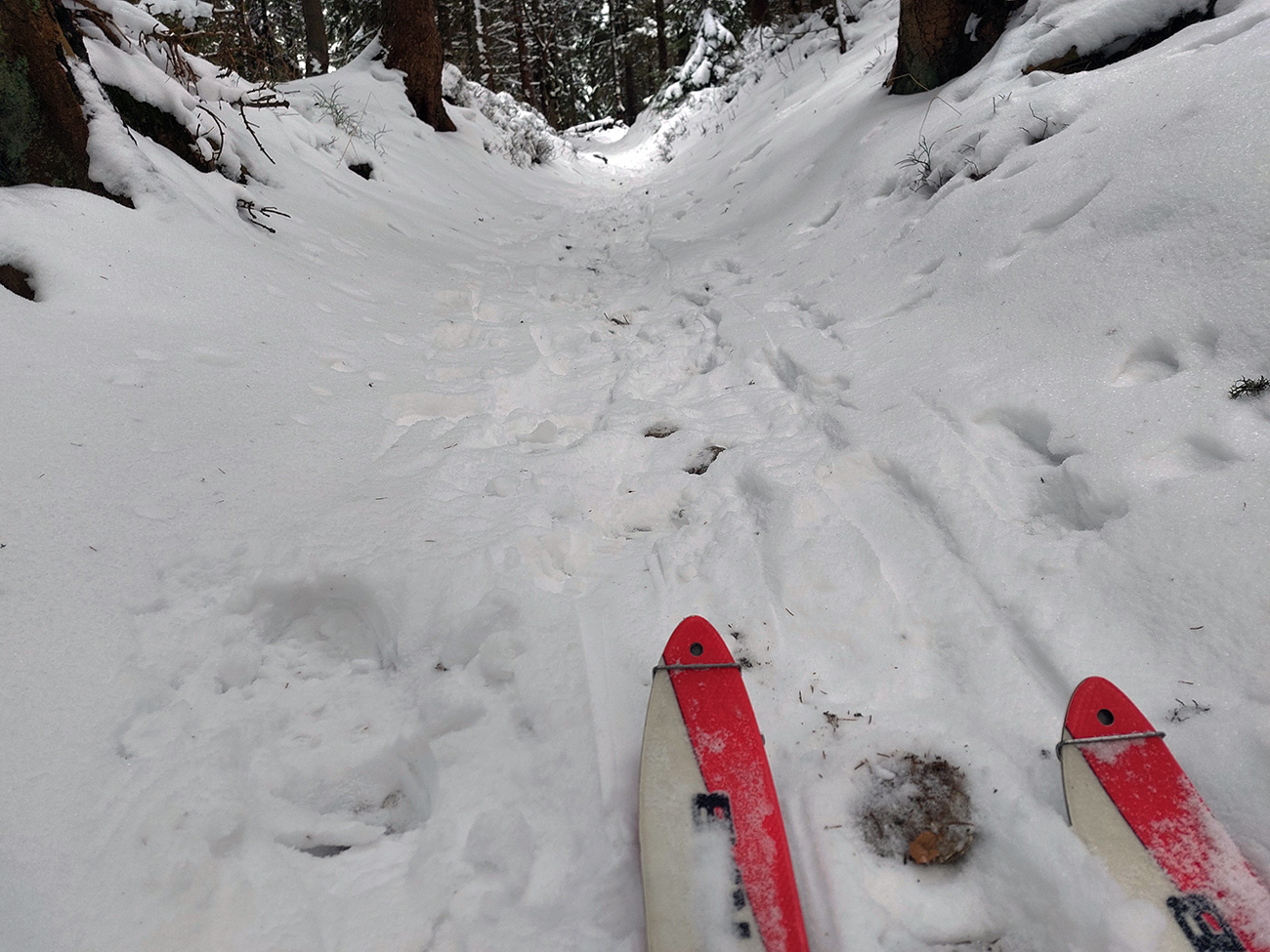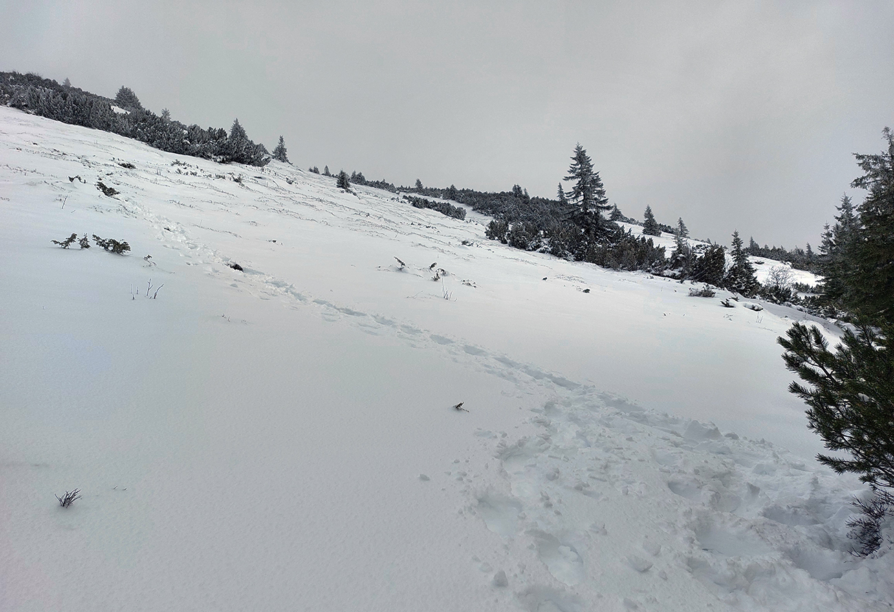 Hej bolo, lepší vietor fúkal. Aj pekné záveje naukladal. A dobre sa to prepadalo, poriadne hlboko. Našťastie aspoň čerstvé stopy po (asi) troch pároch snežníc sa dali občas využiť. Ale aj to len na kúsku medzi stromami.