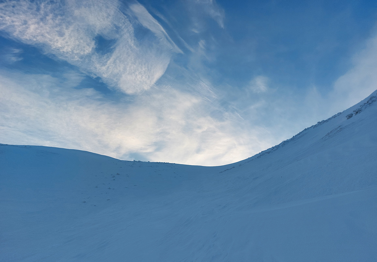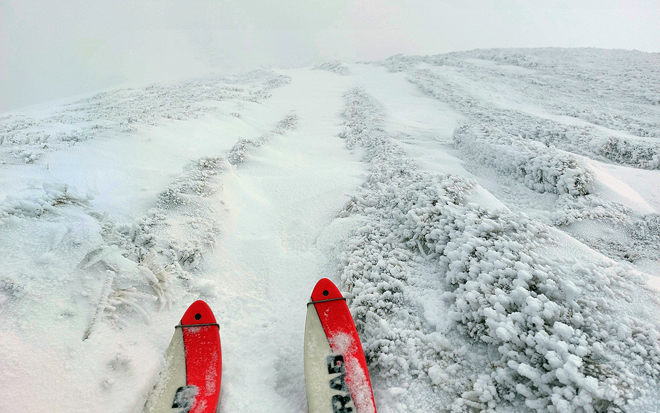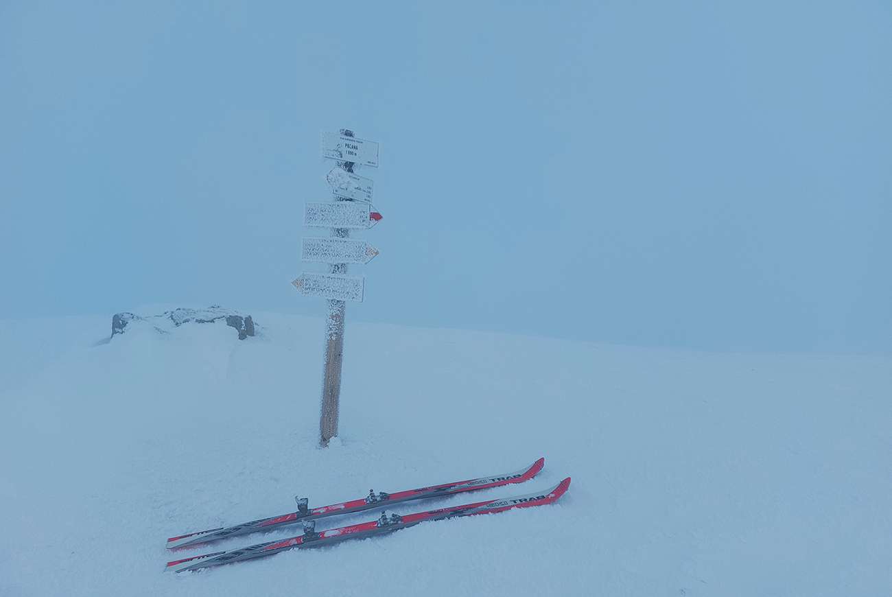 Stúpanie na Prašivú ma na pásoch bavilo len v spodnej časti, aj tam však bolo kameňov hojne. Potom lyže na batoh, inak by to ani nešlo. Aj nad lesom stopa len pre pešiakov, od pešiakov. Vďaka „predchodcom“ za komfortné schodíky a počasiu za posledné rozhľady. Do lyží som naskočil až hore v kosovke, kde sa sklon zmierňuje. Zároveň som ale vliezol do mlieka a jedovatého severáku. Pritom o kus nižšie to vyzeralo, že oblaky sú neškodne vysoko: