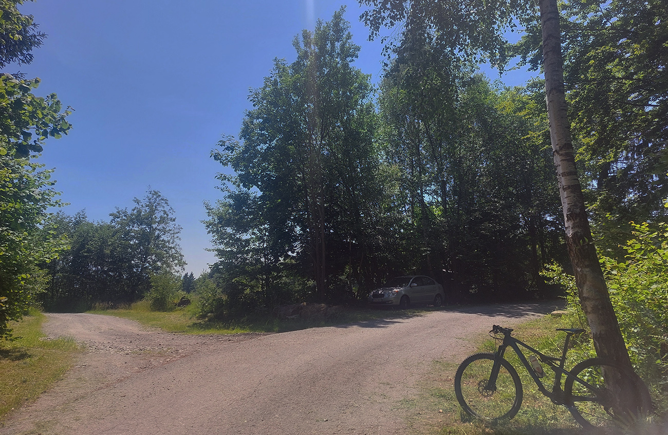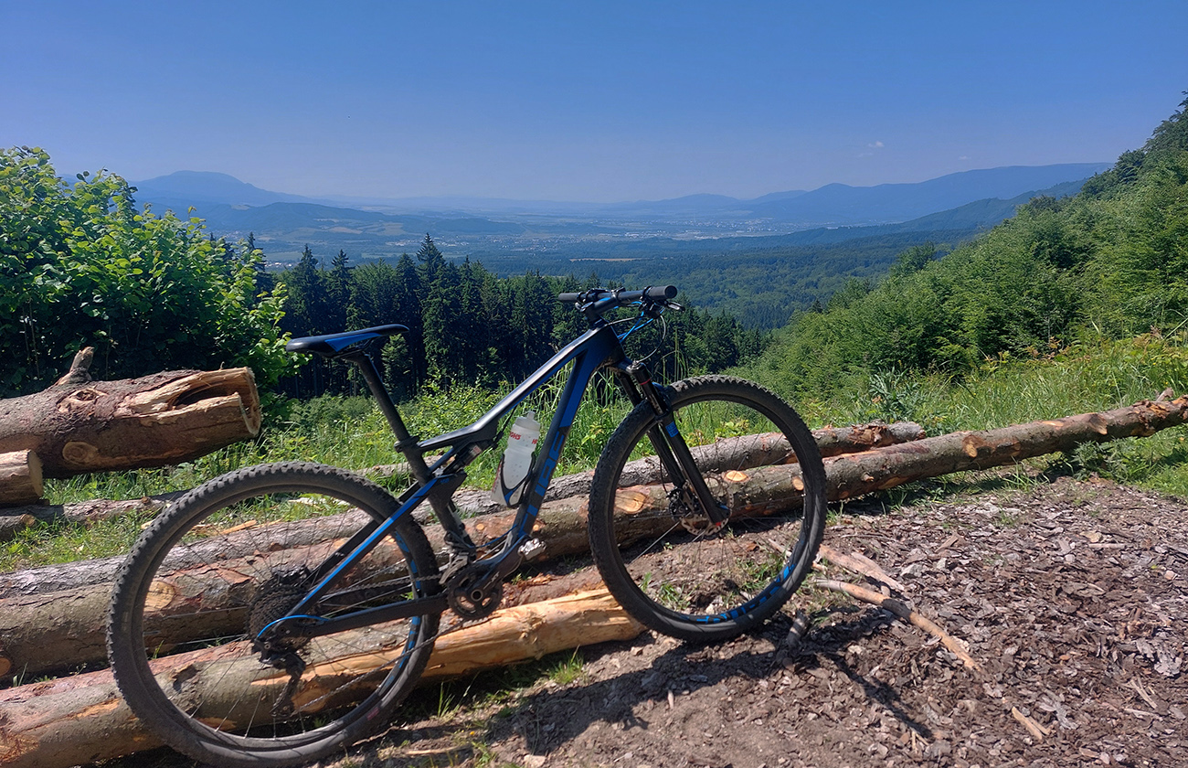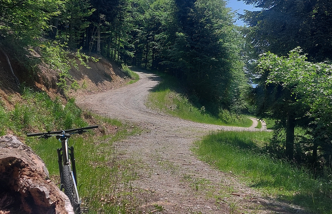 Návrat na makadam, aj popri odpočívajúcich bagroch, a nasledovalo strmé finále so zaradeným „vyprošťovákom“, až na križovatku na Ploštine. 1130 m. n. m. – to len aby bolo jasné, ako vysoko sa až nová cesta štverá. Ešte jedna krátka zachádzka po pohodlnejšej ceste v smere jazdy, otočka a dlhýýýýý zjazd.