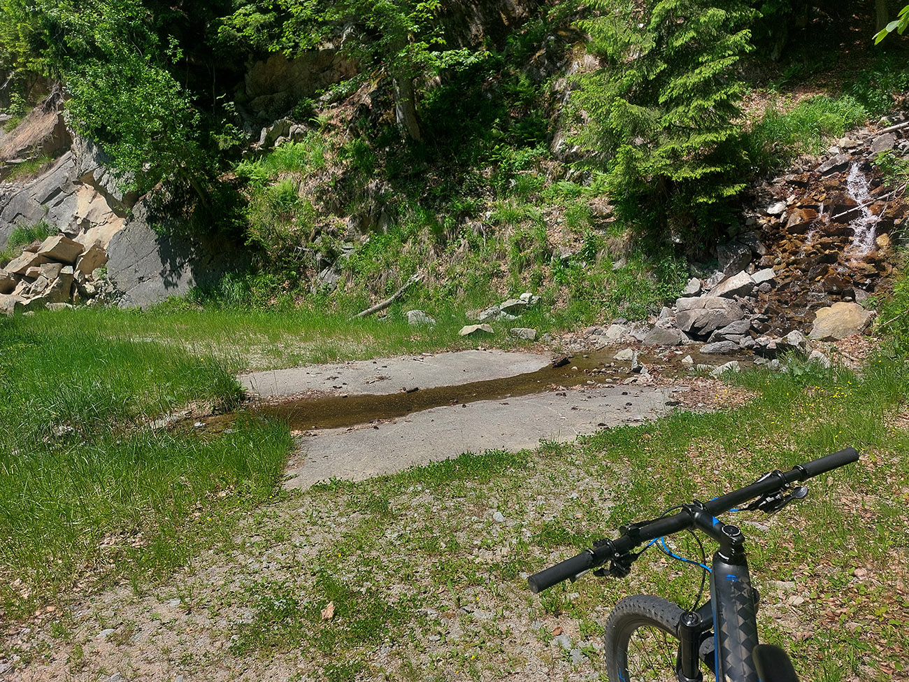 Posledná serpentína pri potoku Studenec aj s rampou a malým vodopádom (a ďalšou vyblednutou eurotabuľou), a o kus nižšie som sa už len dozvedel, že mám poriadne prihamovať, lebo normálne v strede lesa dopravná značka: povolená maximálka 10 km/h!