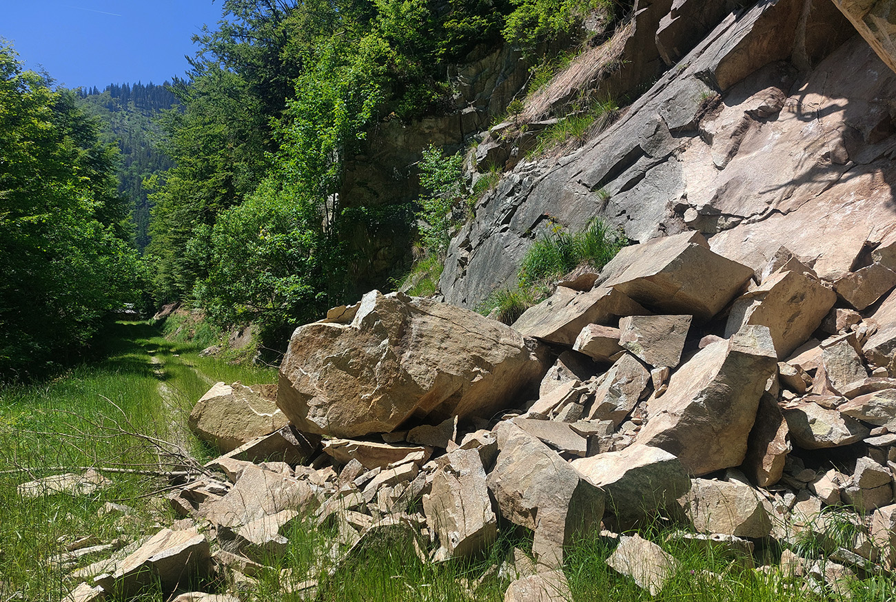Serpentíny až dole, na dno doliny Sudenec, k potoku. Na nich už sú tie spomínané staršie stavebné úpravy, kde príroda už rany bagrom pomaly hojí. Aj tabuľa pri ceste je už vyblednutá. Ale aj toto som si spestril zachádzkou po traverzujúcej zvážnici – vrstevnici, kde to bolo ozaj za odmenu. Síce aj s vybetónovanými brodmi dvoch malých potokov, ale inak veľmi pekné zákutia.