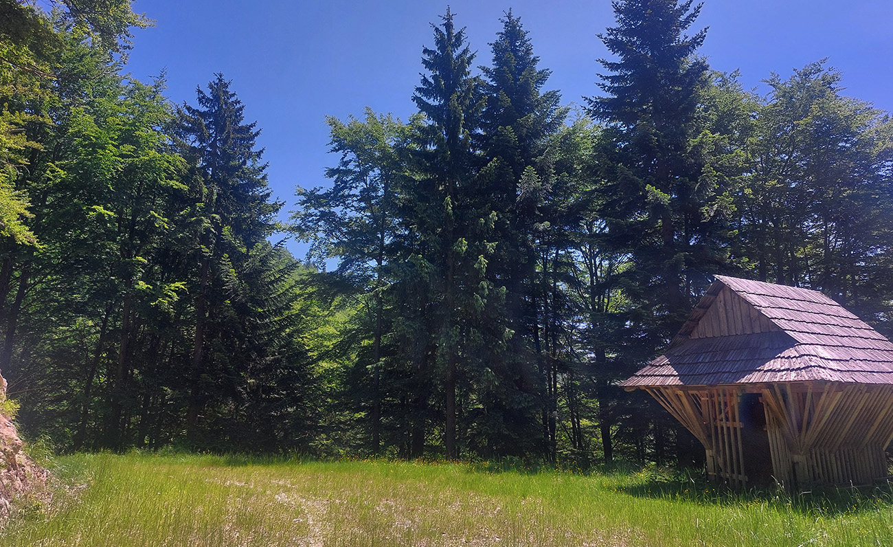 Plazenie do strmých serpentín som si spestril dvoma príjemnejšími (nerekonštruovanými) odbočkami, takmer po vrstevniciach, za výhľadmi na západný svah Chlebu na druhej strane Snilovskej doliny. A na poľovnícku chatu pod cestou, aj s odparkovaným autom.