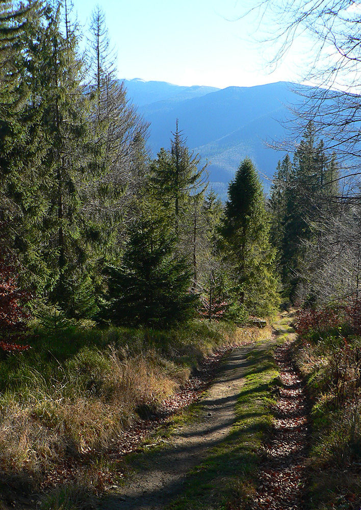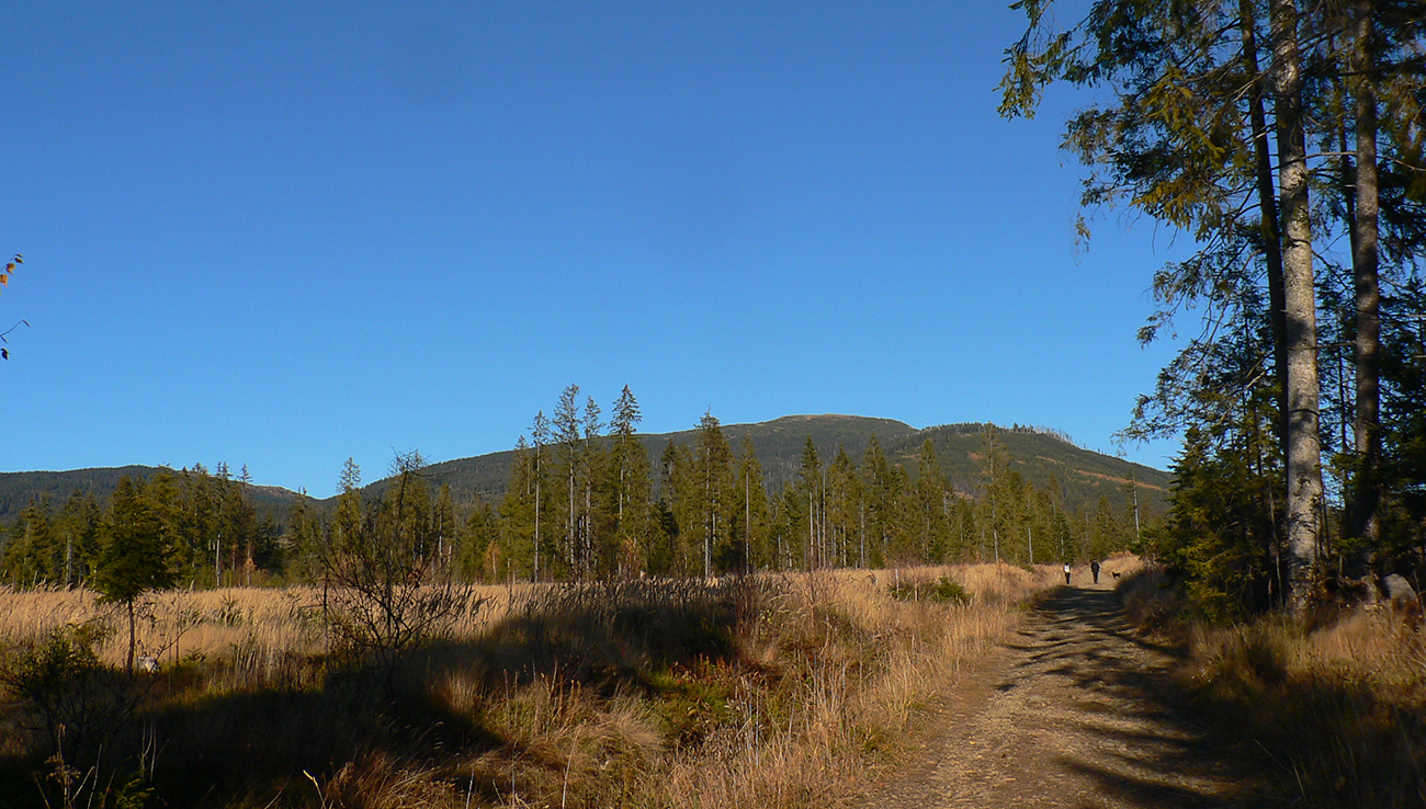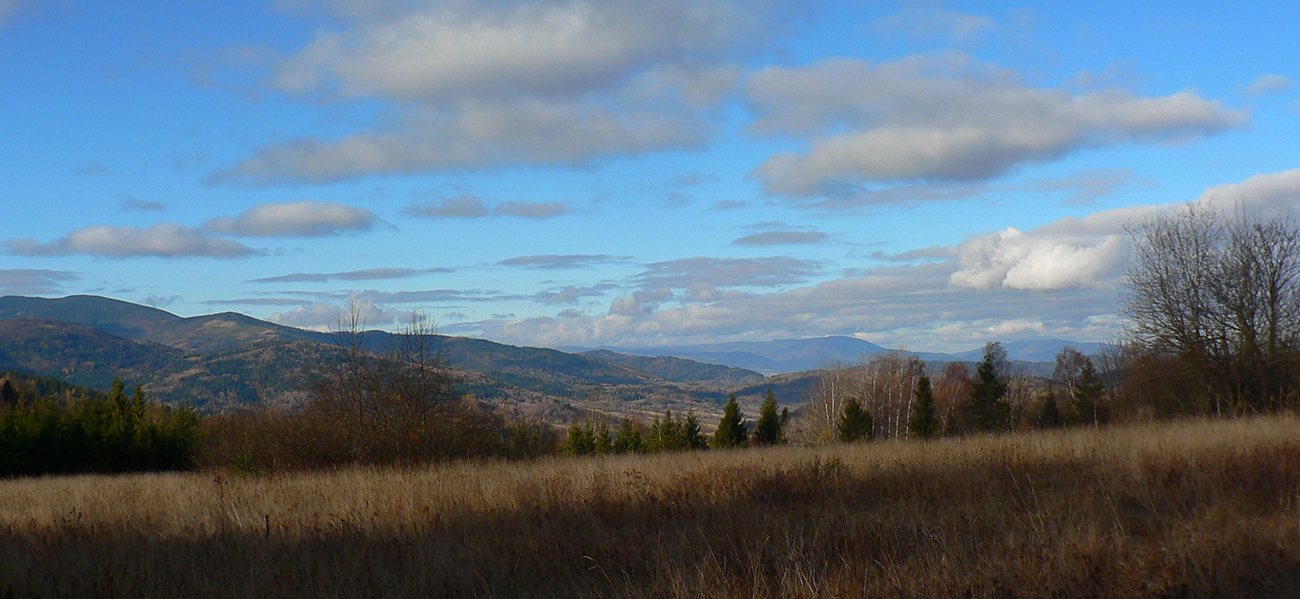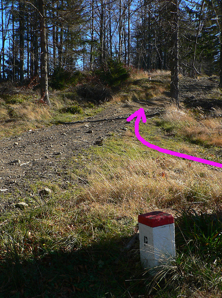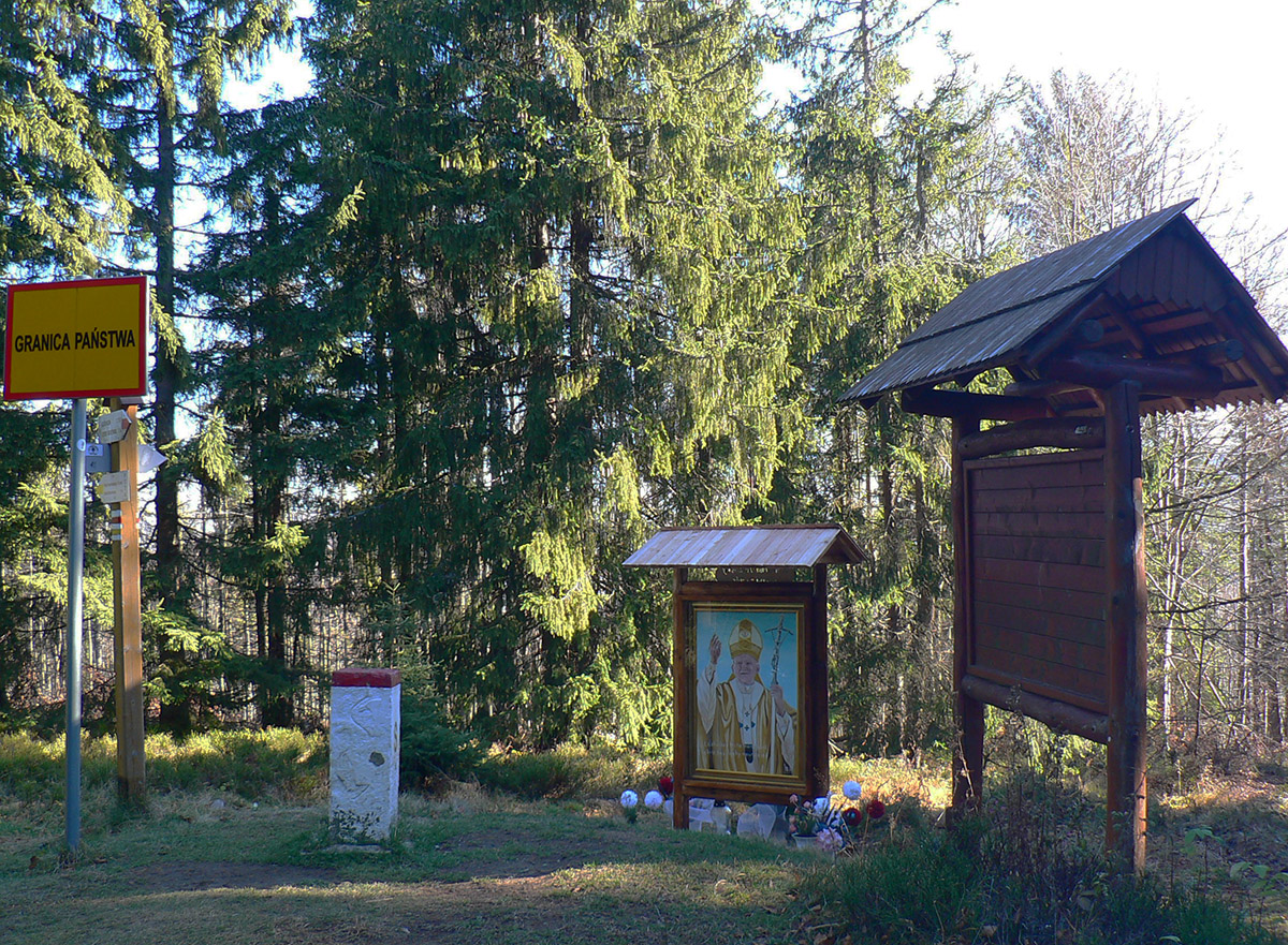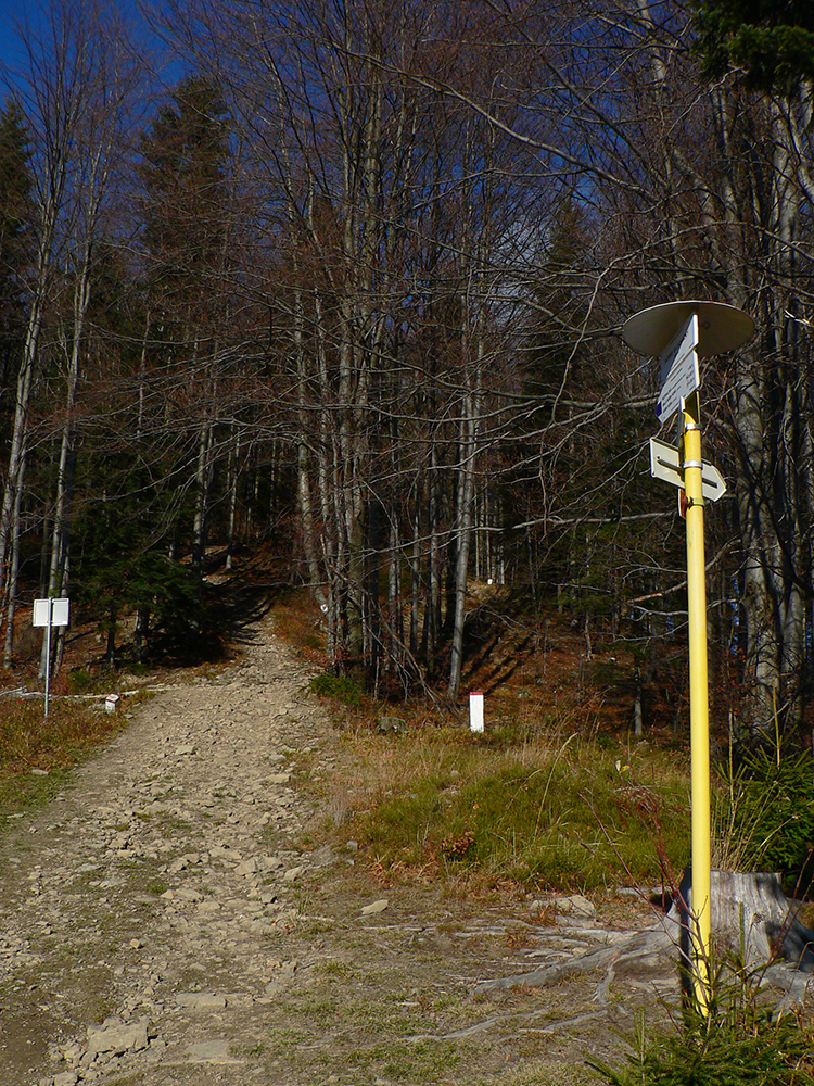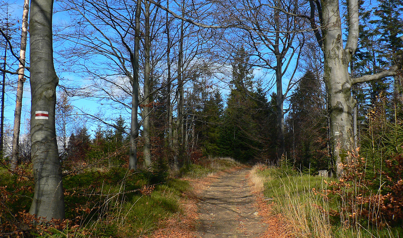 Úvod, to je dosť asfaltu z konečnej autobusu až hlboko do doliny Polhoranky. Cestou jedno miestne otužilecké kúpalištiatko v potoku a o kus vyššie jedna studnička. Potom odbočka doľava, do mierneho stúpania po miestnej žltej značke. Pevná, kamienkami vyložená, už nie asfaltová lesná cesta. Z nej ešte pár metrov po lesnom chodníku a už je tu „hrebeňovka“ pri smerovníku Martoša. Alebo teda granica państwa, poľská červená a naša modrá, (ktorú moc nevidieť). Z okraja veľkej lúúky je tu výhľad do strakatého poľského podhoria, obrúbeného v diaľke na západe masívami Sliezskych Beskýd. Potom už ponor do lesa. Červená značka je inak aj „Glówny szlak beskidzki“ – najdlhšia poľská turistická trasa (+/-500 km), čiže niečo ako naša „esenpéčka“.