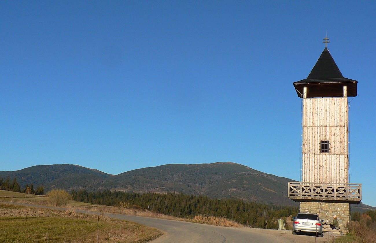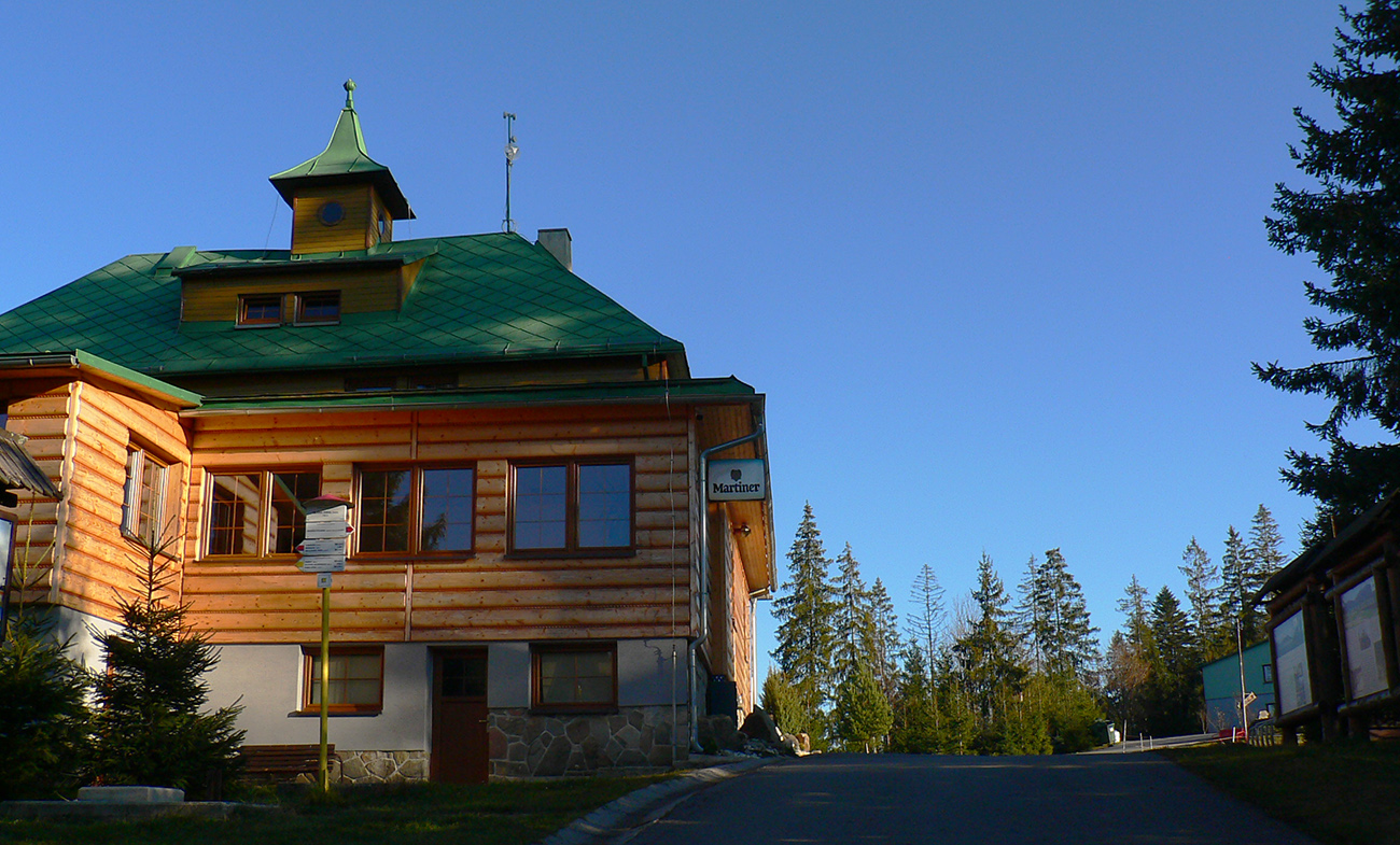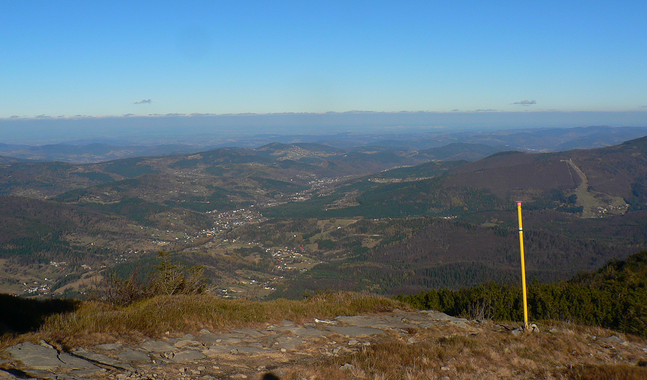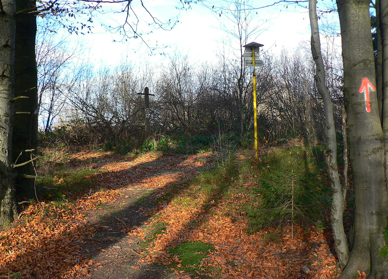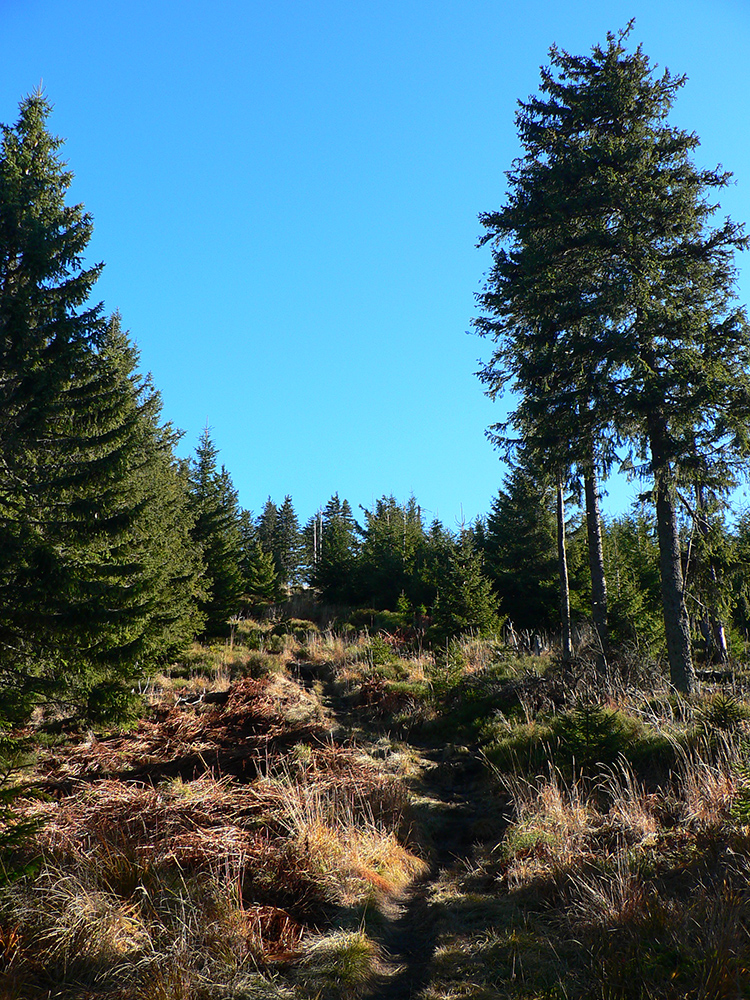 Úvod, to je dosť asfaltu z konečnej autobusu až hlboko do doliny Polhoranky. Cestou jedno miestne otužilecké kúpalištiatko v potoku a o kus vyššie jedna studnička. Potom odbočka doľava, do mierneho stúpania po miestnej žltej značke. Pevná, kamienkami vyložená, už nie asfaltová lesná cesta. Z nej ešte pár metrov po lesnom chodníku a už je tu „hrebeňovka“ pri smerovníku Martoša. Alebo teda granica państwa, poľská červená a naša modrá, (ktorú moc nevidieť). Z okraja veľkej lúúky je tu výhľad do strakatého poľského podhoria, obrúbeného v diaľke na západe masívami Sliezskych Beskýd. Potom už ponor do lesa. Červená značka je inak aj „Glówny szlak beskidzki“ – najdlhšia poľská turistická trasa (+/-500 km), čiže niečo ako naša „esenpéčka“.