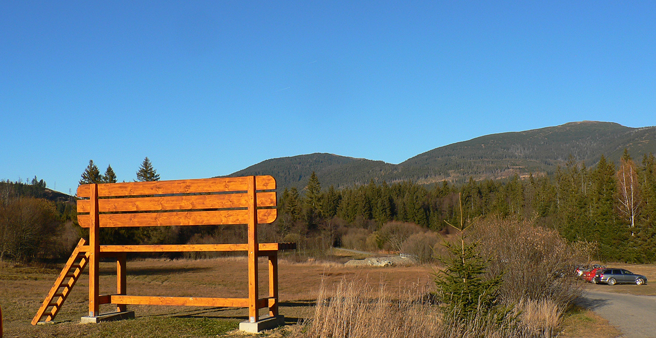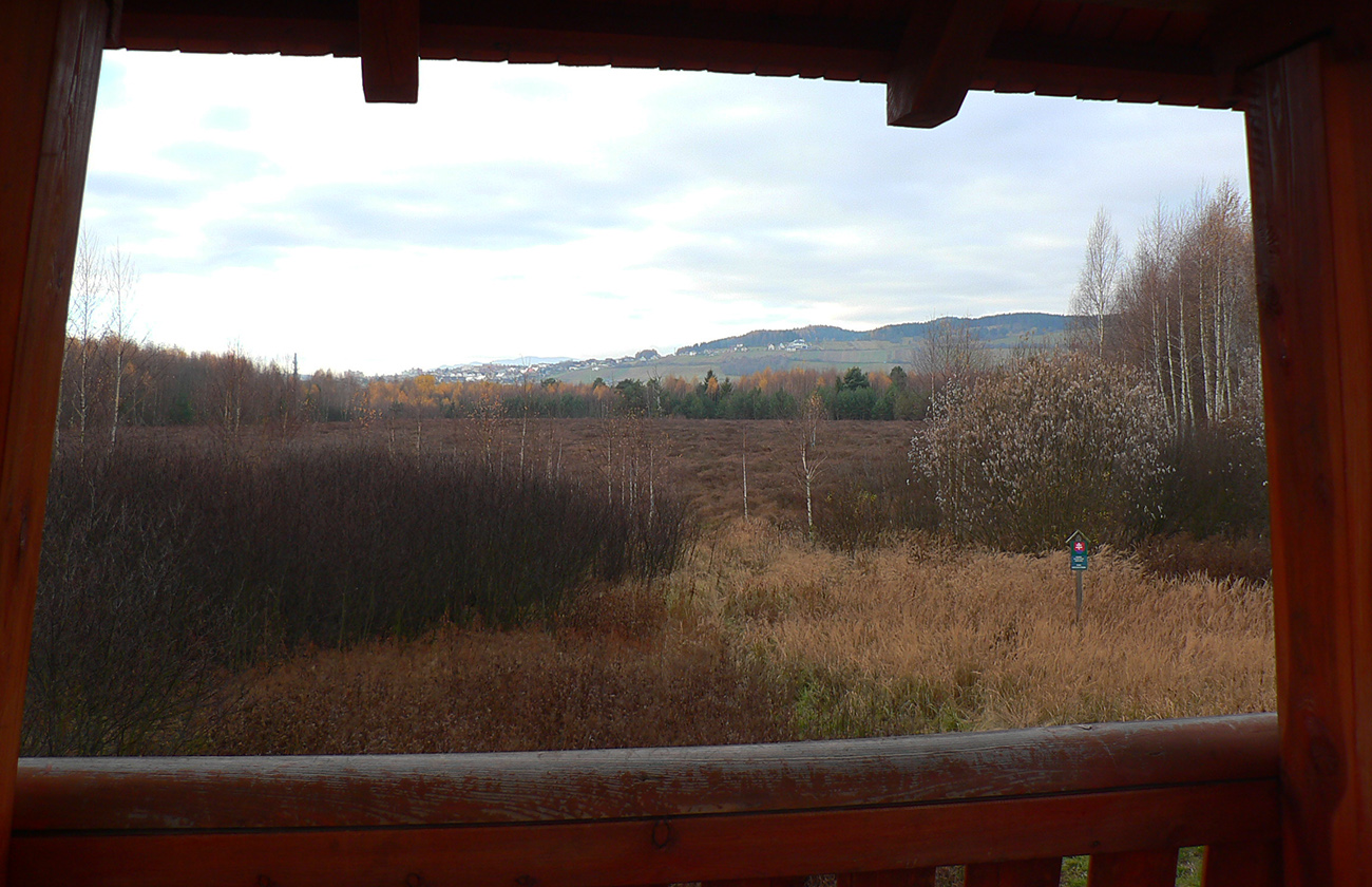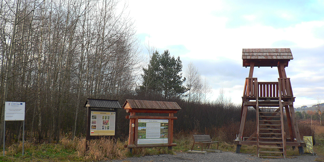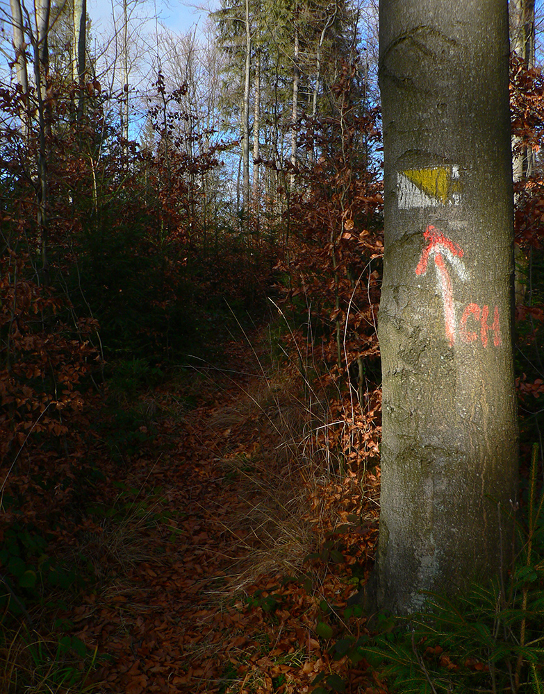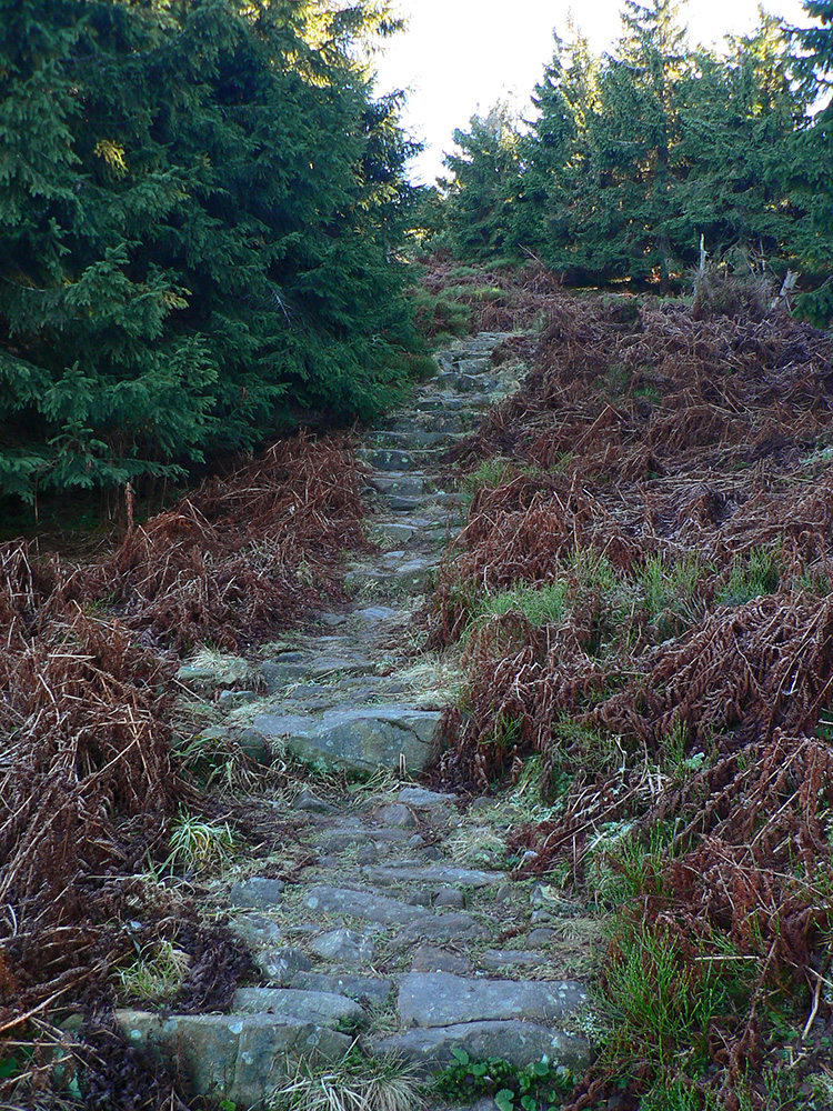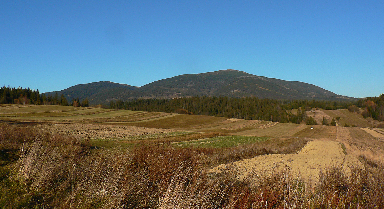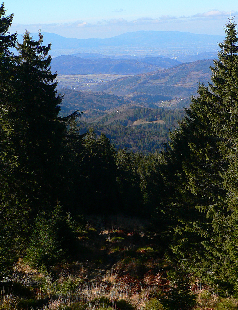 Úvod, to je dosť asfaltu z konečnej autobusu až hlboko do doliny Polhoranky. Cestou jedno miestne otužilecké kúpalištiatko v potoku a o kus vyššie jedna studnička. Potom odbočka doľava, do mierneho stúpania po miestnej žltej značke. Pevná, kamienkami vyložená, už nie asfaltová lesná cesta. Z nej ešte pár metrov po lesnom chodníku a už je tu „hrebeňovka“ pri smerovníku Martoša. Alebo teda granica państwa, poľská červená a naša modrá, (ktorú moc nevidieť). Z okraja veľkej lúúky je tu výhľad do strakatého poľského podhoria, obrúbeného v diaľke na západe masívami Sliezskych Beskýd. Potom už ponor do lesa. Červená značka je inak aj „Glówny szlak beskidzki“ – najdlhšia poľská turistická trasa (+/-500 km), čiže niečo ako naša „esenpéčka“.