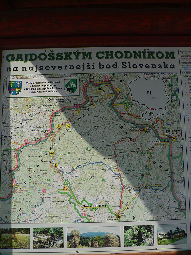 Takže ide sa hore - stúpanie je miestami poriadne strmé, ale strieda sa to. Čo je ale najzaujímavejšie, že na konci najstrmšieho úseku, kde sa hranica dočasne stáča na juhovýchod, je miesto položené hádam aj severnejšie ako samotný vrchol Modralovej so smerovníkom a označením „severného pólu Slovenska“. K tomu treba prejsť ešte asi 1,5 kilometra. Nemôžem si pomôcť, ale zdá sa mi, že aj mapa to potvrdzuje :-) Inak ani ten smerovník na Modralovej nie je na jej najvyššom bode – ten je trochu skôr na poľane nad salašom, odkiaľ je pekný výhľad na sever, na roztrúsené osady pod protiľahlým kopcom Beskidek (1045 m):