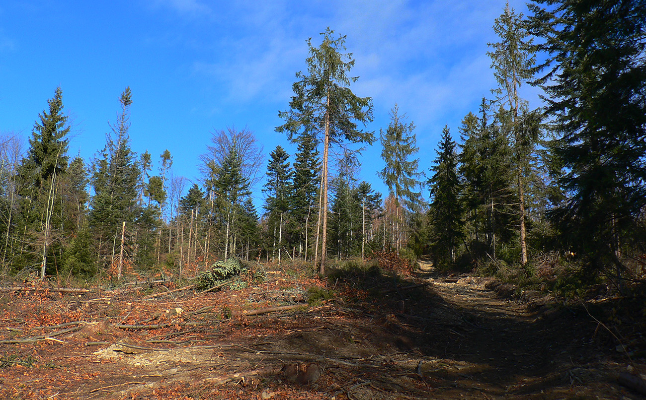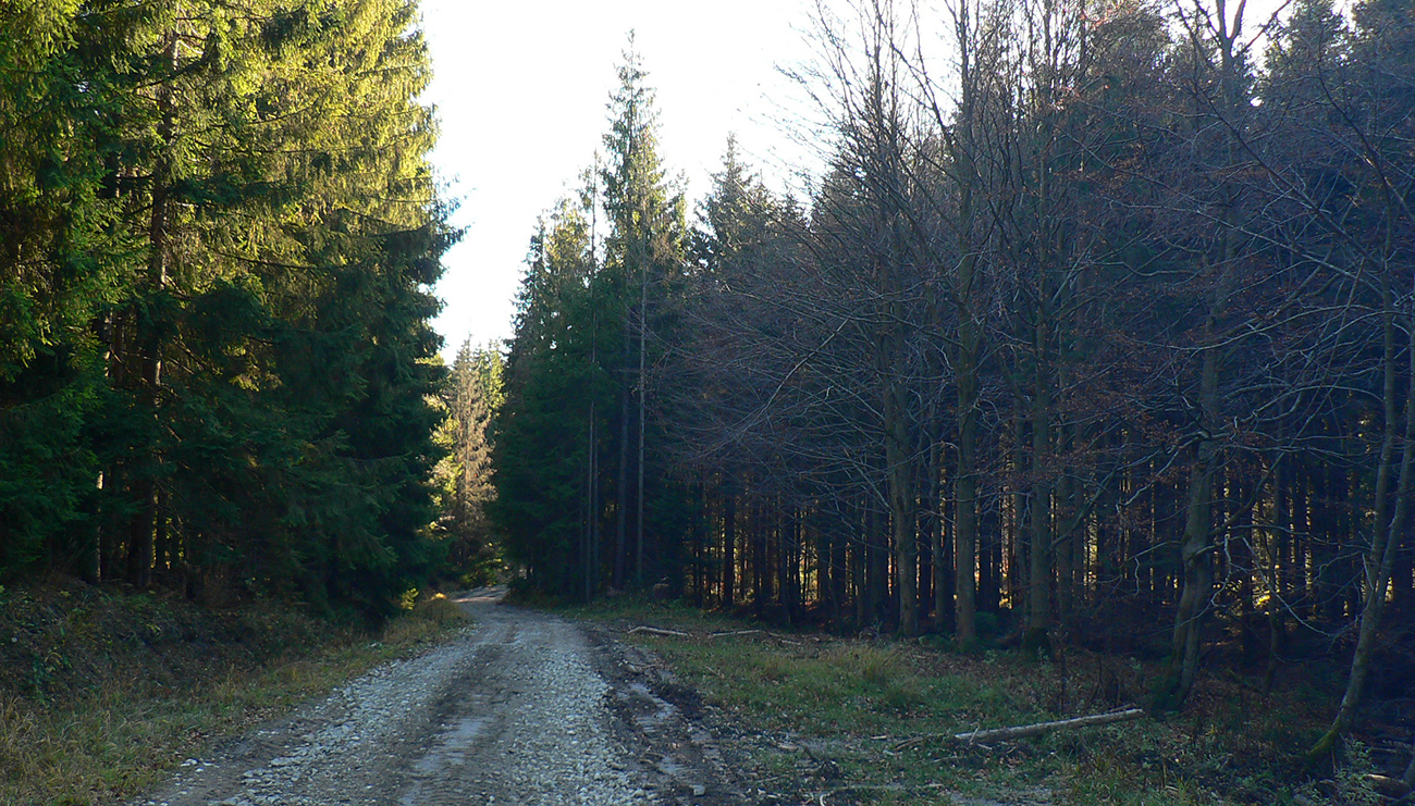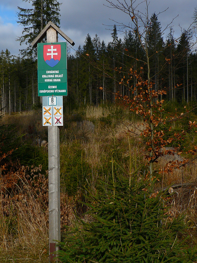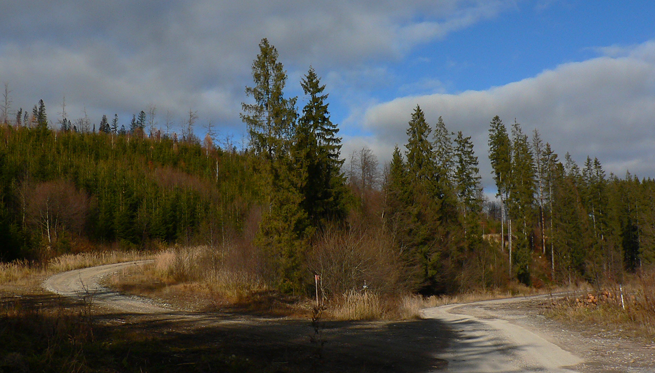 Smerovník ukazuje tri hodiny do Oravskej Polhory k busu, mám dve :-) Tak trochu kopem do vrtule. Najskôr chvíľa kľučkovania po holiach pomedzi kosovku a jalovce, potom strmo dole lesom. Žiaľ, veľmi rýchlo sa chodník mení na hnusnú zvážnicu – ja som ju mal navyše čerstvo načechranú po ťahaní dreva. Takto až po smerovník Borsučie, potom znovu príjemnejší chodník, až dole k potoku. A tam už klasika, najskôr šotolina, potom asfalt. Napriek tomu prechádzka príjemná, lesy tu vyzerajú zväčša dobre. Jasné, že sa v nich hospodári, veď drevo treba. Len by to mohlo ísť bez idiotských nápisov o „ochrane pôdy“ alebo o „lesoch ako chrámoch harmónie“. Najmä v susedstve obrovskej rúbane to pôsobí – no ako to slušne povedať? Škodoradostne?