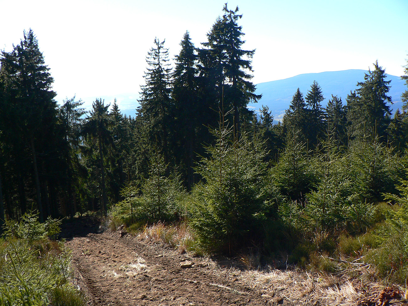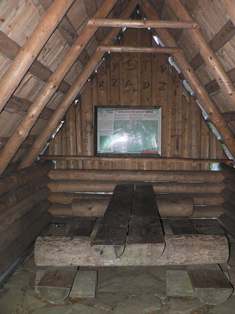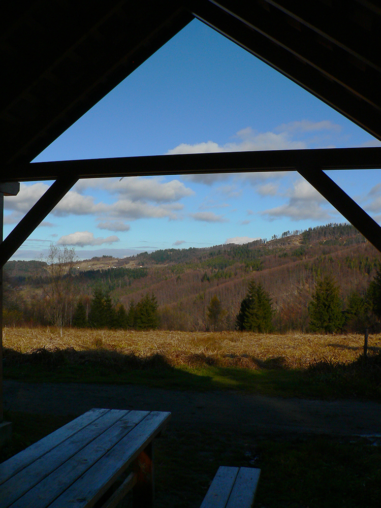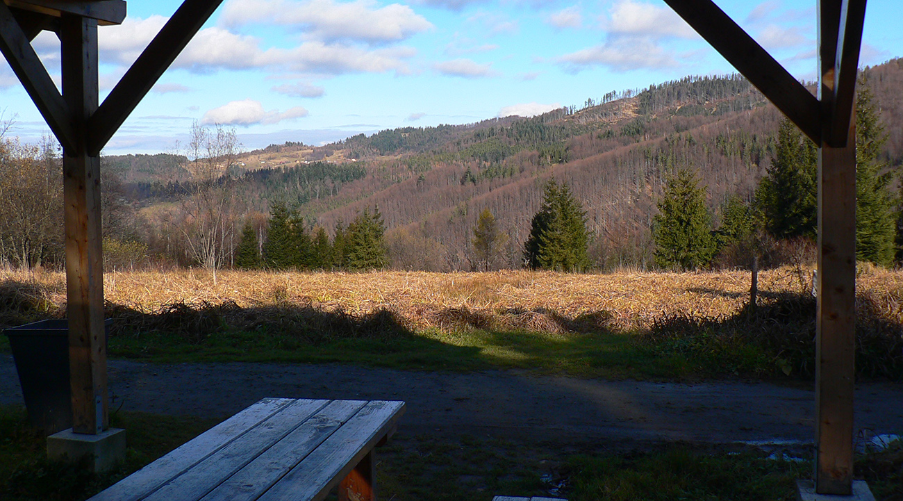 Nasleduje plynulé stúpanie na Javorinu, hraničný priesek je dosť široký. Ale často aj rozvláčený ťahaním dreva, na oboch stranách sú hospodárske lesy. Výhľadov pomenej a keď, tak na západ, na Žywiecke Beskydy. Za vrcholom zase strmé klesanie a dve odbočky: ku jednej útulni a nižšie k jednému prístrešku (všetko na poľskú stranu). Na chate možnosť dotankovať a v prístrešku možnosť dobiť baterky – normálne je tam solárny panel a dve zástrčky, až som čumel! Prístrešok je už na poľane Głuchaczky, za ktorou začína ďalšie dlhšie stúpanie, už na Modralovú.
