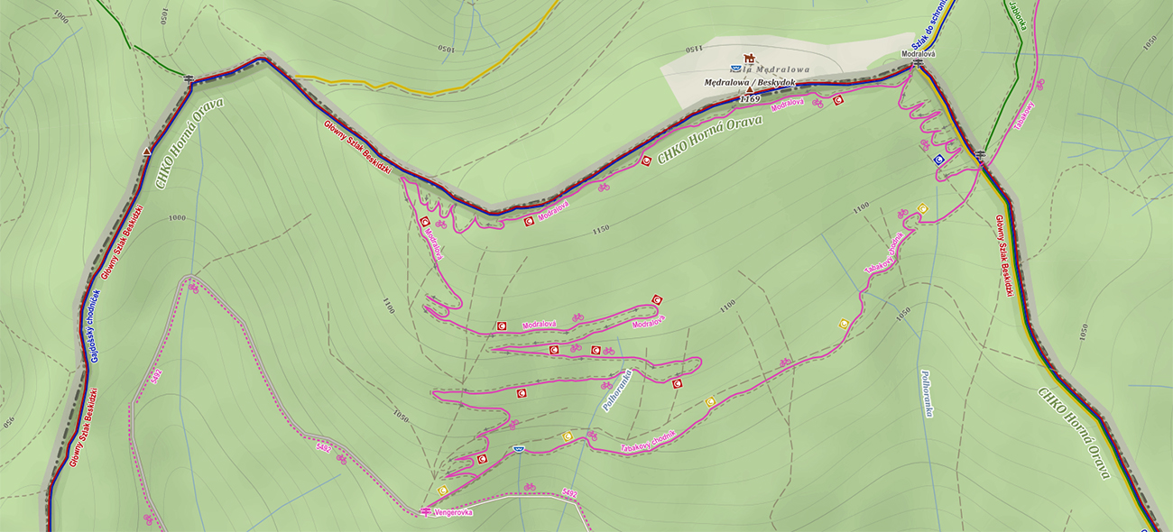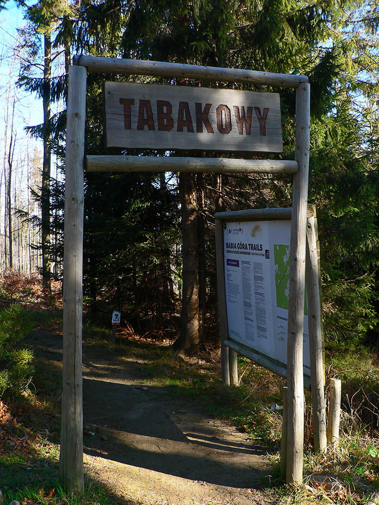 Z Modralovej ďalšie strmé, aj keď nie veľmi dlhé klesanie do Jaloveckého sedla, a ako inak – na juh. V prieseku nad chodníkom párkrát prebliknú vrcholy oboch Babích hôr. Čo ale zaujme, to sú serpentíny vypipľaných singlíkov na pravej strane – zrejme slovenský príspevok ku rozsiahlej sieti cyklochodníkov na poľskej strane. Tento má názov Tabakowy a aj keď je úzky, je značený ako obojsmerný, aby sa dalo na bajku pohodlne dostať hore na kopec. Preto ani jeho sklon nie je veľký. Podľa mapy (mapy.cz) sa tá Modralová dá dokonca zokruhovať cez vrchol: