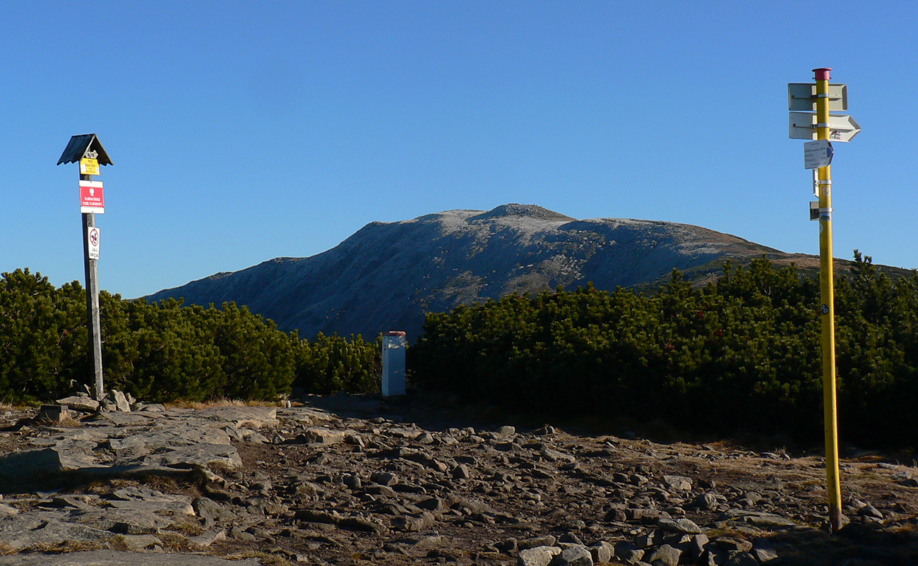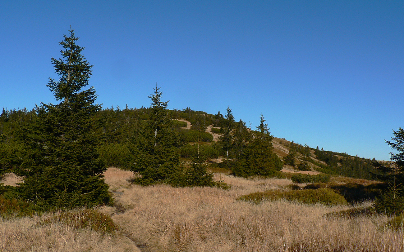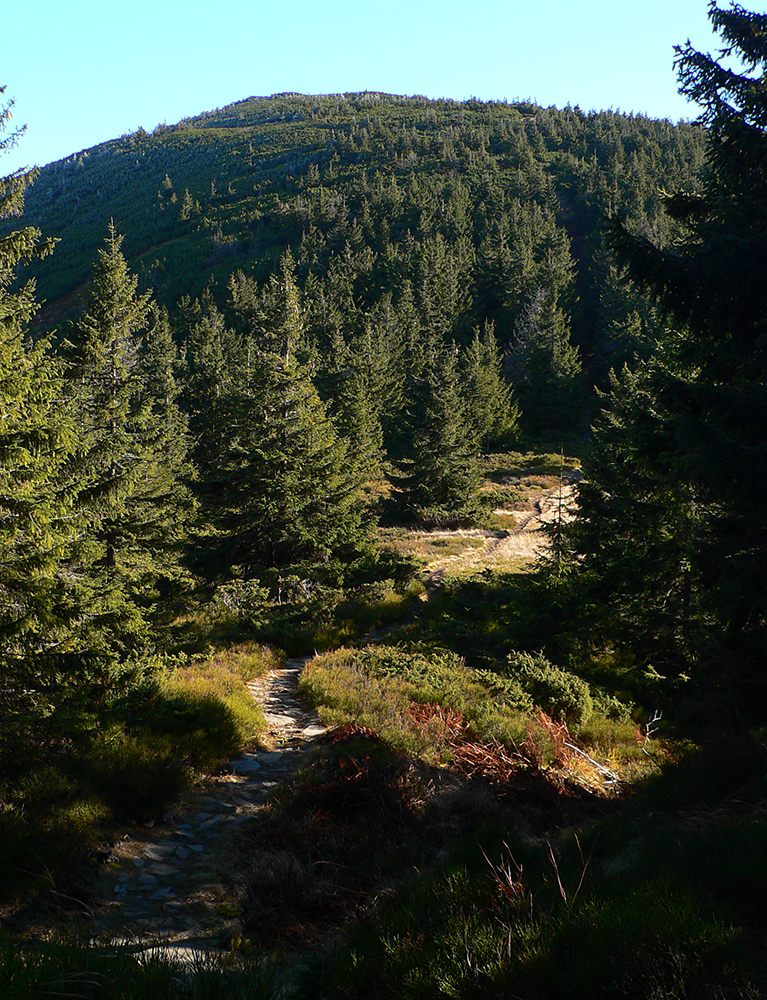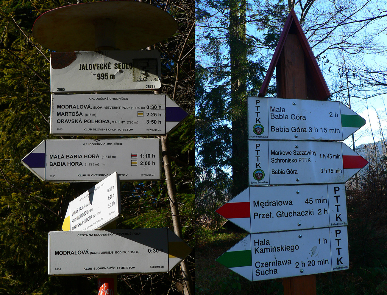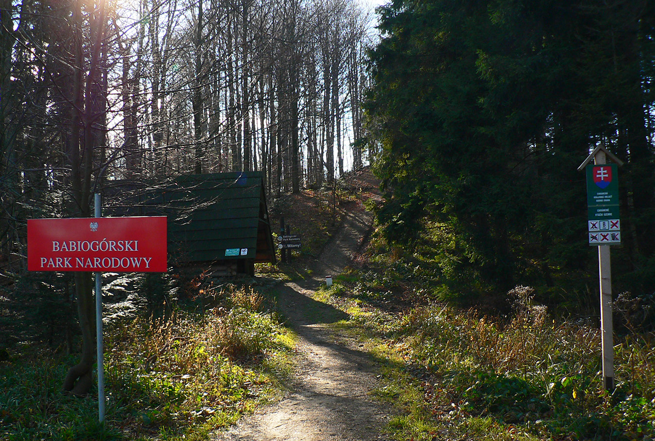 Posledné a najdlhšie stúpanie na koniec – na Malú Babiu horu. Najskôr široký hraničný priesek, potom uvítacia tabuľa a prístrešok pri vstupe do „Parku narodowego“ a potom už len strmý chodník. Len sa poľskej strane taký pralesovitý, na našej furt presvitajú rúbaniská. Vyššie sa stromy zmenšia, priestor sa viac otvorí do šírky, pred vrcholom pod nohami dokonca „dlažba a schody“. Ale výhľady sú až zhora, od vrcholového smerovníka. Zase najlepšie do Poľska, na našej strane zavadzia slnko.