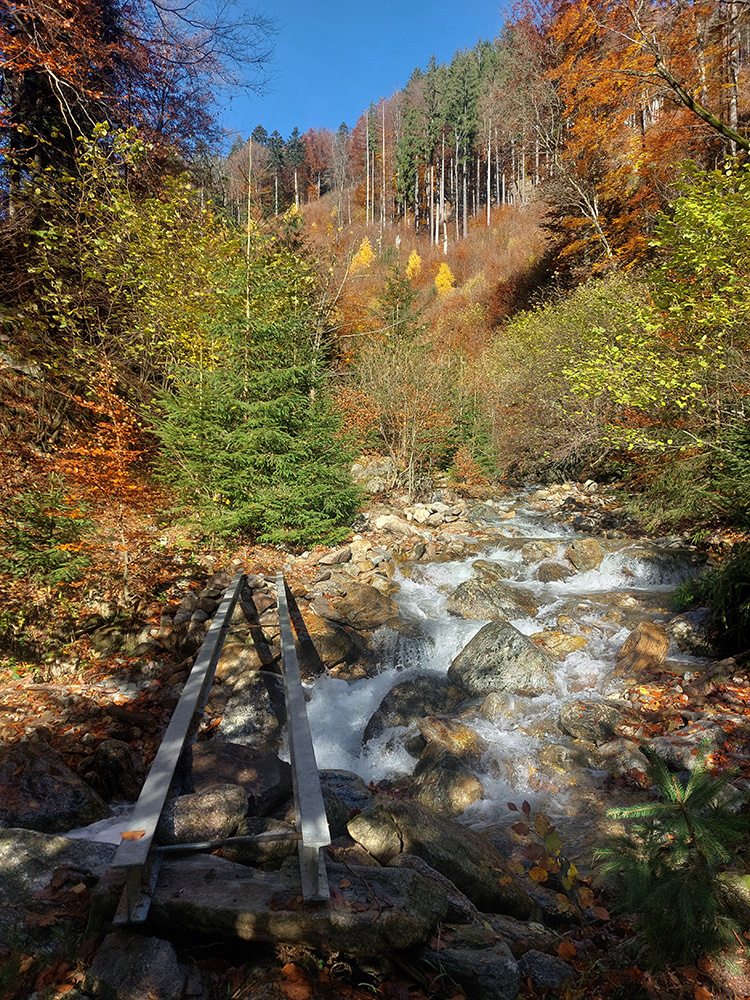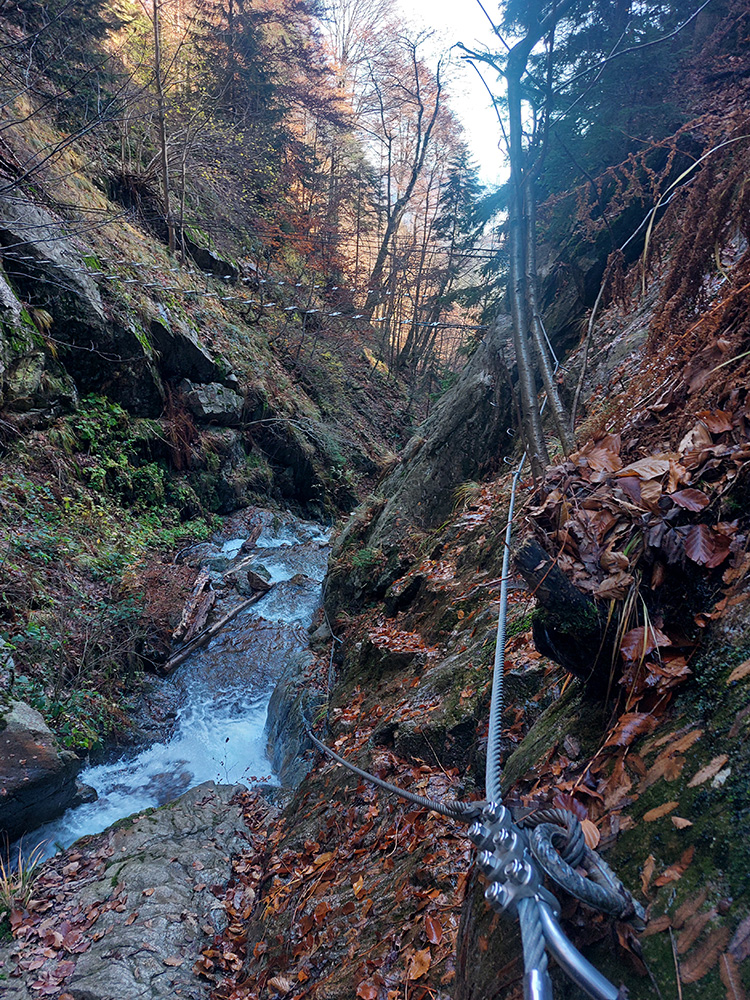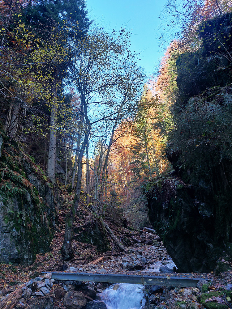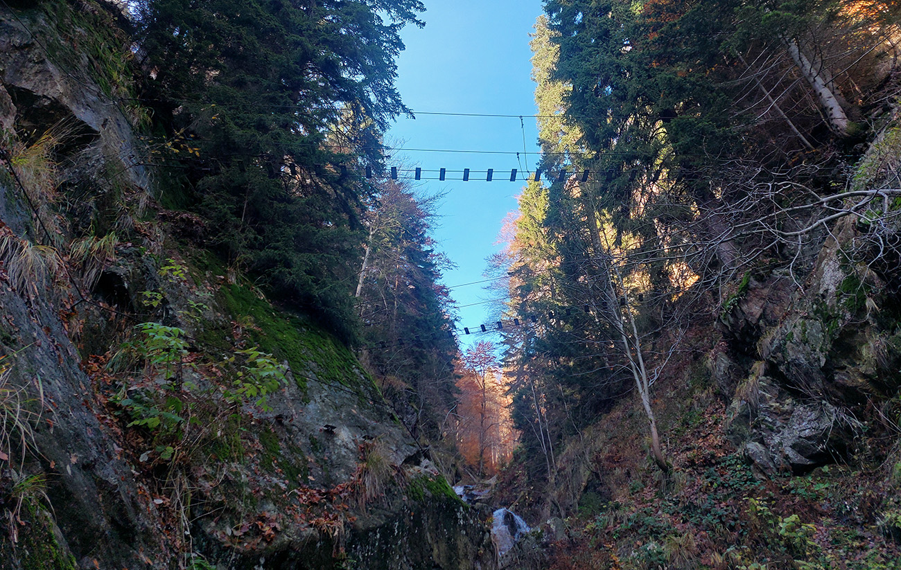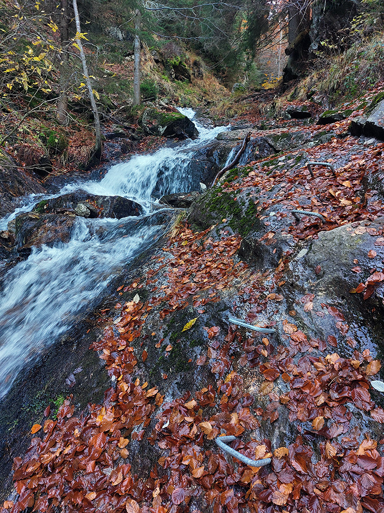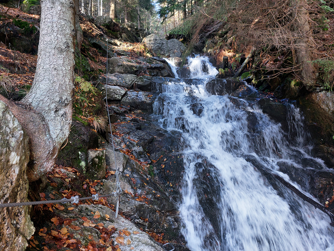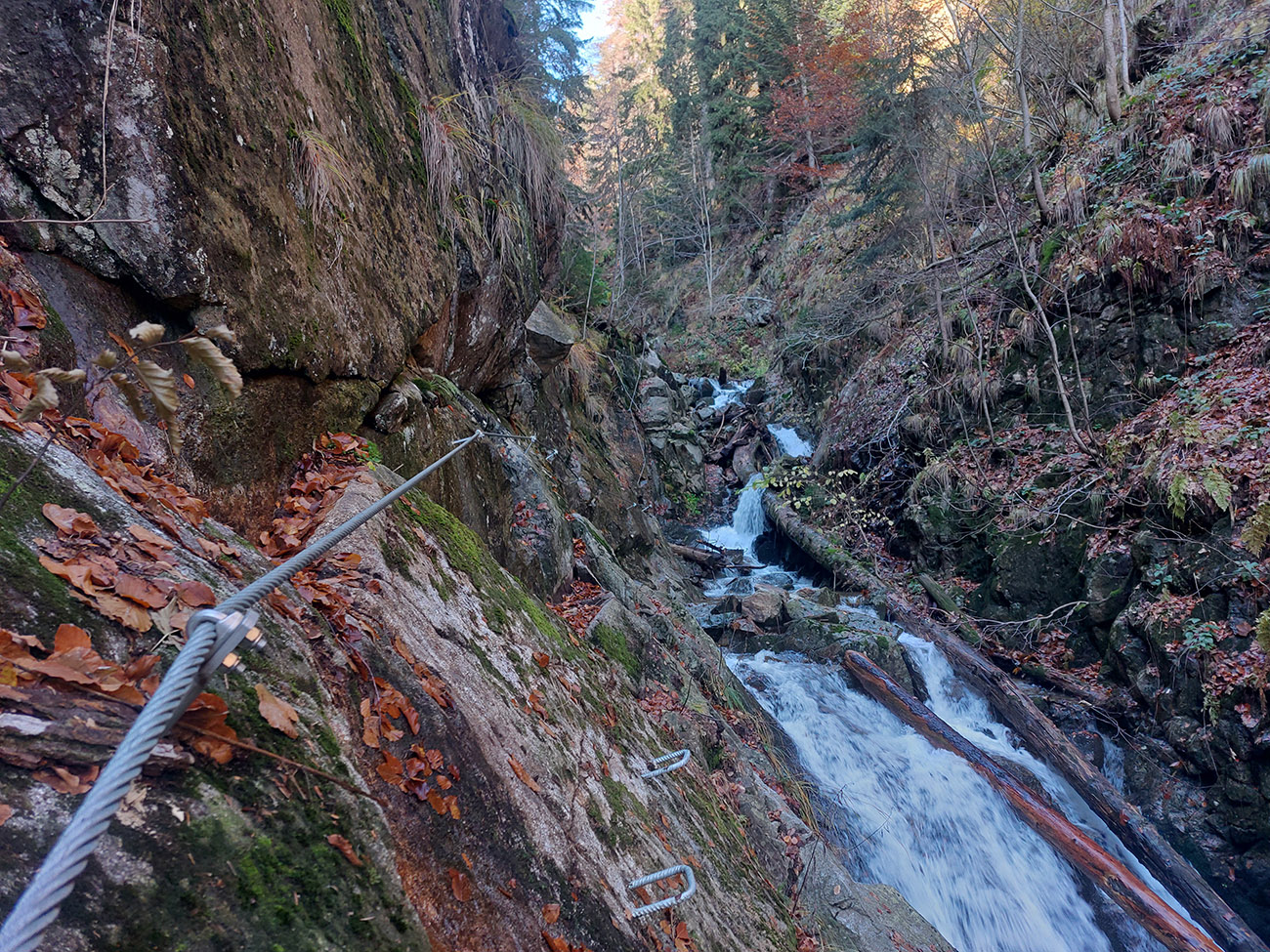 Po silných búrkach v polovici septembra sa Mlynskou dolinou a jej Pivovarským potokom prehnala blesková povodeň a trochu to tam „upratala“. Potok si na pár miestach preložil koryto, najmä v spodnej časti červeno značeného chodníka, hneď nad chatami. Aj parkovisko trochu „upravil“ a pobabral pár kusov vybavenia ferraty. Bežala zbierka na Donio.sk a jesennú sezónnu uzáveru využili dobrovoľníci na pár nevyhnutných opráv a aj úprav chodníka. Potom už jelene doručali, tak od 1.11. je ferrata otvorená znovu, je komfortne priechodná v celej dĺžke: niečo vyše štyroch kilometrov a 750 výškových metrov. Viac údajov škoda dávať, všetko je na STRÁNKE ferraty, a aj tak to tam už všetci poznajú :-) Jesenné usmoklené počasie sa ale pred dušičkovým víkendom konečne umúdrilo a nechalo prírode naplno sa vyfarbiť, no nechoď tam...