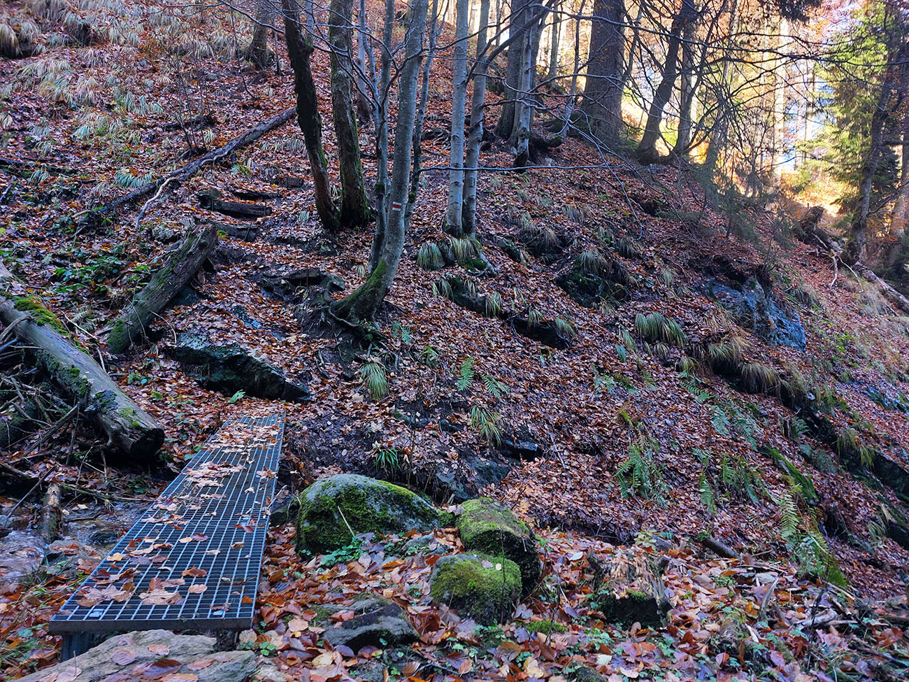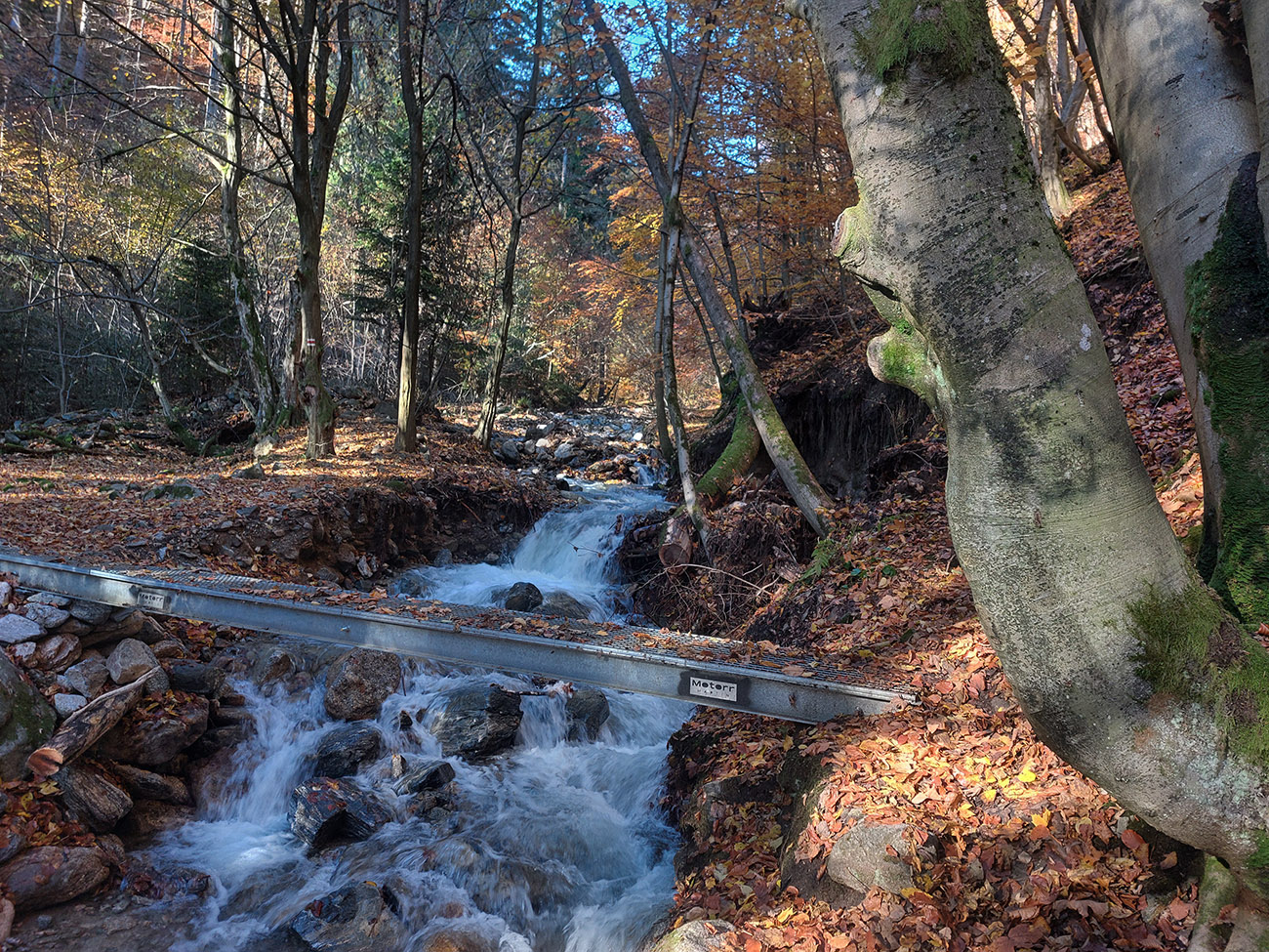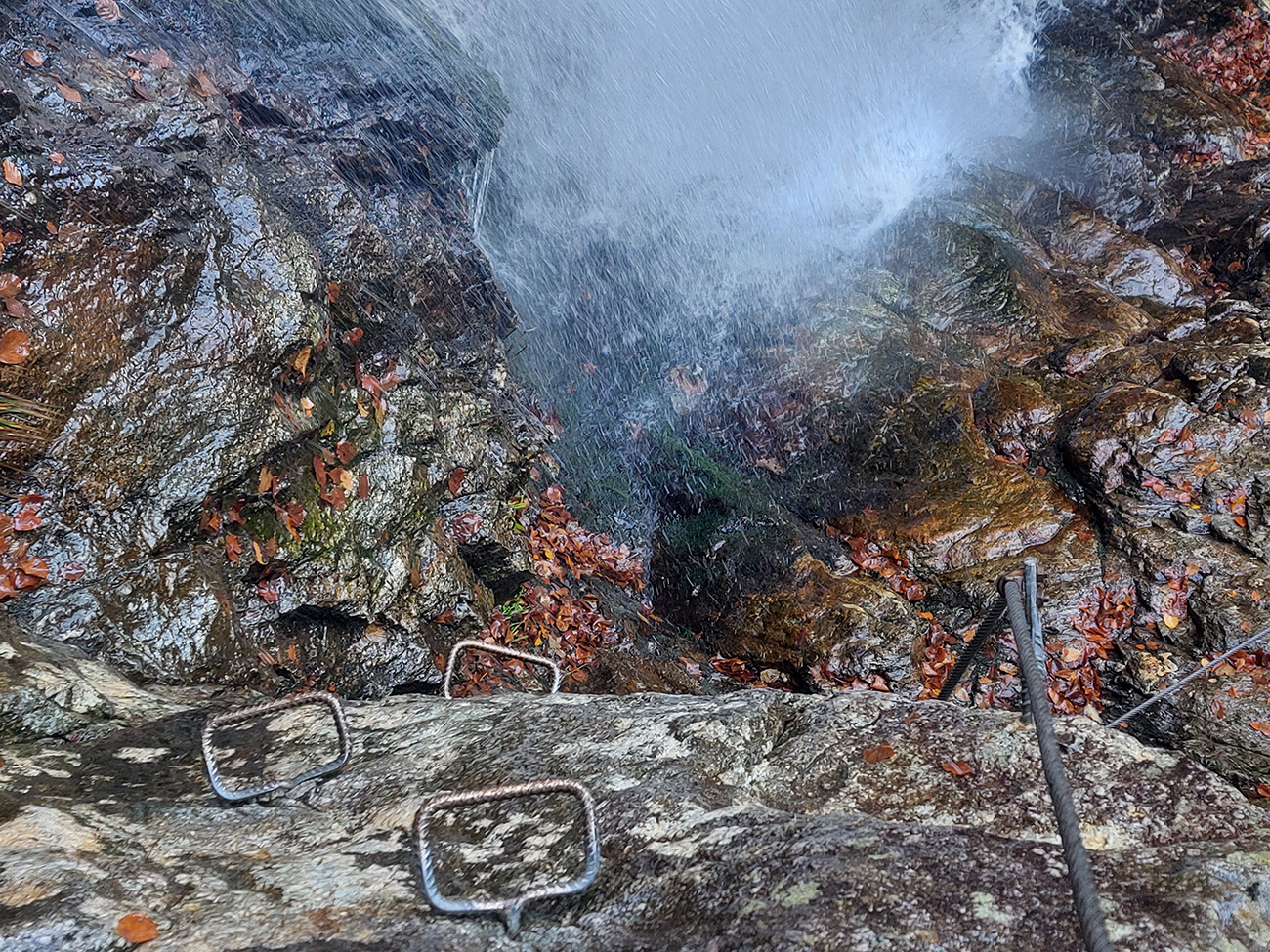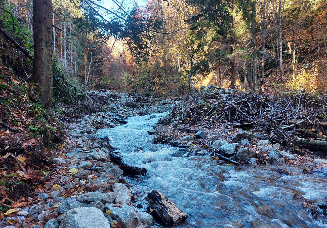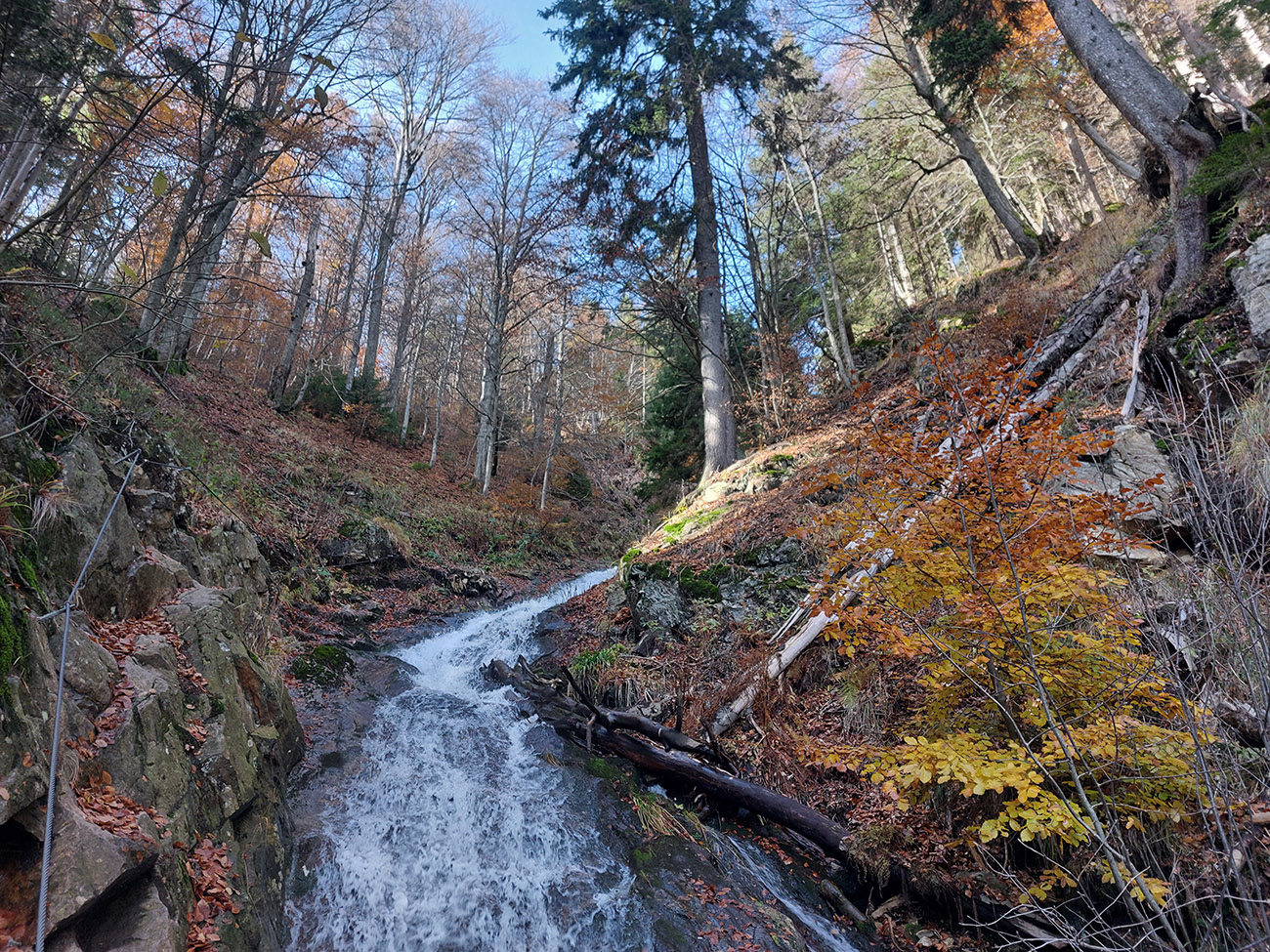 Po silných búrkach v polovici septembra sa Mlynskou dolinou a jej Pivovarským potokom prehnala blesková povodeň a trochu to tam „upratala“. Potok si na pár miestach preložil koryto, najmä v spodnej časti červeno značeného chodníka, hneď nad chatami. Aj parkovisko trochu „upravil“ a pobabral pár kusov vybavenia ferraty. Bežala zbierka na Donio.sk a jesennú sezónnu uzáveru využili dobrovoľníci na pár nevyhnutných opráv a aj úprav chodníka. Potom už jelene doručali, tak od 1.11. je ferrata otvorená znovu, je komfortne priechodná v celej dĺžke: niečo vyše štyroch kilometrov a 750 výškových metrov. Viac údajov škoda dávať, všetko je na STRÁNKE ferraty, a aj tak to tam už všetci poznajú :-) Jesenné usmoklené počasie sa ale pred dušičkovým víkendom konečne umúdrilo a nechalo prírode naplno sa vyfarbiť, no nechoď tam...