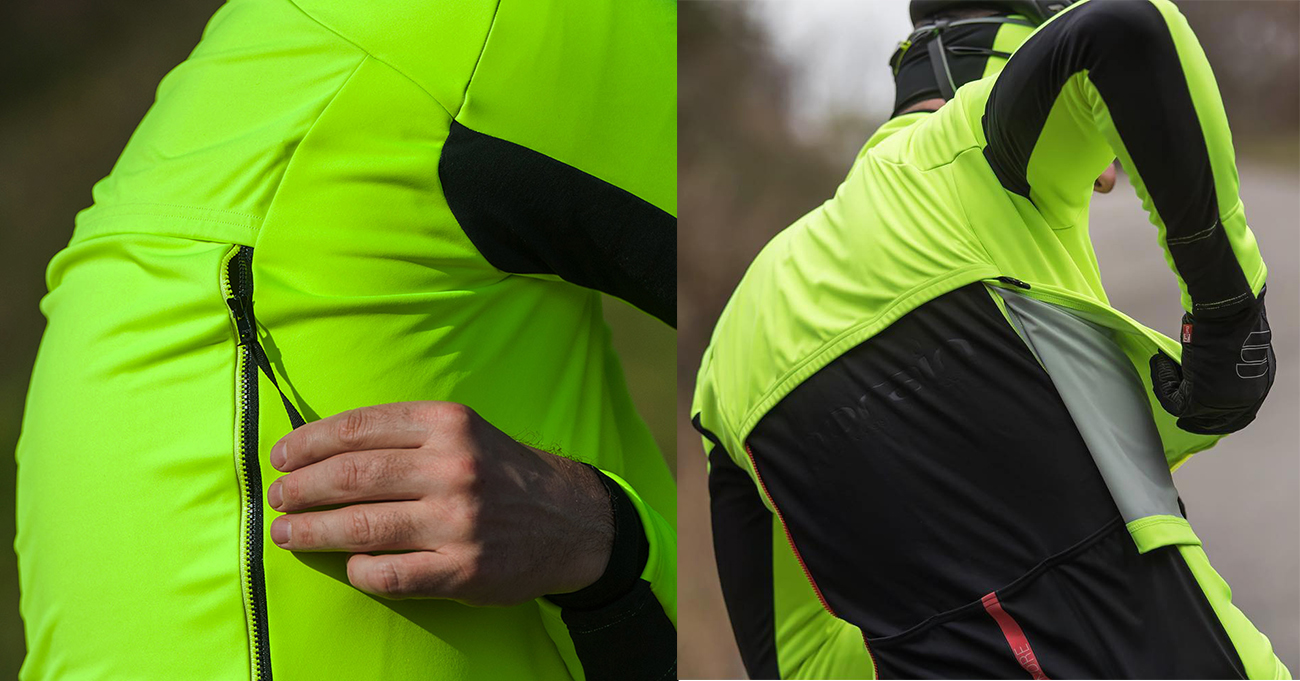 Spomínanému výbornému odvetrávaniu pomáha zadná strana rukávov a spodné dve tretiny chrbta z materiálu NoRain. To je zas tradičná a roky vylepšovaná špecialitka priamo od výrobcu Sportful – podľa ich vlastnej stránky „hrejivá, pružná a priedušná tkanina ThermoDrytex Plus, ktorá je pomocou nanotechnológie upravená tak, aby čo najrýchlejšie odvádzala vodu z povrchu a zabraňovala jej nasiakavaniu“. Až som sa divil, ako sa odvetrávanie zlepšilo, keď som dal preč ten zadný panel. Aj pod ním sú ale všetky tri vrecká relatívne dobre dostupné, presahuje ich len o máličko. Pravý zips ostáva na bunde (treba ho vytiahnuť a skryť hore, aby neplápolal), ľavý ostane na paneli. Ale za jazdy a navyše v rukaviciach toto na fotkách radšej neskúšajte:
