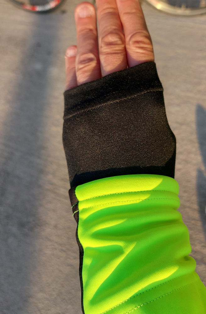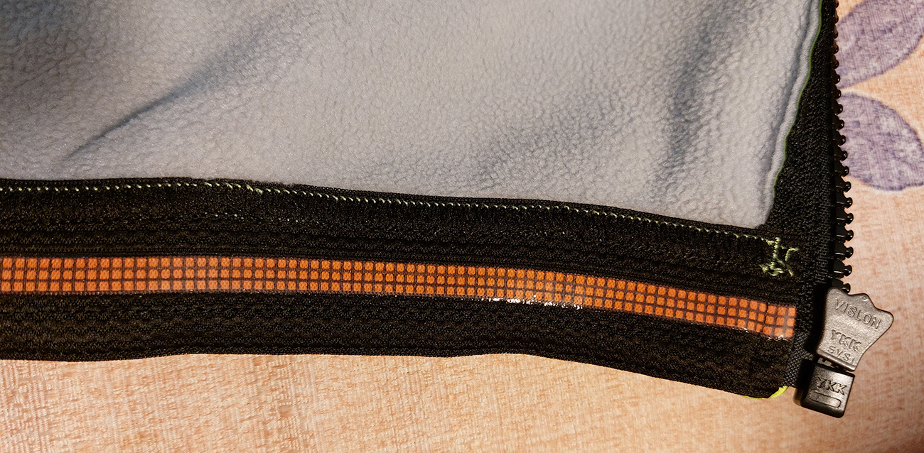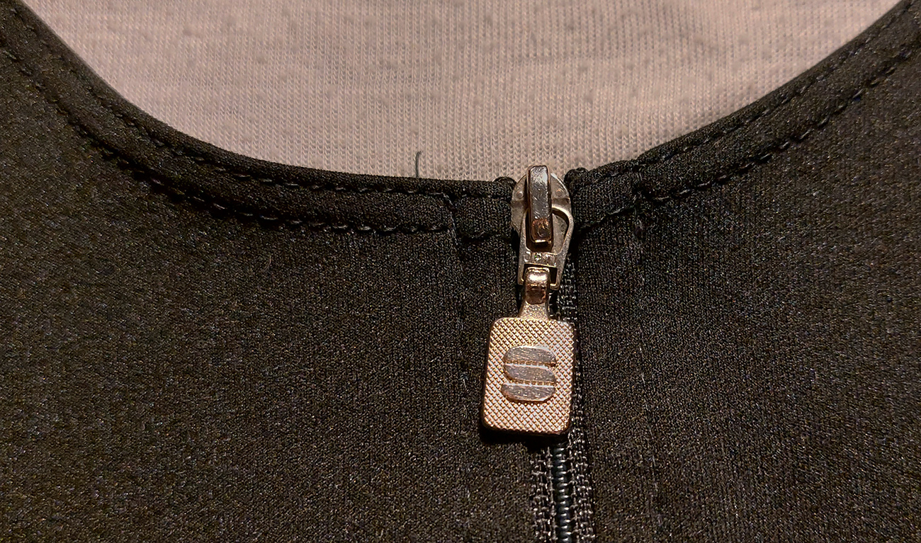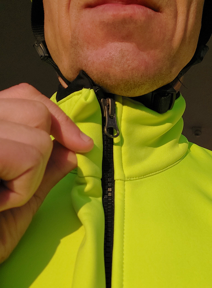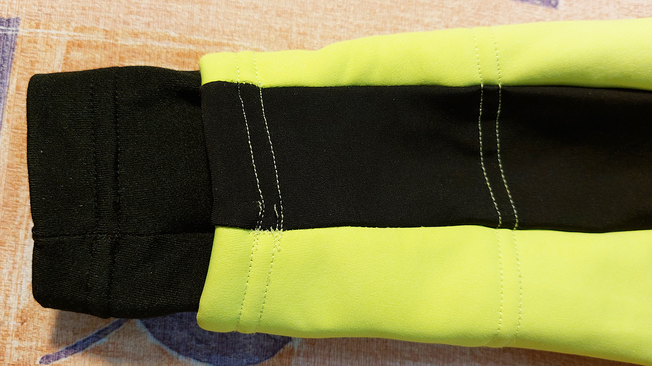 Že je to bunda špeciálne cyklistická, to sa pozná pri jej oblečení. Pri vzpriamenom postoji ma totiž jemne „ťahá“ pod pazuchami, ale akonáhle sa skloním na riadidlá, sedí ako uliata, divný pocit je preč. Klasika sú tri vrecká vzadu, dobre padnúci stojáčik (pracka prilby mu nevadí) a pružný silikónový lem na páse. Zips YKK nie je hore „zagarážovaný“, ale krytý po celej dĺžke. Zipsy odnímateľnej „strechy“ sú úplne skryté hore pod prekrývajúcou časťou horného chrbtového panelu, takže ma za jazdy neplieskajú po chrbte. Špecifické (aj keď možno zbytočne dlhé) sú dvojité manžety, pod ktoré vietor nemá šancu preniknúť. Na zimáku (a vôbec) nosím len hodinky, tak ich riešim takto: