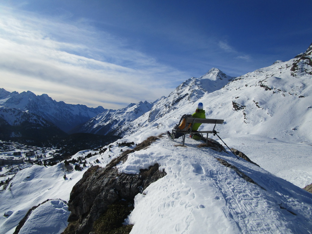 Zlyžujeme k skupinke domov s názvom Buaira a znovu nalepíme pásy. Celý čas šlapeme na slnku, o výhľady nie je núdza. Tentoraz sa zastavíme pri chatke v smere výstupu na Piz Grevasalvas. Parádny výhľad na jazerá Horného Engadinu. Využijeme posedenie pred chatkou...